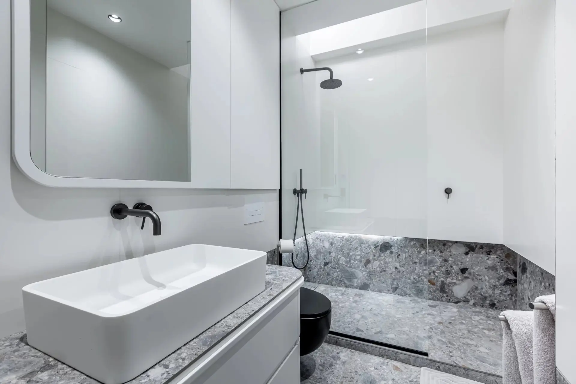 Het appartement is volledig afgewerkt in Italiaans marmer en voorzien van centrale airconditioning en vloerverwarming.