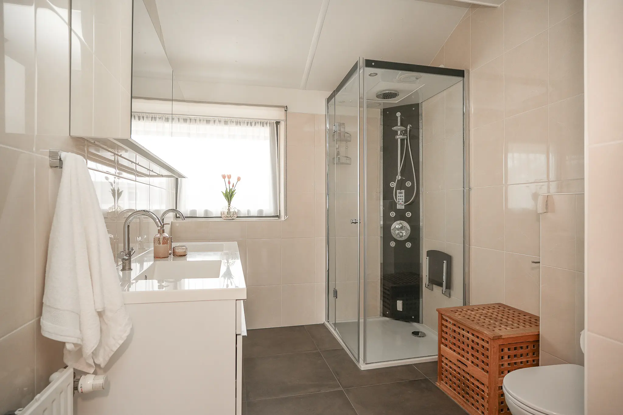 Three generous bedrooms and a modern, fully equipped bathroom make this floor perfect for families. The largest bedroom is bright and spacious, featuring a large built?in wardrobe. The bathroom is fitted with a shower, double washbasin, and a second toilet. Everything is neatly finished and ready to move into.