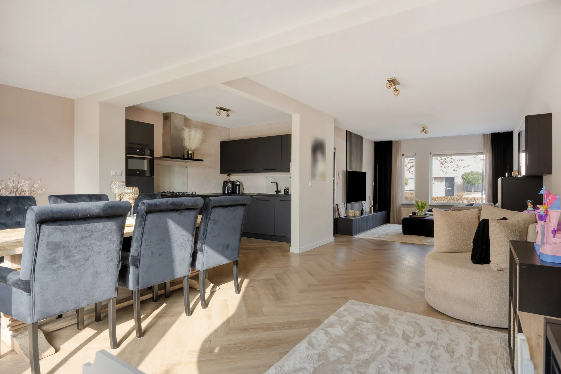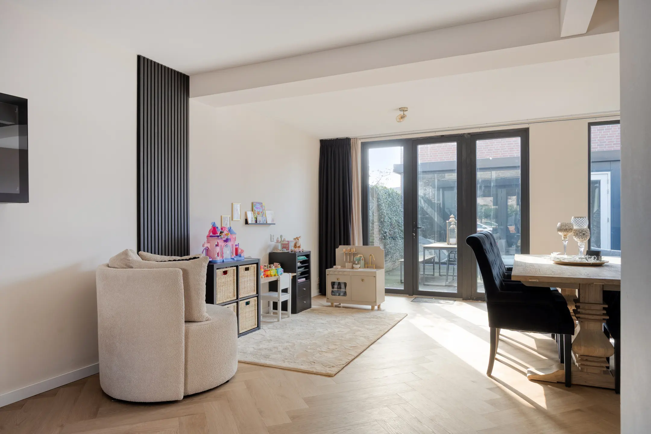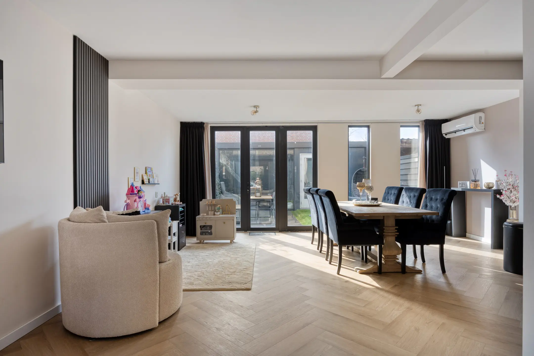 De uitgebouwde woonkamer vormt het hart van de woning. Dankzij de openslaande tuindeuren komt er veel licht binnen en loop je op mooie dagen zo de tuin in. De pvc visgraadvloer geeft direct sfeer en past goed bij de moderne afwerking van het huis. De keuken uit 2020 sluit hier mooi op aan en biedt alles wat je nodig hebt voor dagelijks koken. De aanwezige airco zorgt daarbij voor extra comfort tijdens warme dagen.