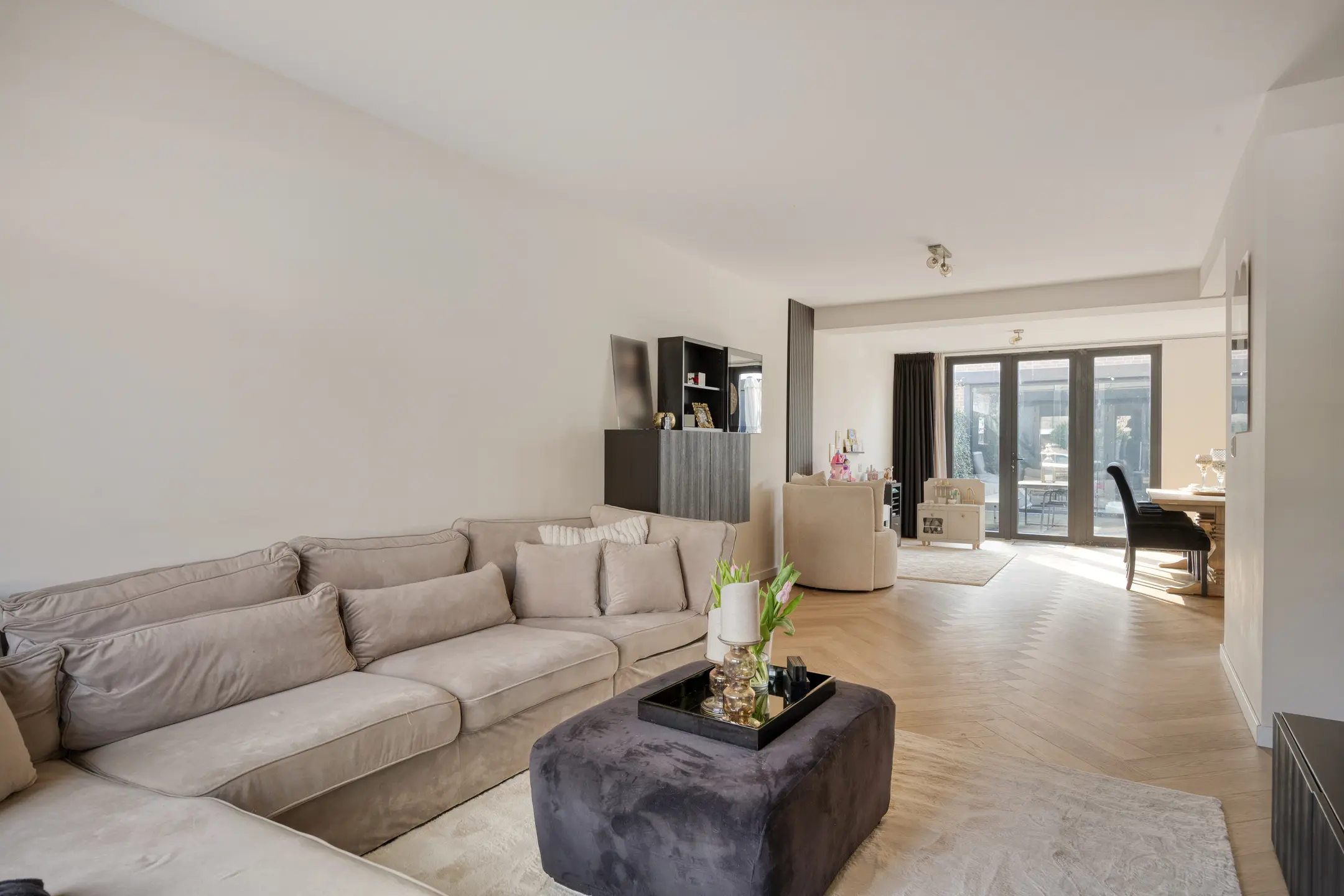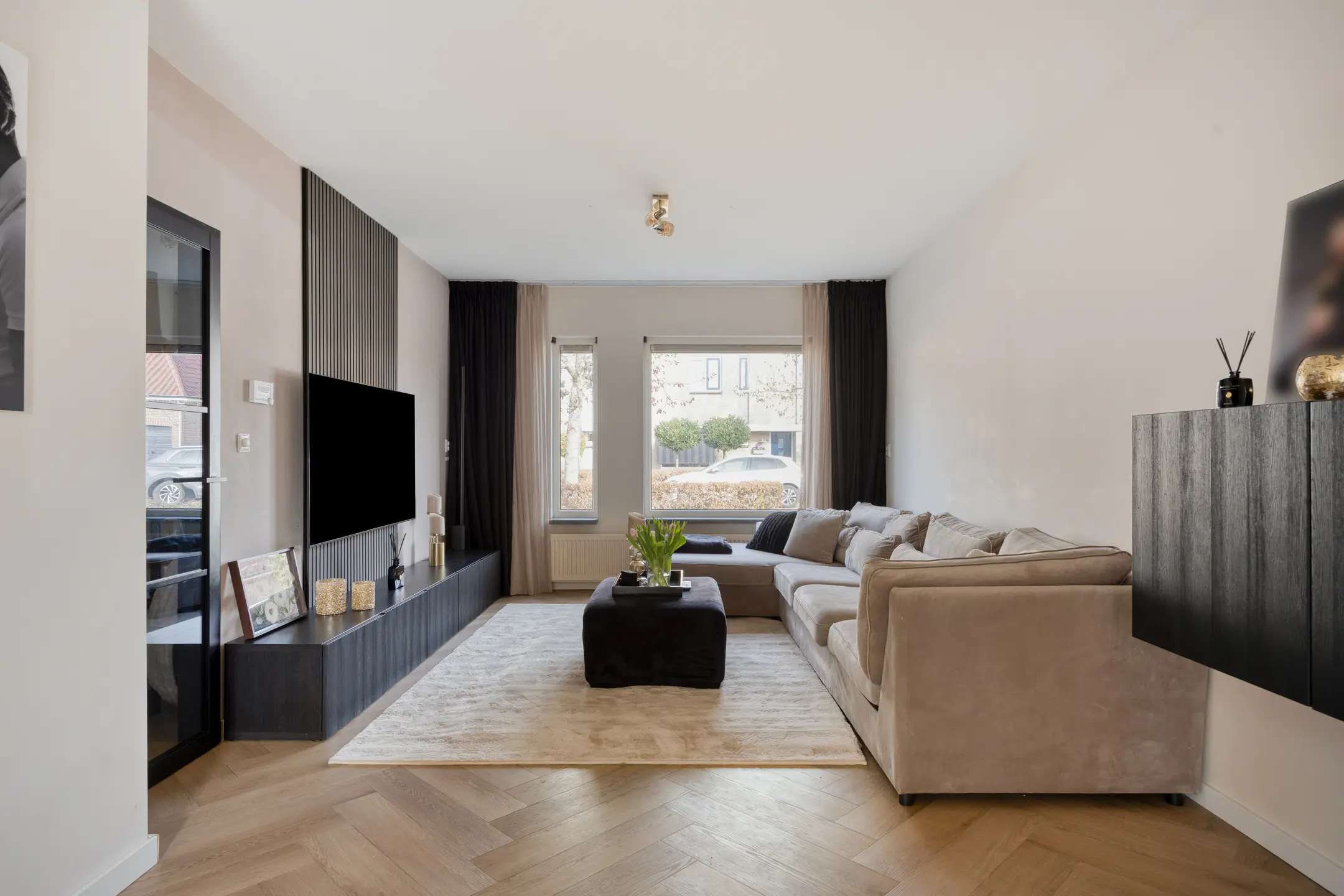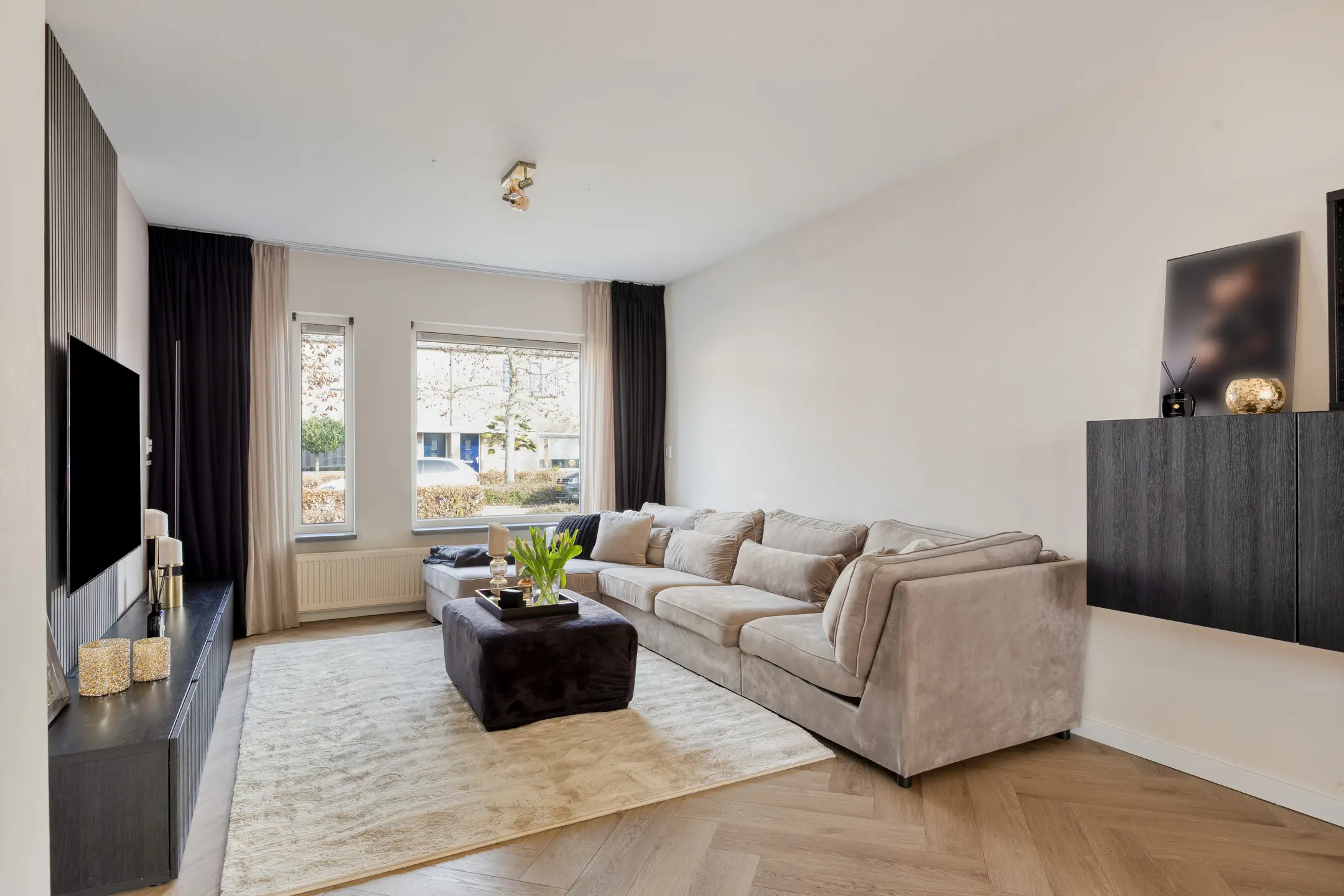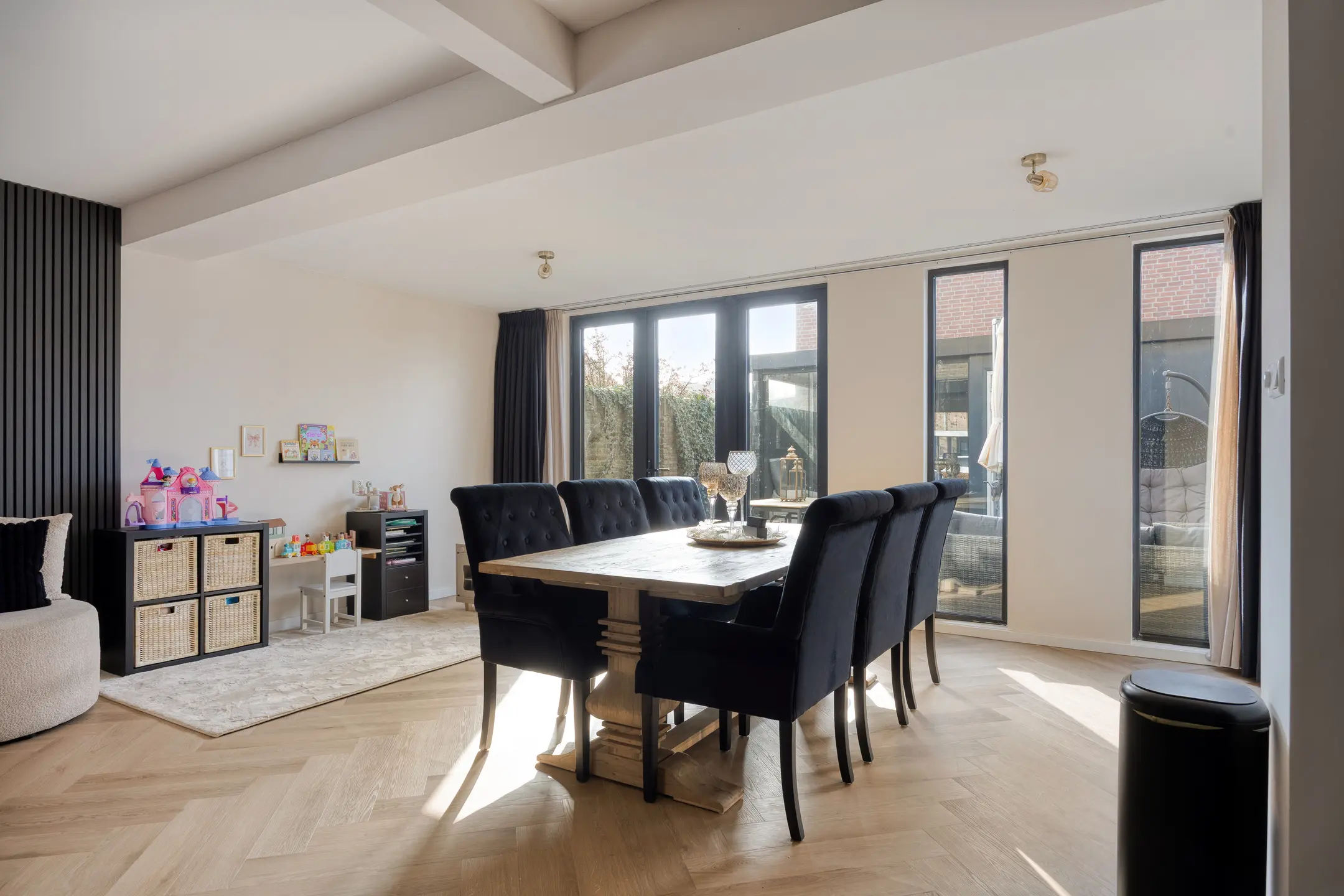 De uitgebouwde woonkamer vormt het hart van de woning. Dankzij de openslaande tuindeuren komt er veel licht binnen en loop je op mooie dagen zo de tuin in. De pvc visgraadvloer geeft direct sfeer en past goed bij de moderne afwerking van het huis. De keuken uit 2020 sluit hier mooi op aan en biedt alles wat je nodig hebt voor dagelijks koken. De aanwezige airco zorgt daarbij voor extra comfort tijdens warme dagen.