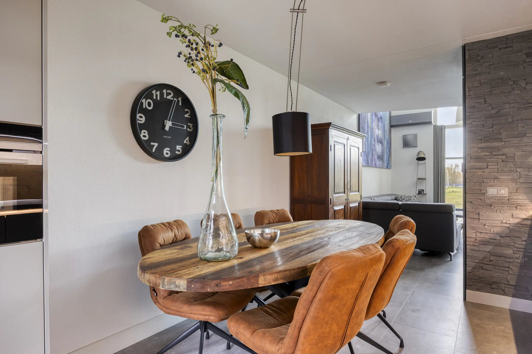 Een fraaie open houten trap brengt je naar de ruime living, waar het licht direct alle aandacht trekt. De volledig glazen achtergevel zorgt niet alleen voor een schitterend uitzicht over de Dongevallei, maar laat ook de hele verdieping baden in daglicht. De woonkamer is voorzien van een airco en heeft een vide met doorkijk naar de serre beneden – wat het gevoel van ruimte nog eens versterkt.