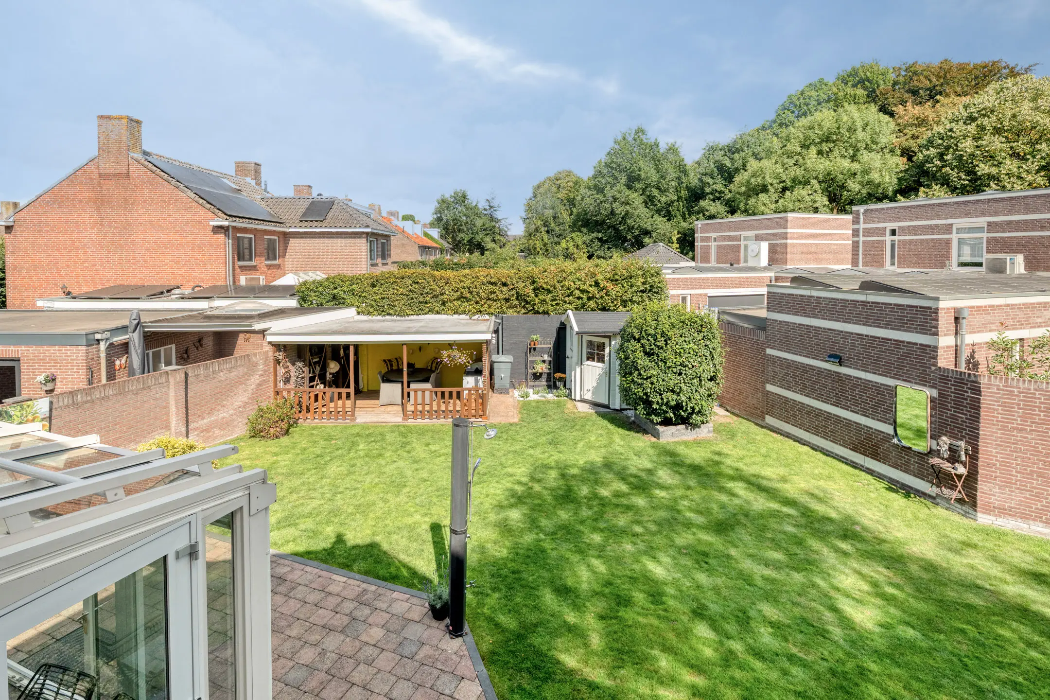 Buiten vind je een goed onderhouden tuin met zowel een achtertuin als een zijtuin. De achtertuin is voorzien van een overkapping, solardouche en een tuinhuis v.v. afzuigkap. De zijtuin is voorzien van een looppad naar de poort en een containeropstelplaats.