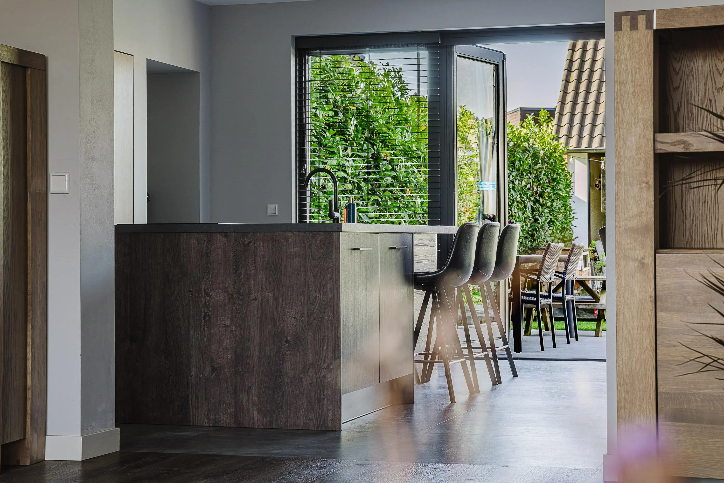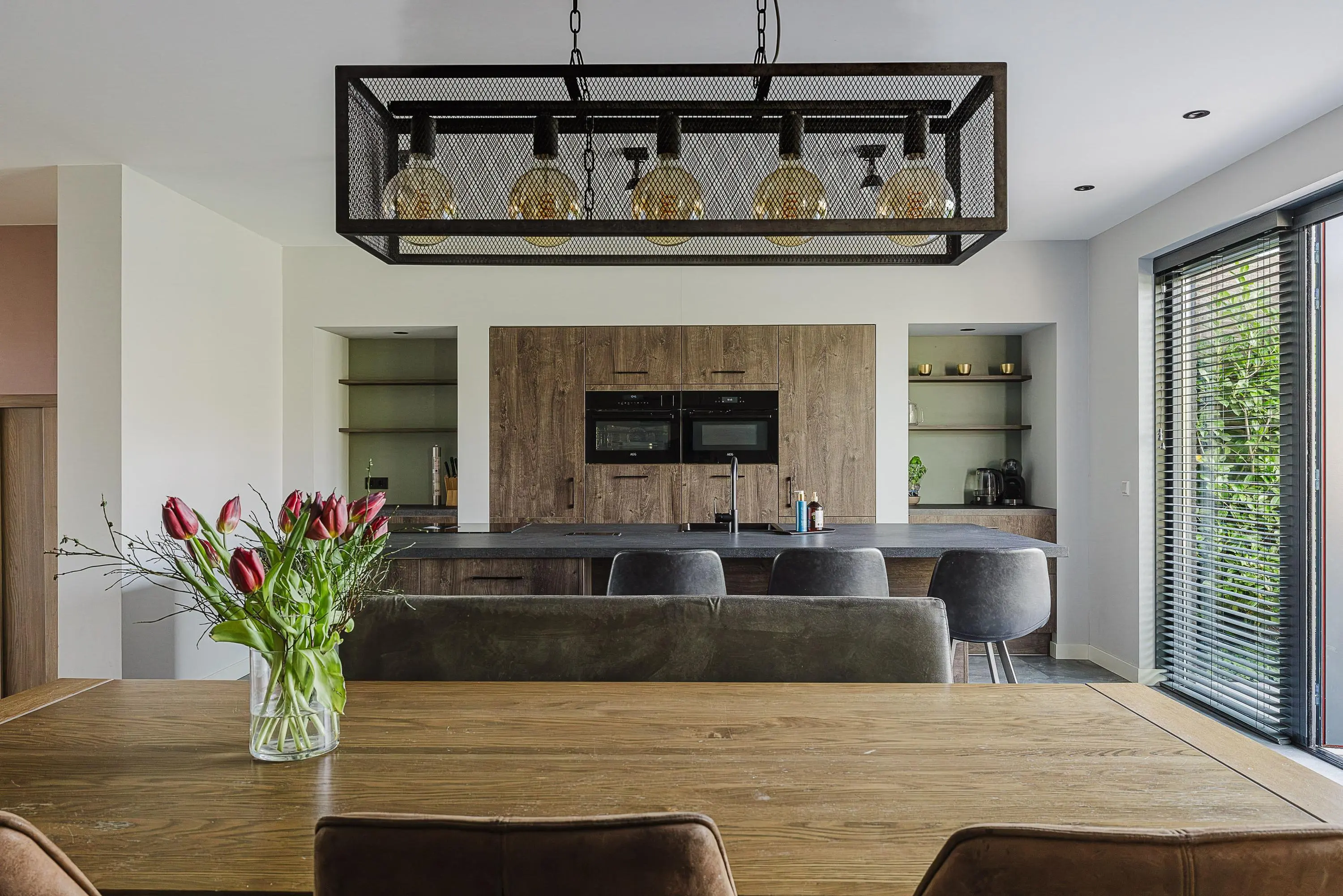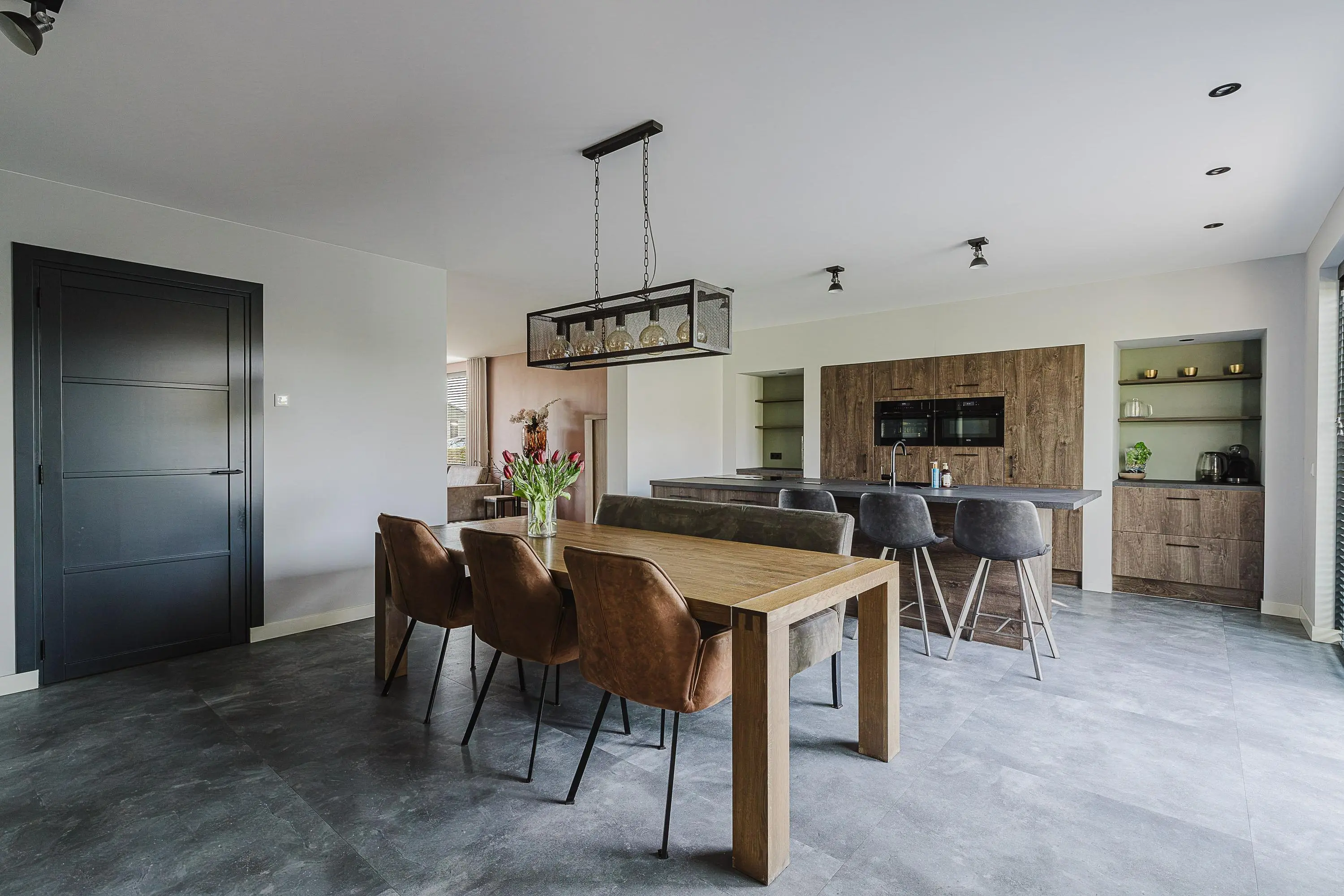 Bij binnenkomst valt direct de ruimte en het licht op. De royale leefkeuken vormt het kloppend hart van de woning en biedt met 50 m² een indrukwekkende plek waar koken, leven en samenkomen centraal staan. De grote raampartijen en openslaande deuren zorgen voor een prettige lichtinval en een directe verbinding met de tuin.