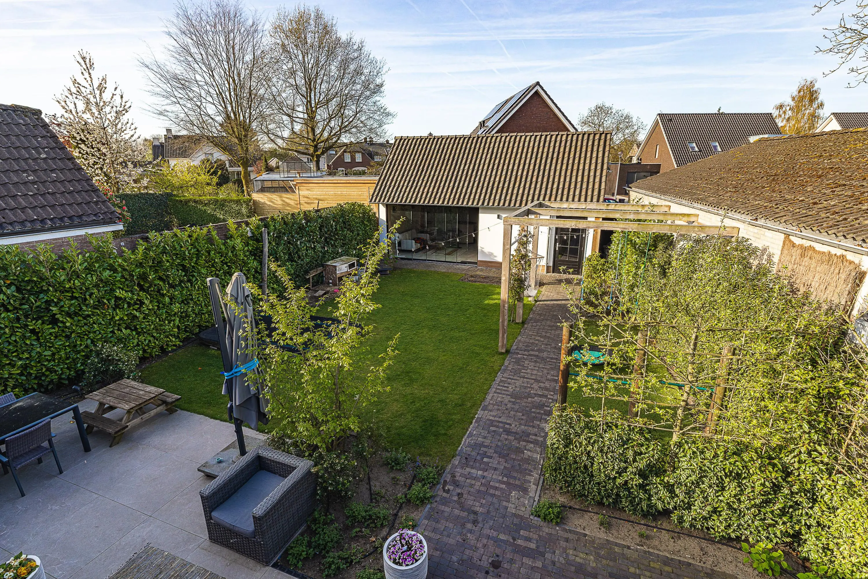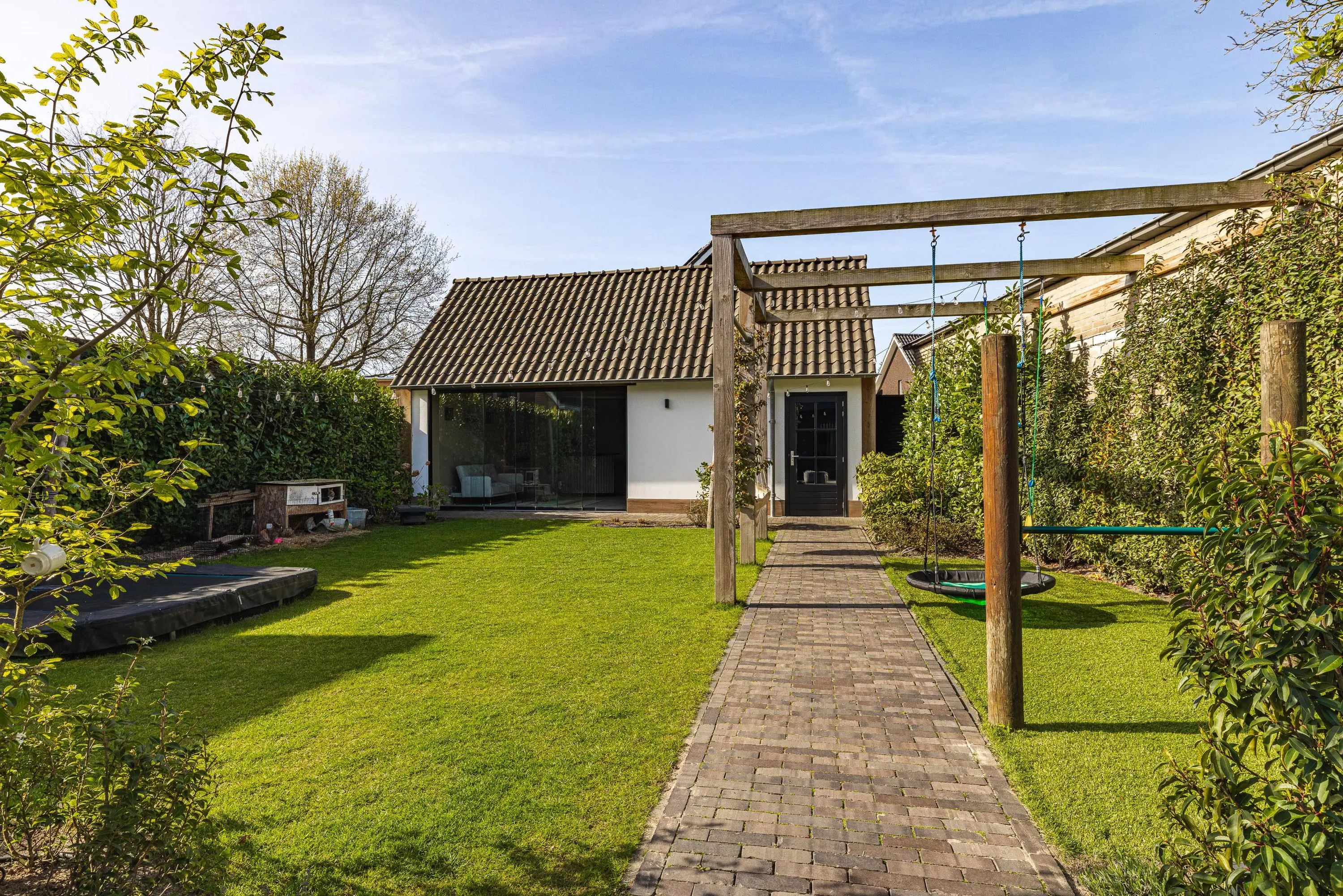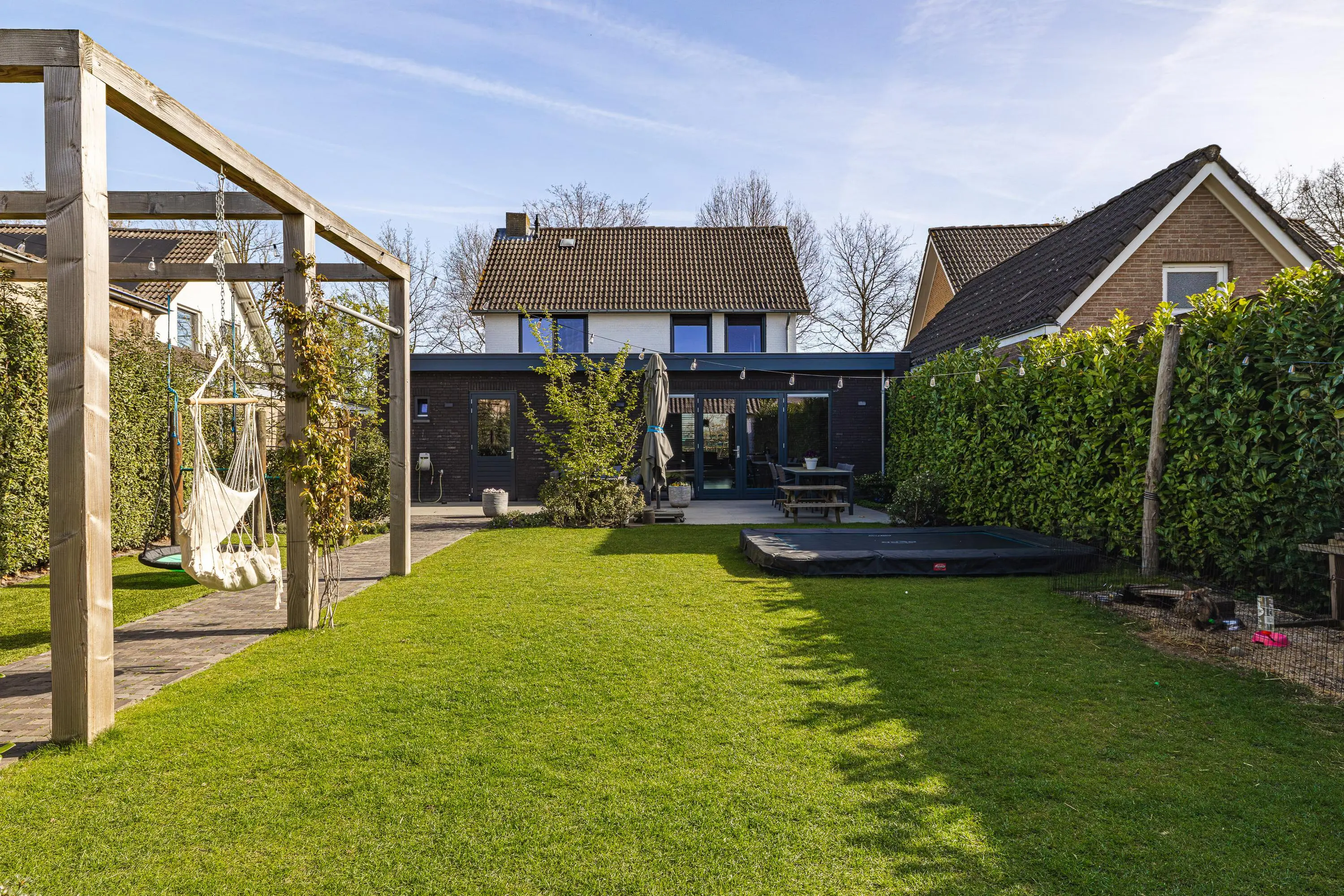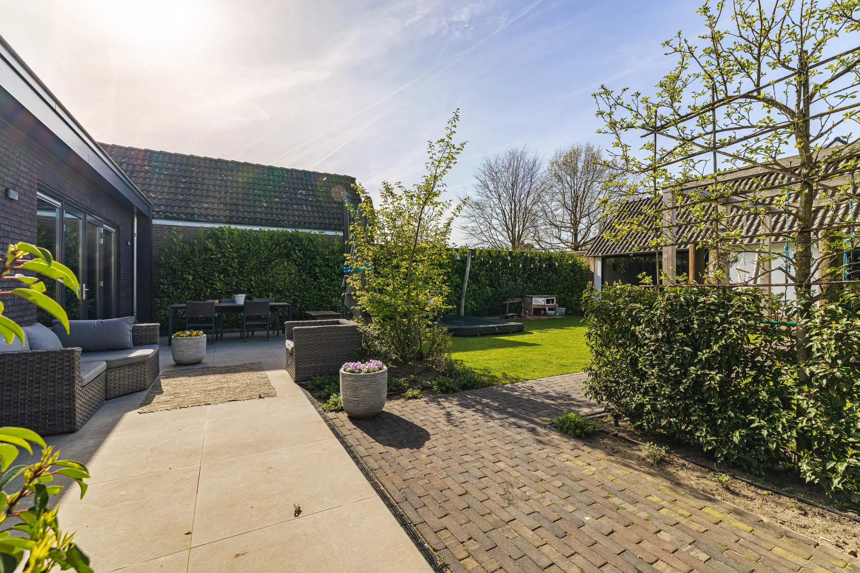 De tuin is verzorgd aangelegd en biedt een fijne combinatie van groen, privacy en gebruiksruimte – perfect voor gezinnen, ontspanning en lange zomerdagen.