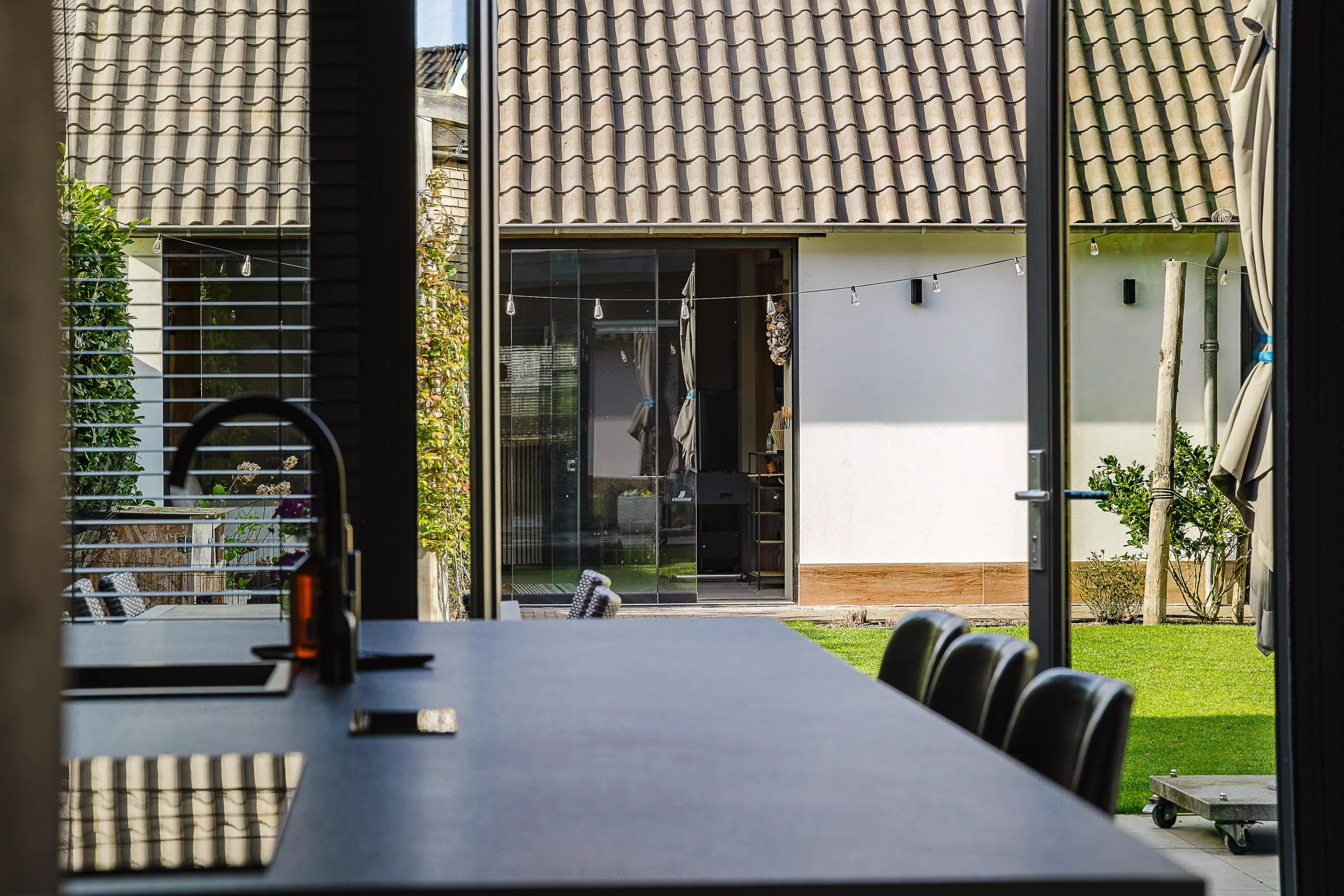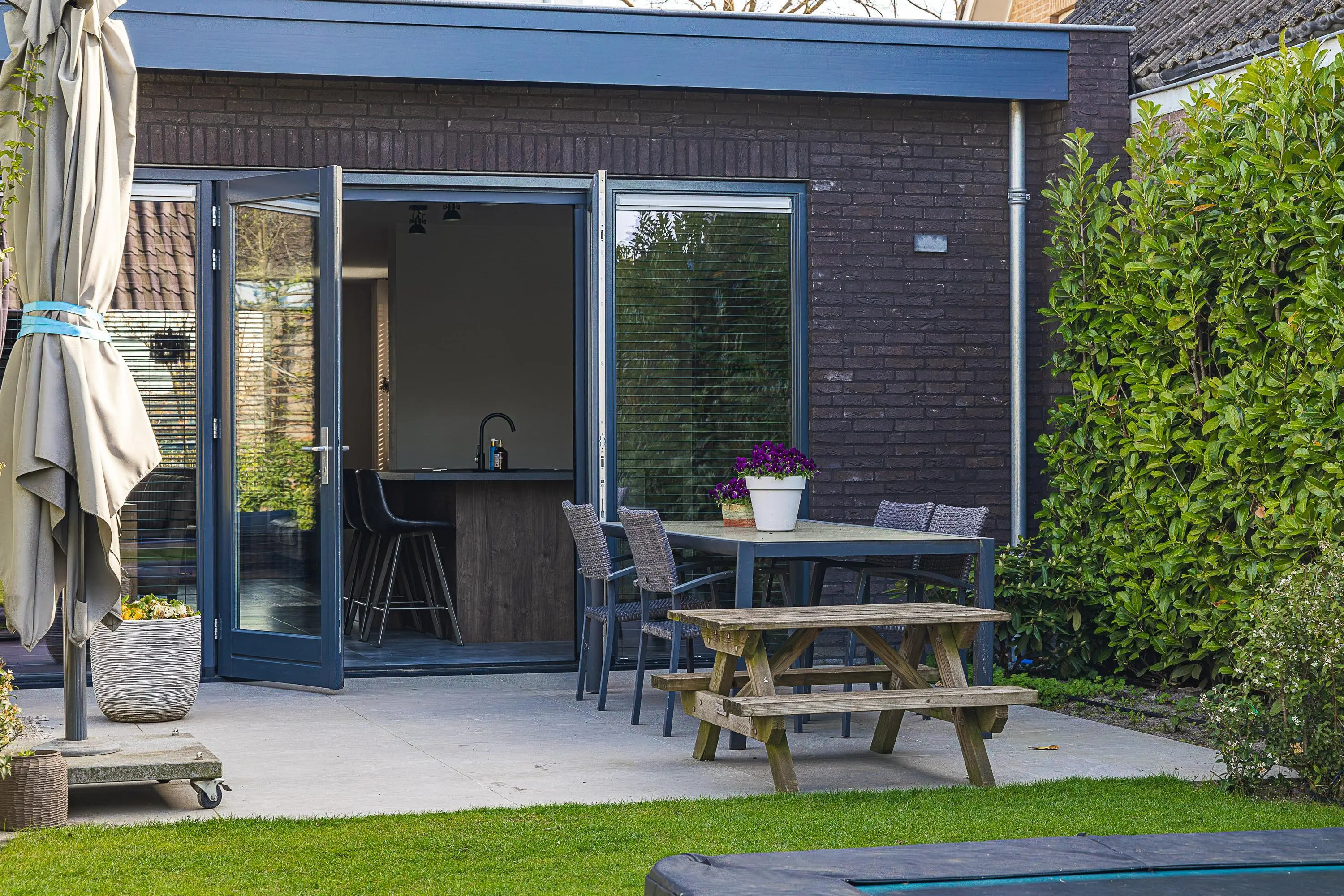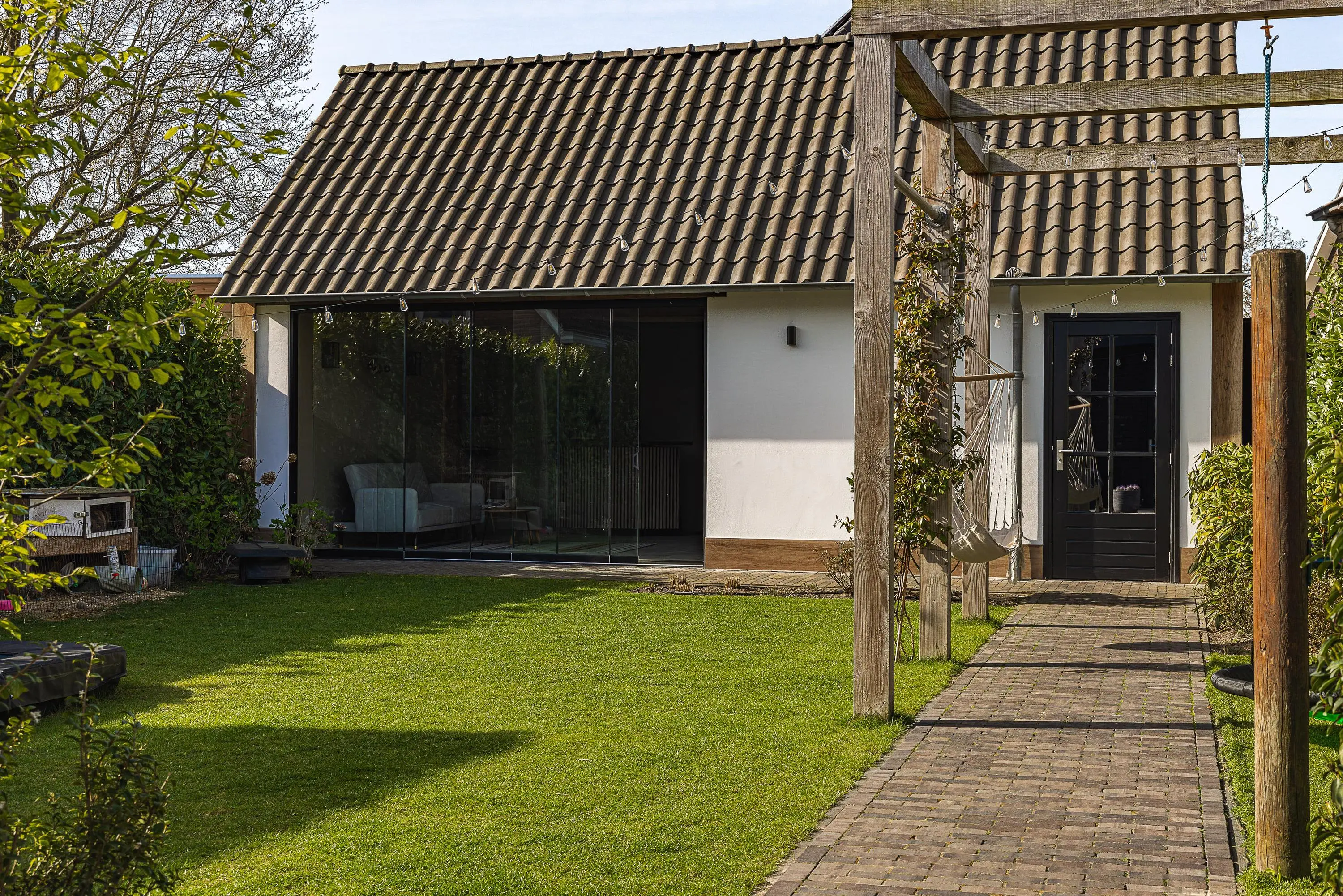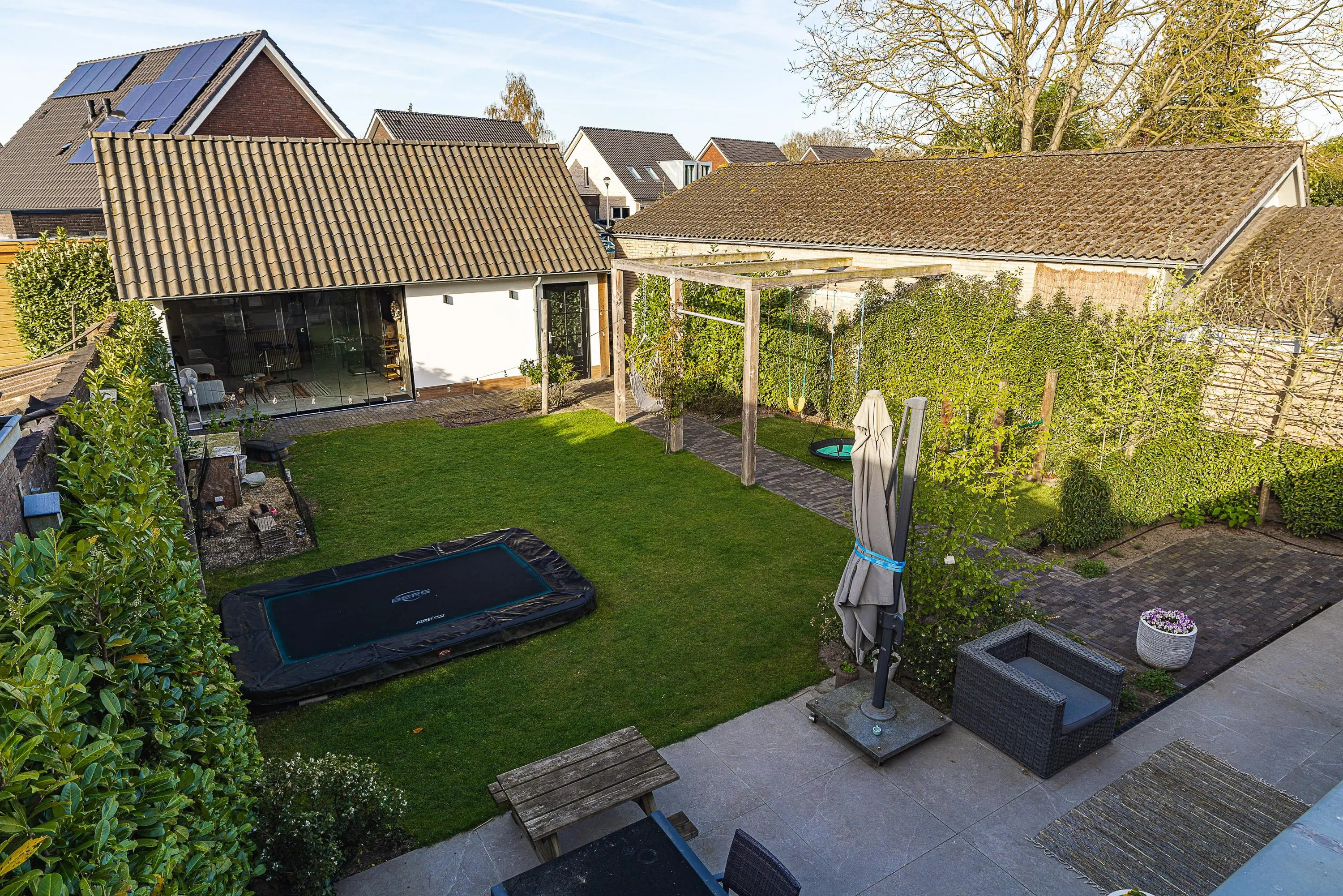De tuin is verzorgd aangelegd en biedt een fijne combinatie van groen, privacy en gebruiksruimte – perfect voor gezinnen, ontspanning en lange zomerdagen.