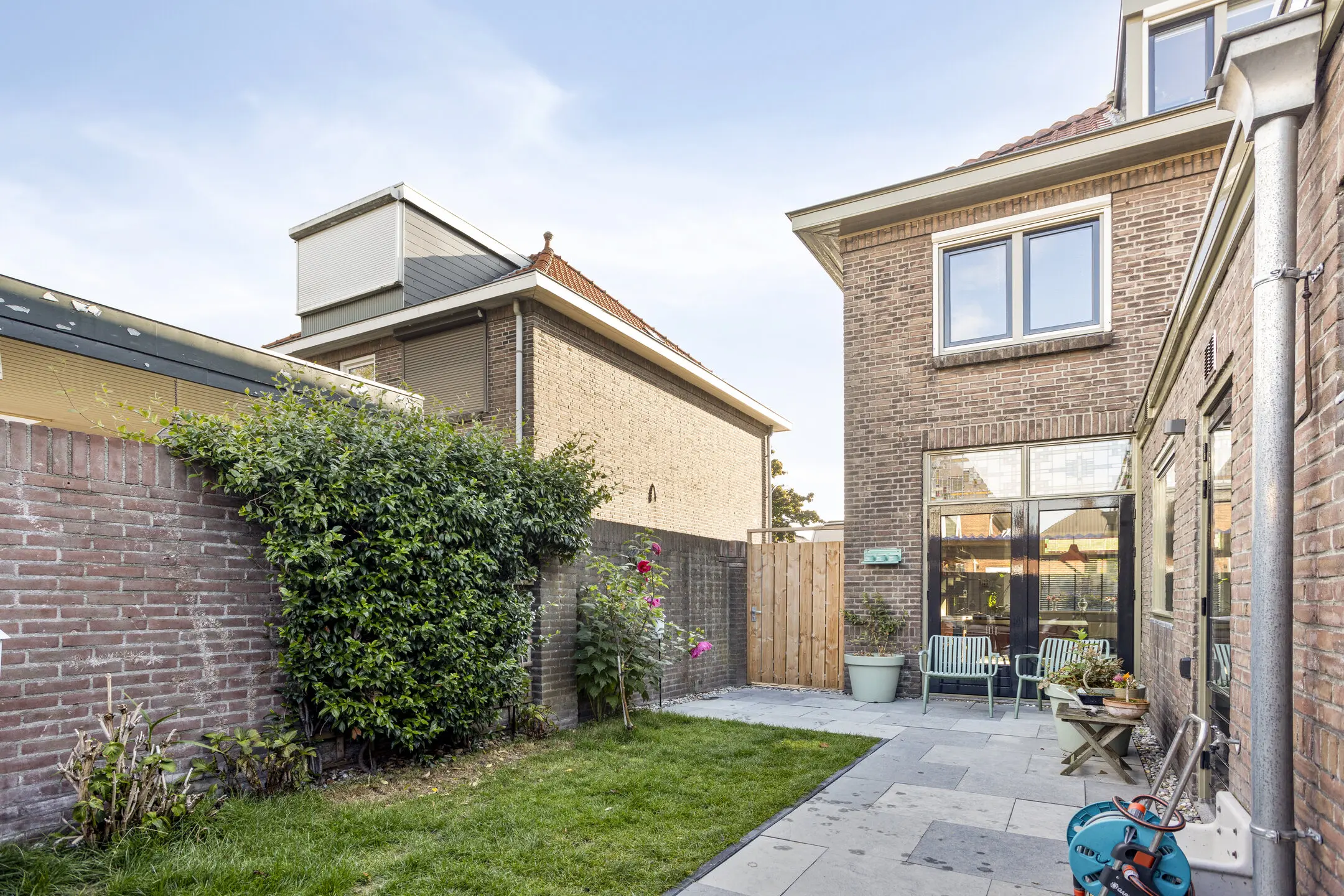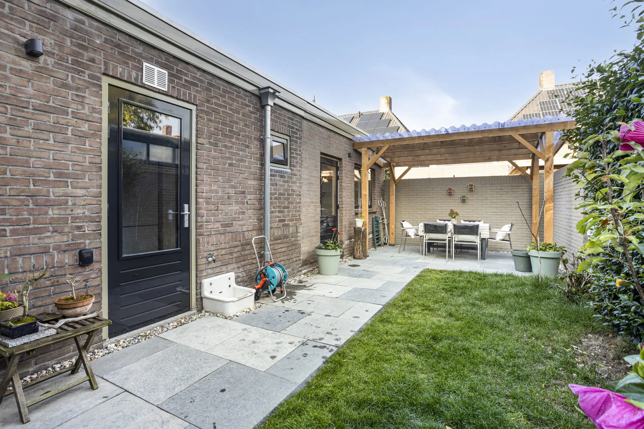 • Opfriste tuin met bestrating, poort en overkapping – gewoon lekker buiten zitten