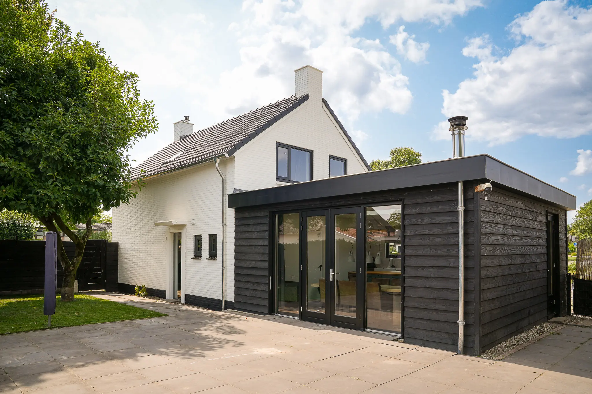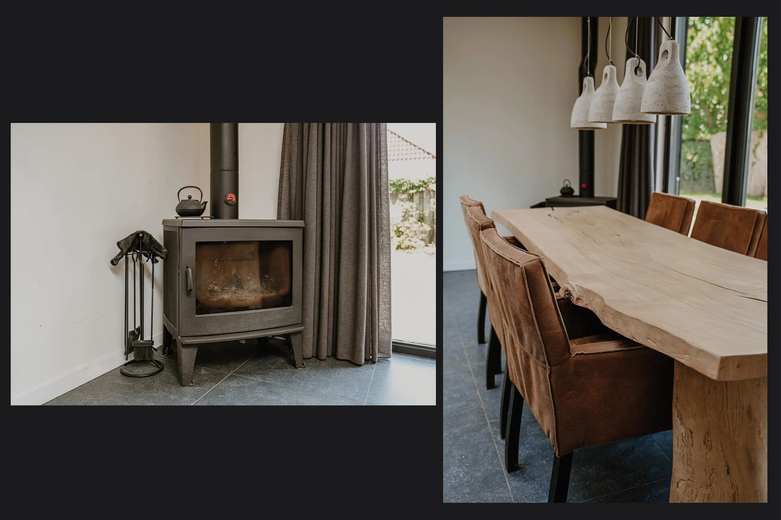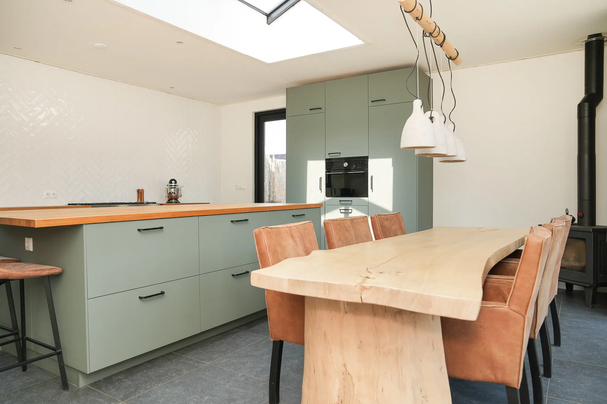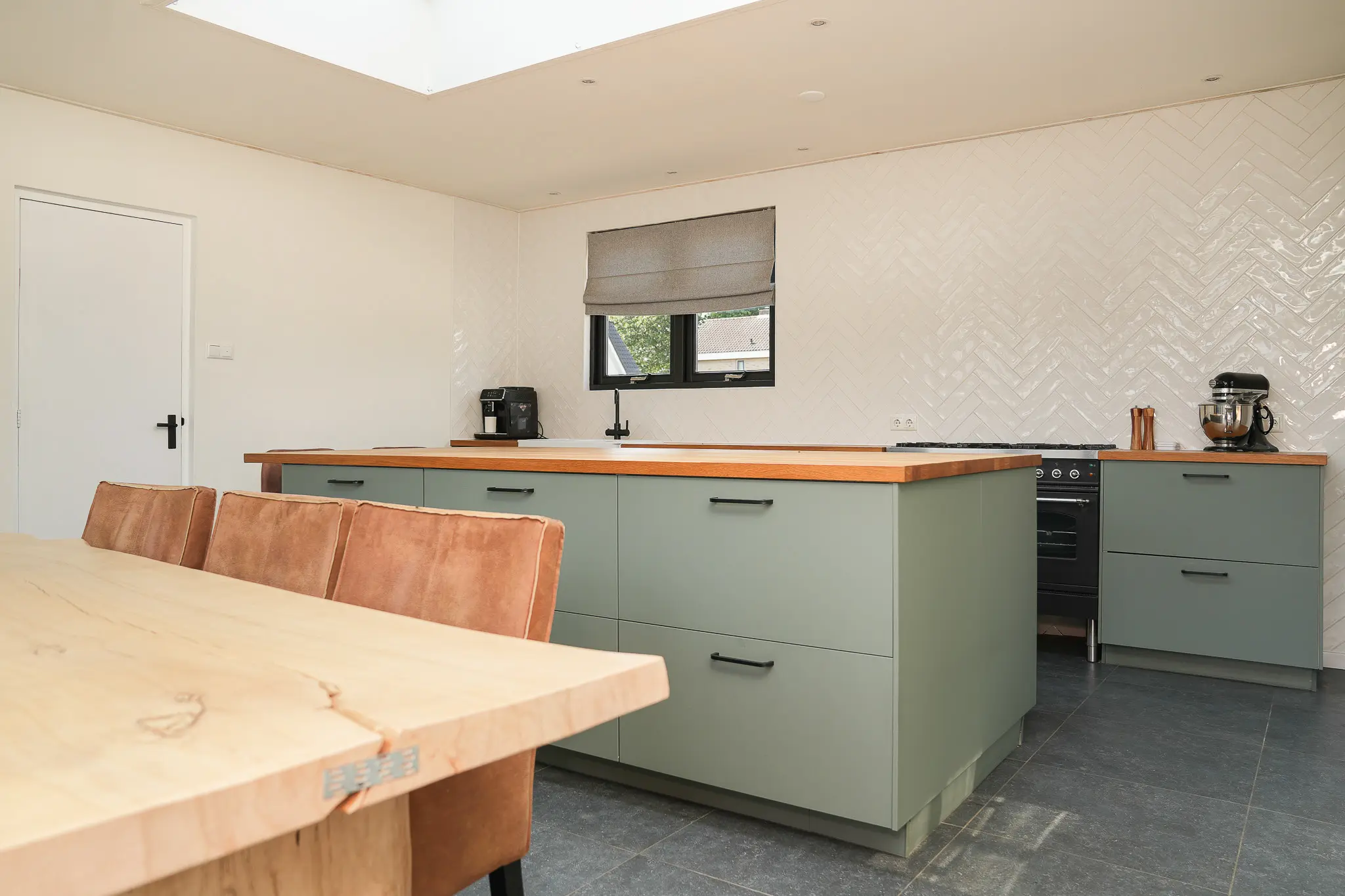 Je begint in de uitbouw aan de achterzijde – het kloppend hart van het huis. Hier ligt de open keuken met robuust keukeneiland, boretti gasfornuis, combi-oven, grote koelkast, grote vriezer en vaatwasser. De dubbel openslaande tuindeuren brengen het buitenleven naar binnen en verbinden koken, tafelen en genieten in de tuin tot één geheel.