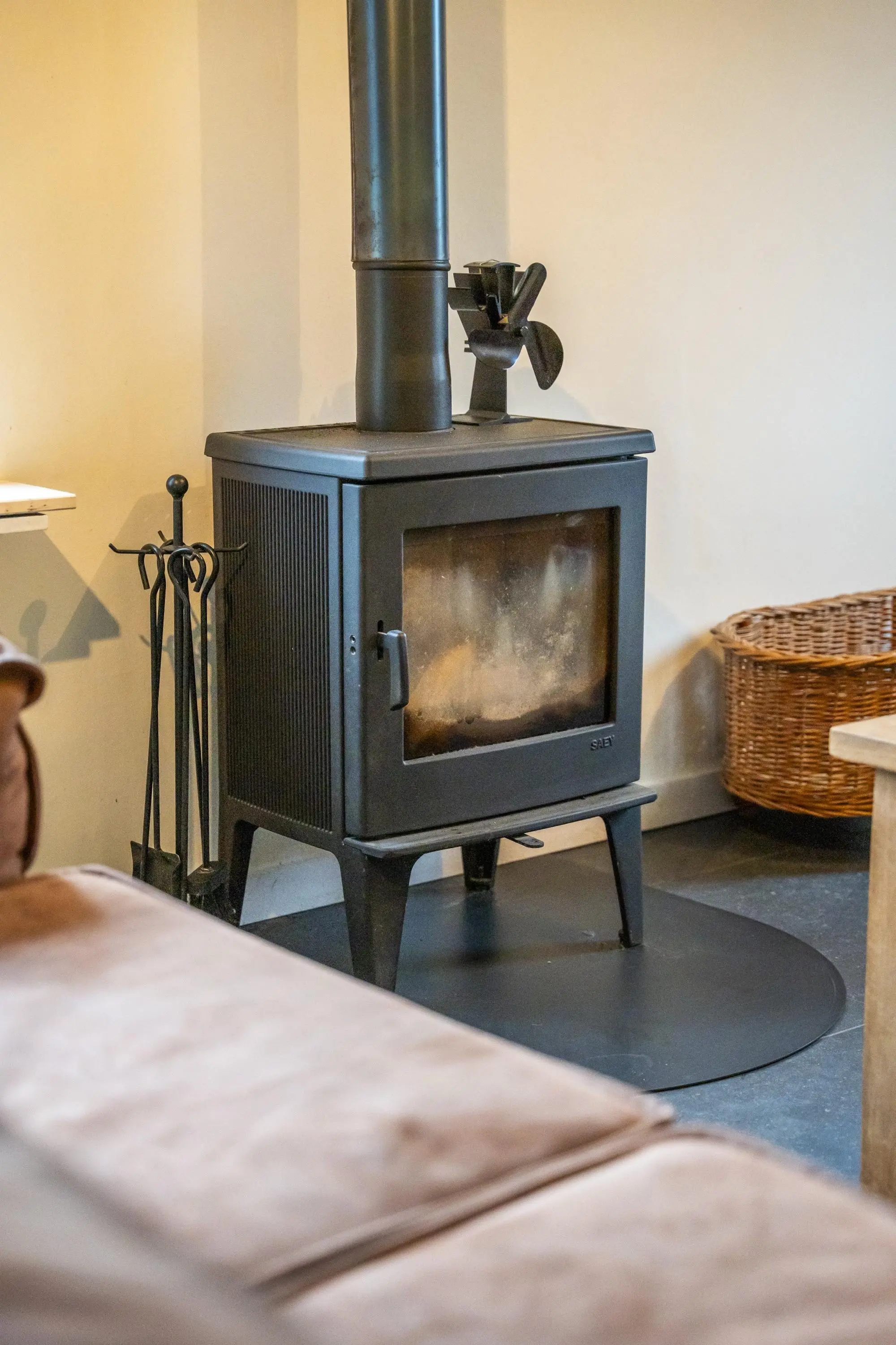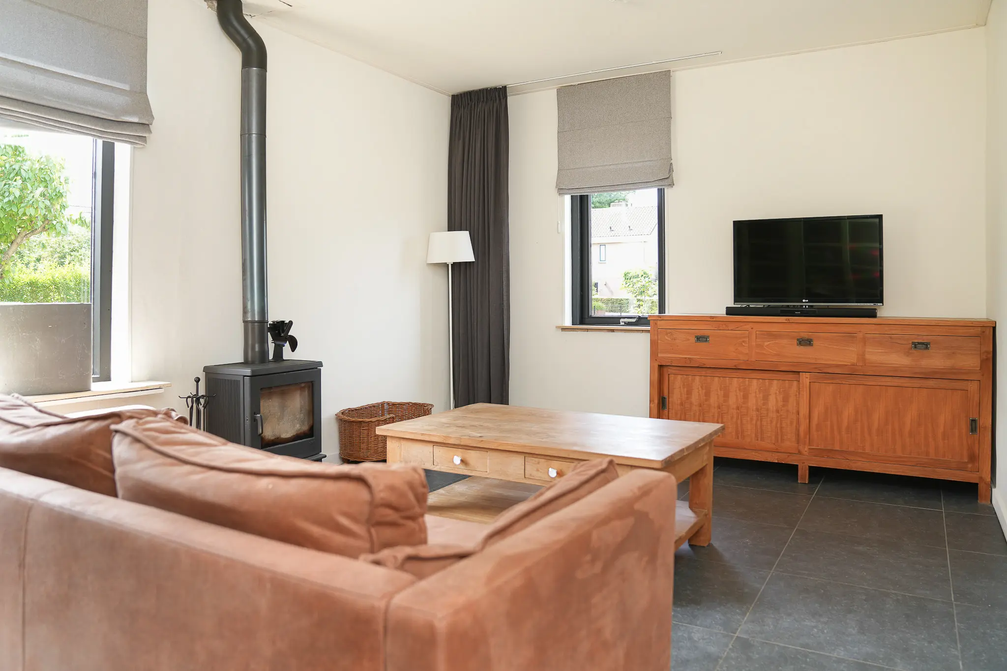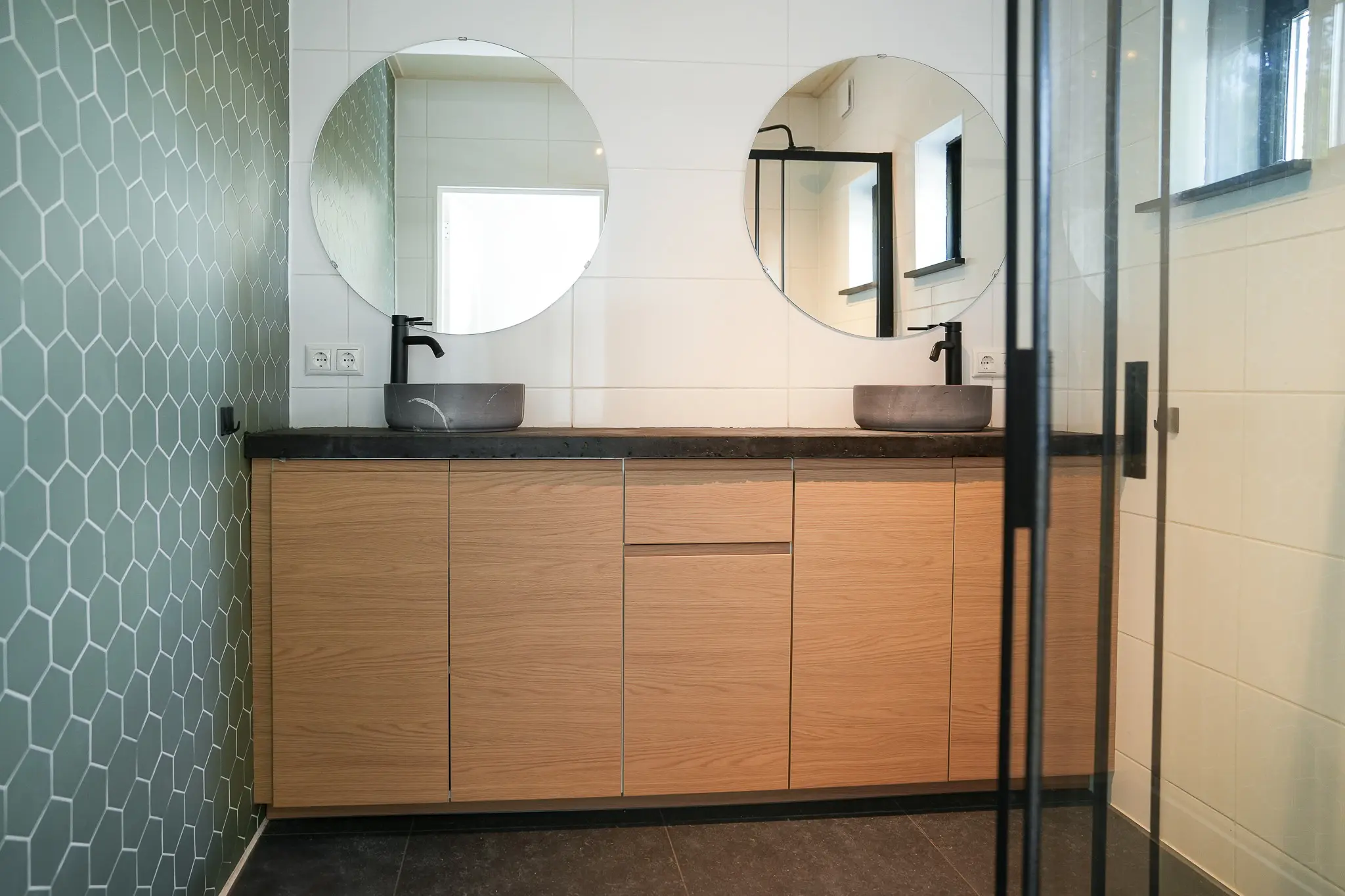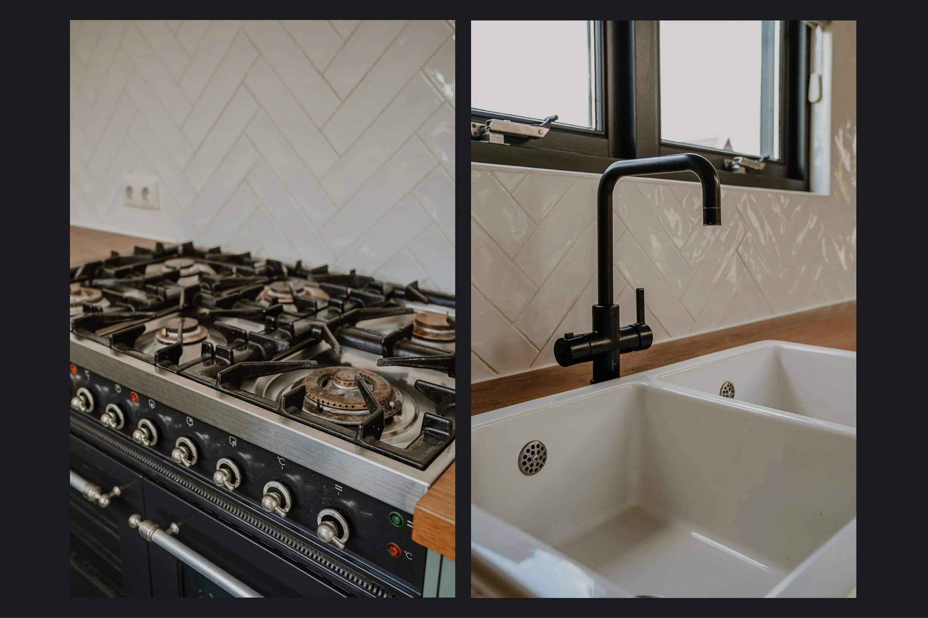 Je begint in de uitbouw aan de achterzijde – het kloppend hart van het huis. Hier ligt de open keuken met robuust keukeneiland, boretti gasfornuis, combi-oven, grote koelkast, grote vriezer en vaatwasser. De dubbel openslaande tuindeuren brengen het buitenleven naar binnen en verbinden koken, tafelen en genieten in de tuin tot één geheel.