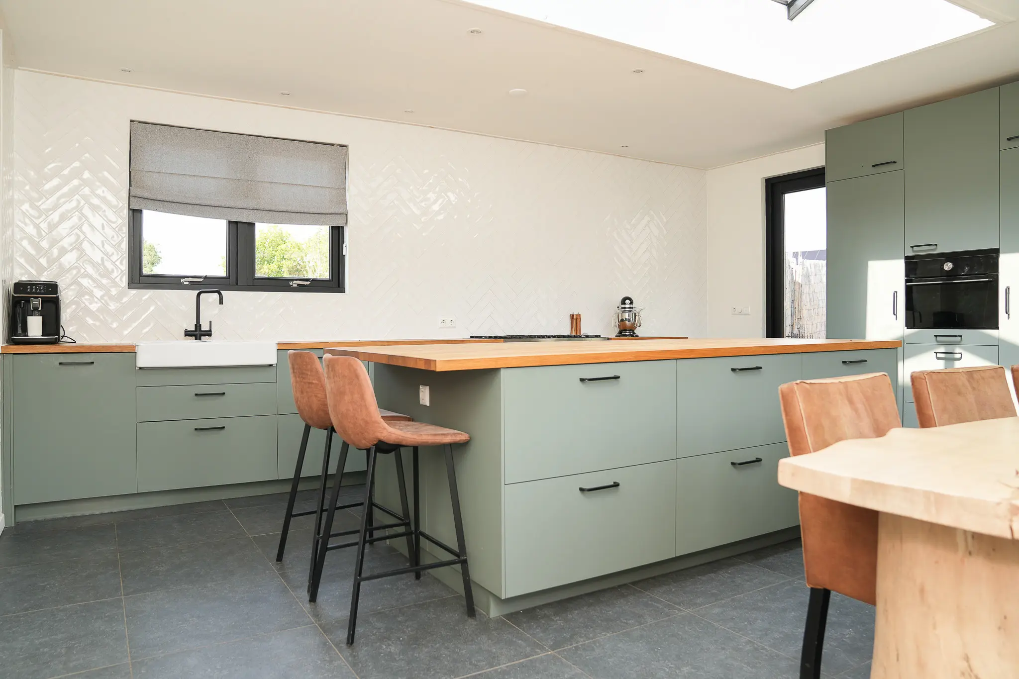 Je begint in de uitbouw aan de achterzijde – het kloppend hart van het huis. Hier ligt de nieuwe open keuken met robuust keukeneiland, boretti gasfornuis, combi-oven, grote koelkast, grote vriezer en vaatwasser. De lichtstraat en de dubbel openslaande tuindeuren brengen daglicht en het buitenleven naar binnen; verbinden koken, tafelen en genieten in de tuin tot één geheel.