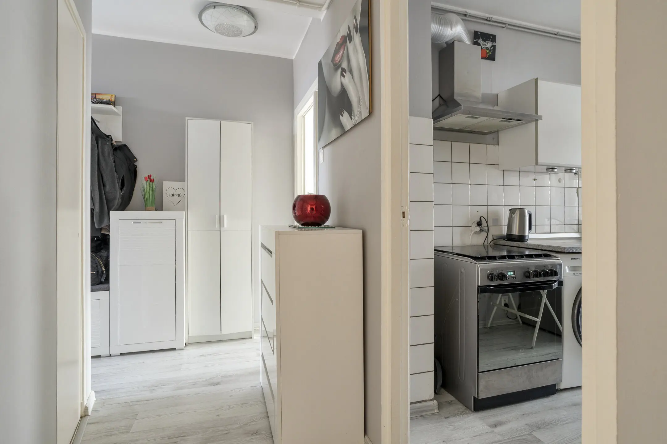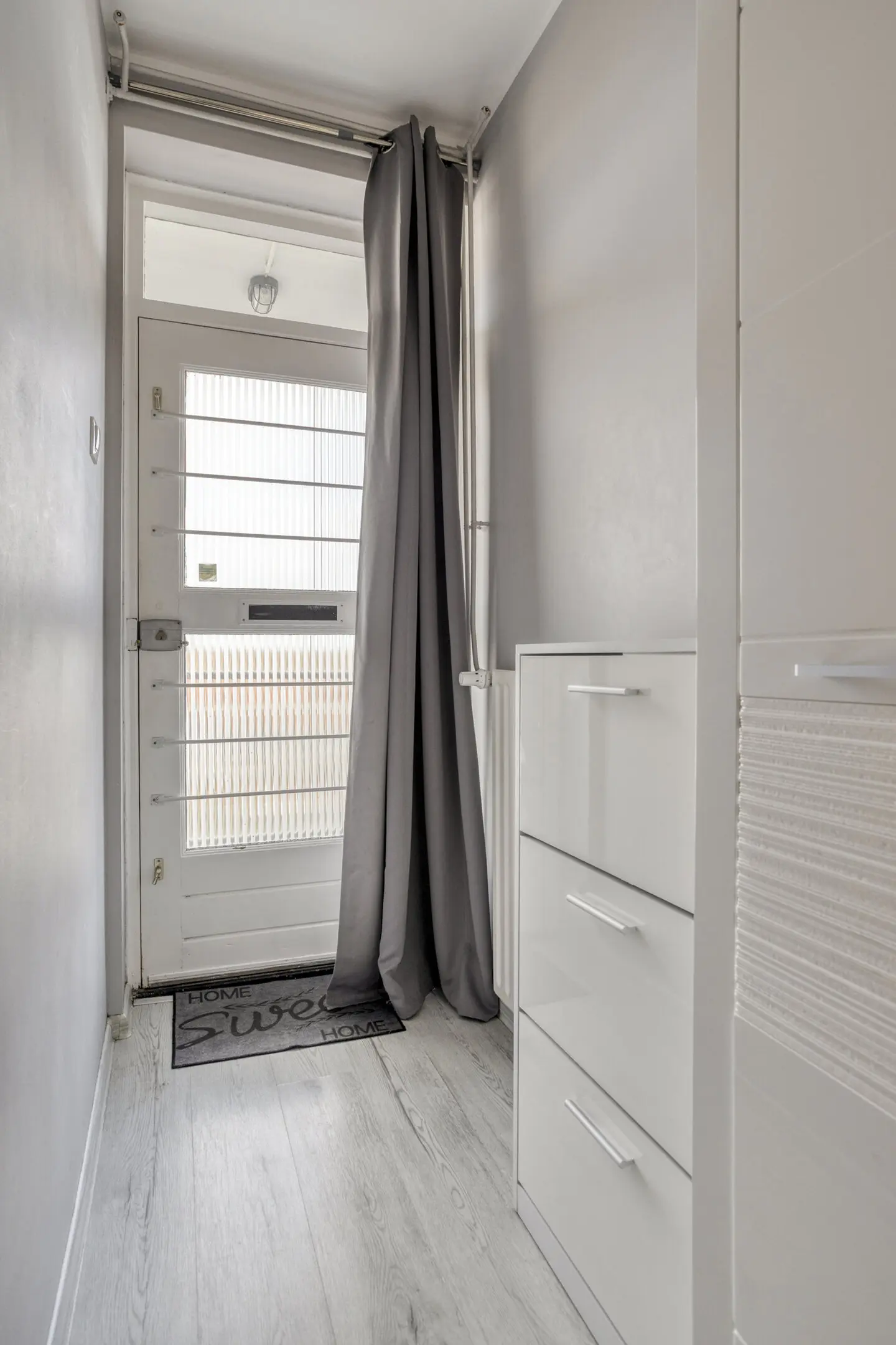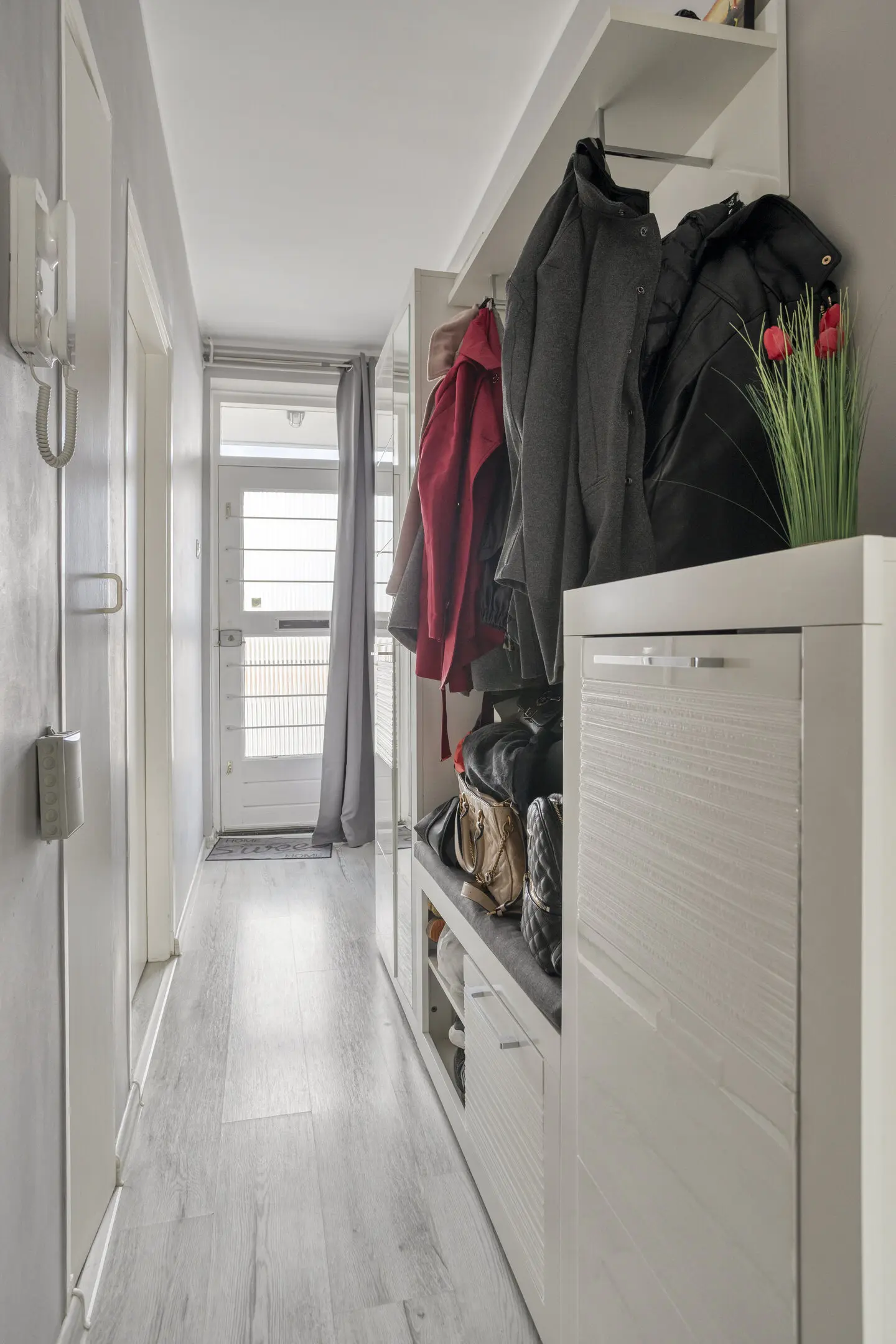 Bij binnenkomst in het appartement kom je in de gang. Vanuit deze gang heb je toegang tot vrijwel alle ruimtes van de woning: de woonkamer, de keuken, de twee slaapkamers, de badkamer en het separate toilet. In de gang bevinden zich daarnaast twee praktische inbouwkasten, wat zorgt voor extra opbergruimte (incl. meterkast).