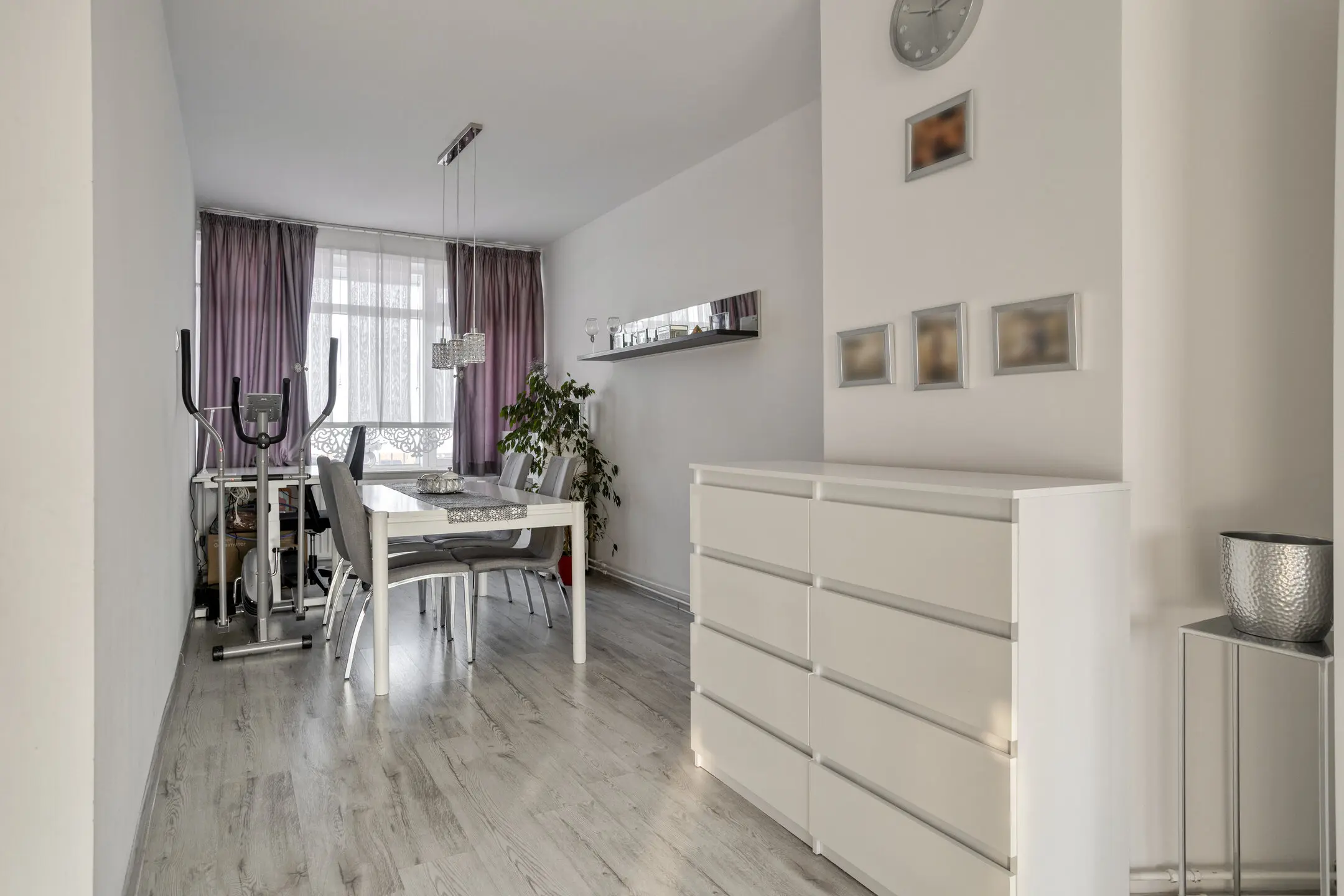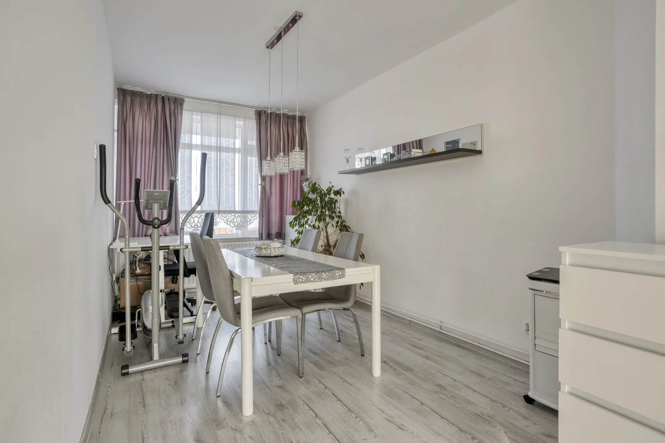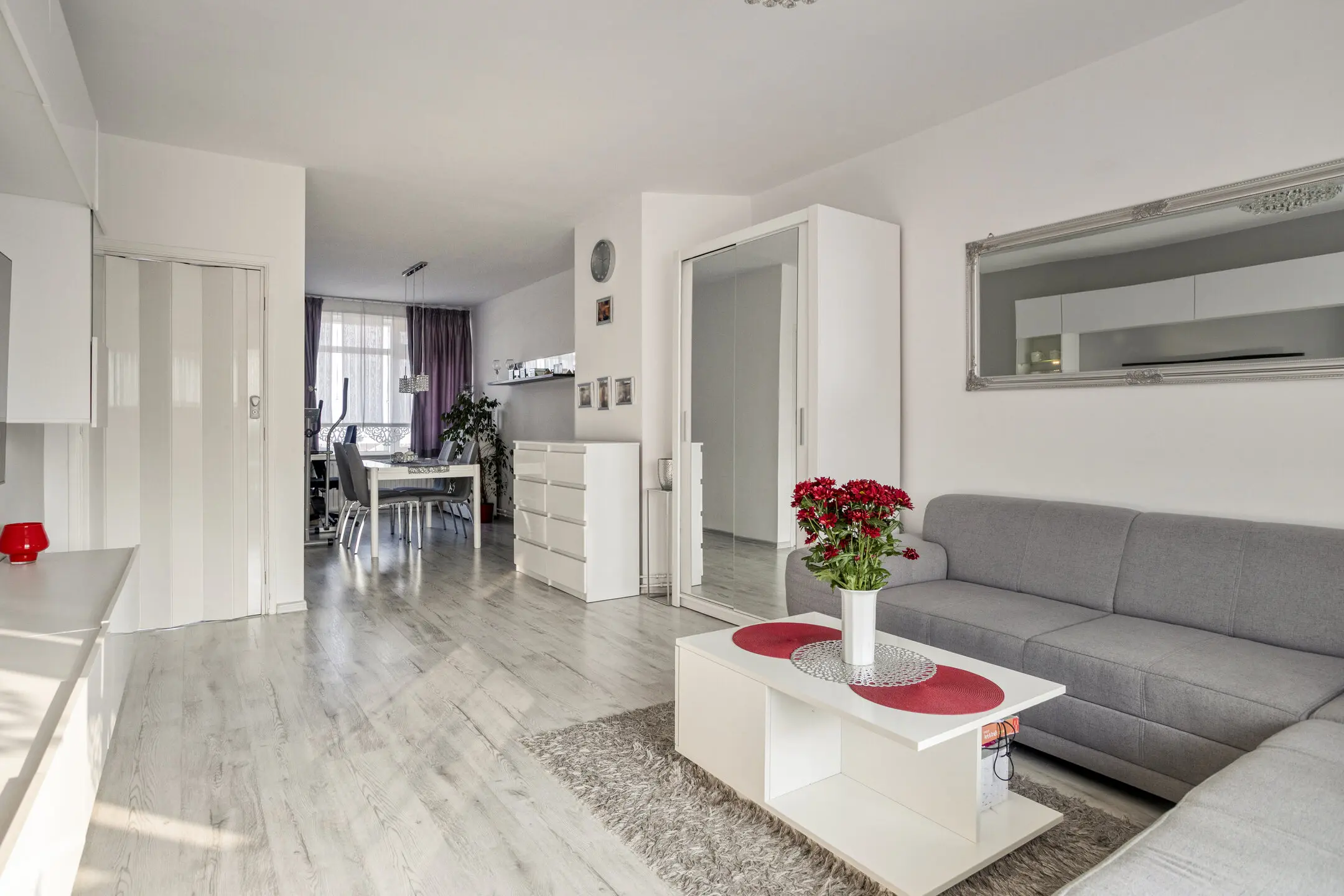 De woonkamer is ruim opgezet en heeft dankzij de grote ramen een prettige lichtinval. Hierdoor voelt de ruimte licht en open aan. De muren in de woonkamer zijn strak gestuck en op de gehele verdieping ligt een lichtkleurige laminaatvloer die door het appartement is doorgelegd. Vanuit de woonkamer heb je direct toegang tot het balkon, dat naar het westen/zuidwesten is georiënteerd en daarmee middag- en avondzon biedt.