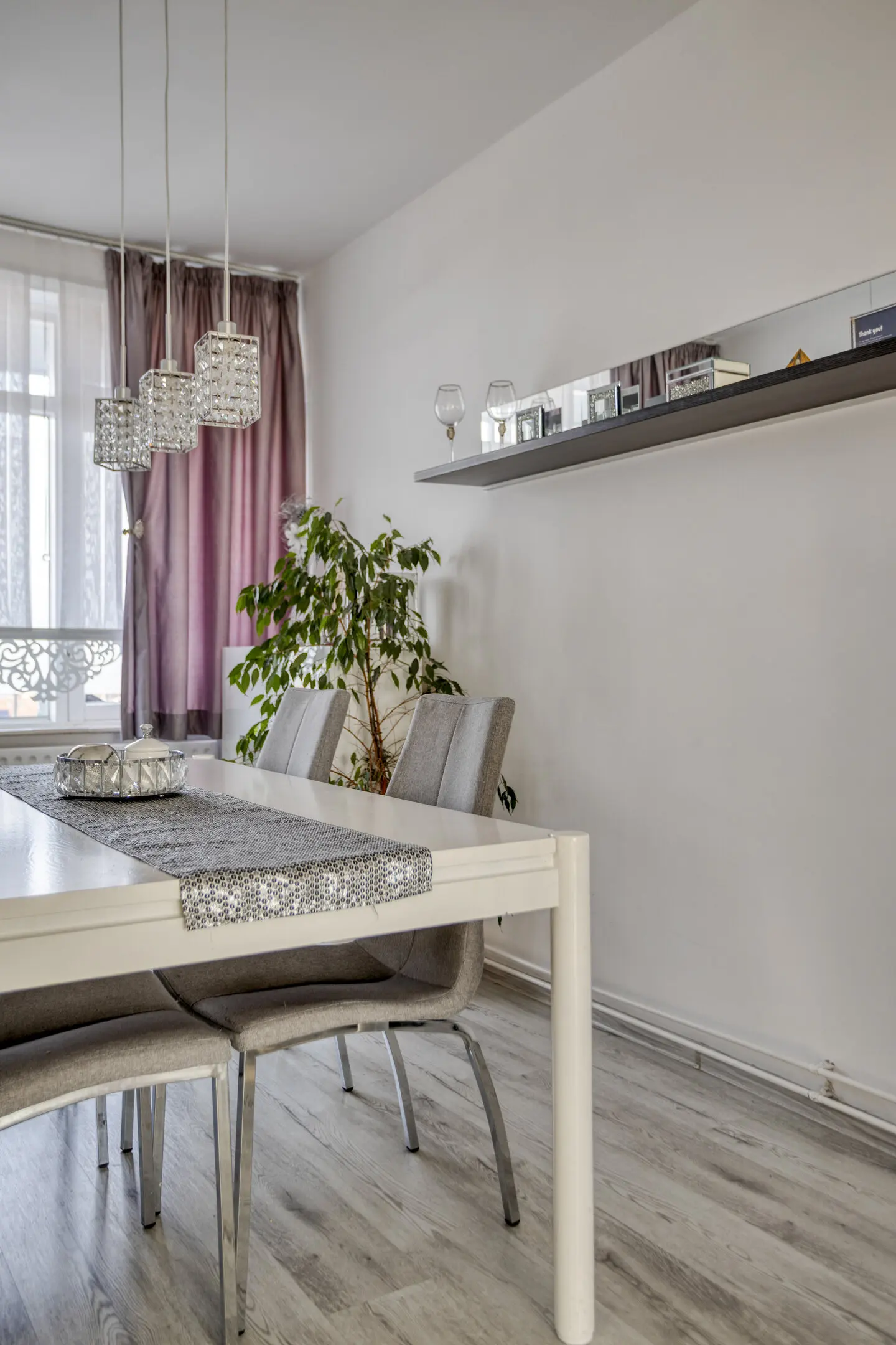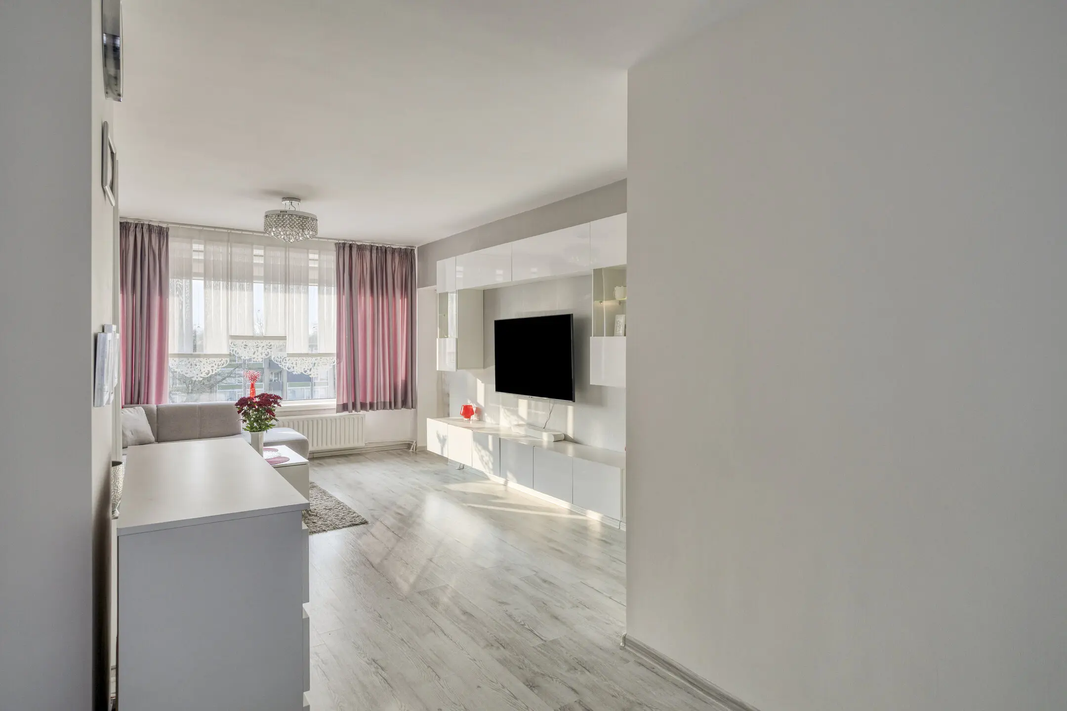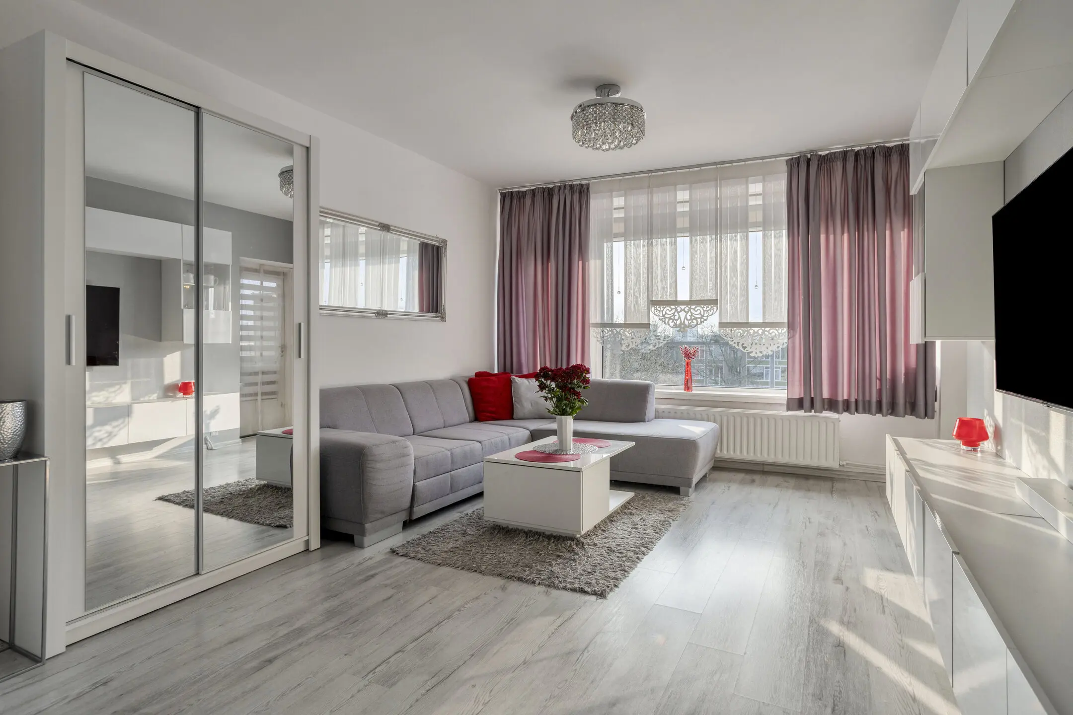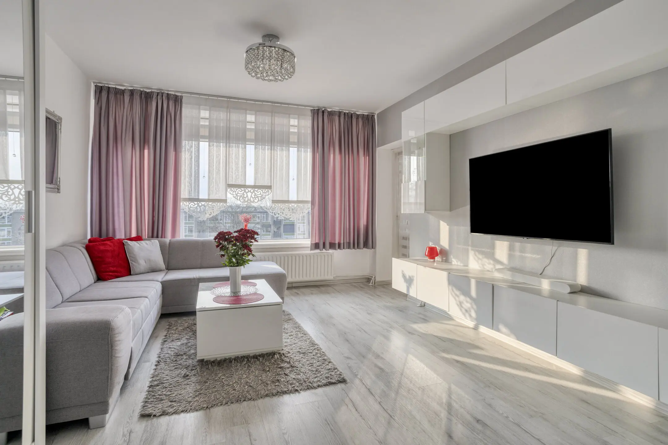 De woonkamer is ruim opgezet en heeft dankzij de grote ramen een prettige lichtinval. Hierdoor voelt de ruimte licht en open aan. De muren in de woonkamer zijn strak gestuck en op de gehele verdieping ligt een lichtkleurige laminaatvloer die door het appartement is doorgelegd. Vanuit de woonkamer heb je direct toegang tot het balkon, dat naar het westen/zuidwesten is georiënteerd en daarmee middag- en avondzon biedt.