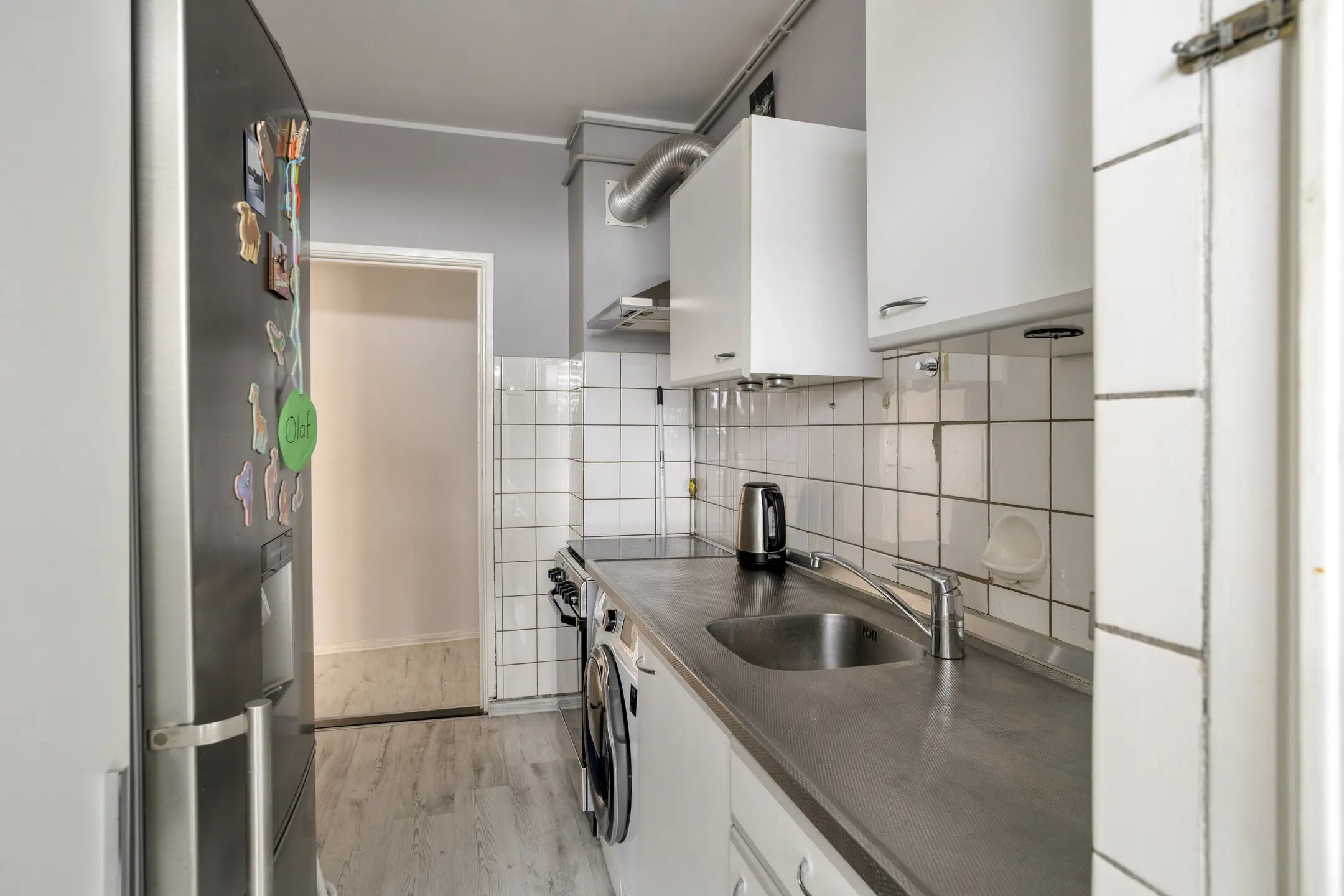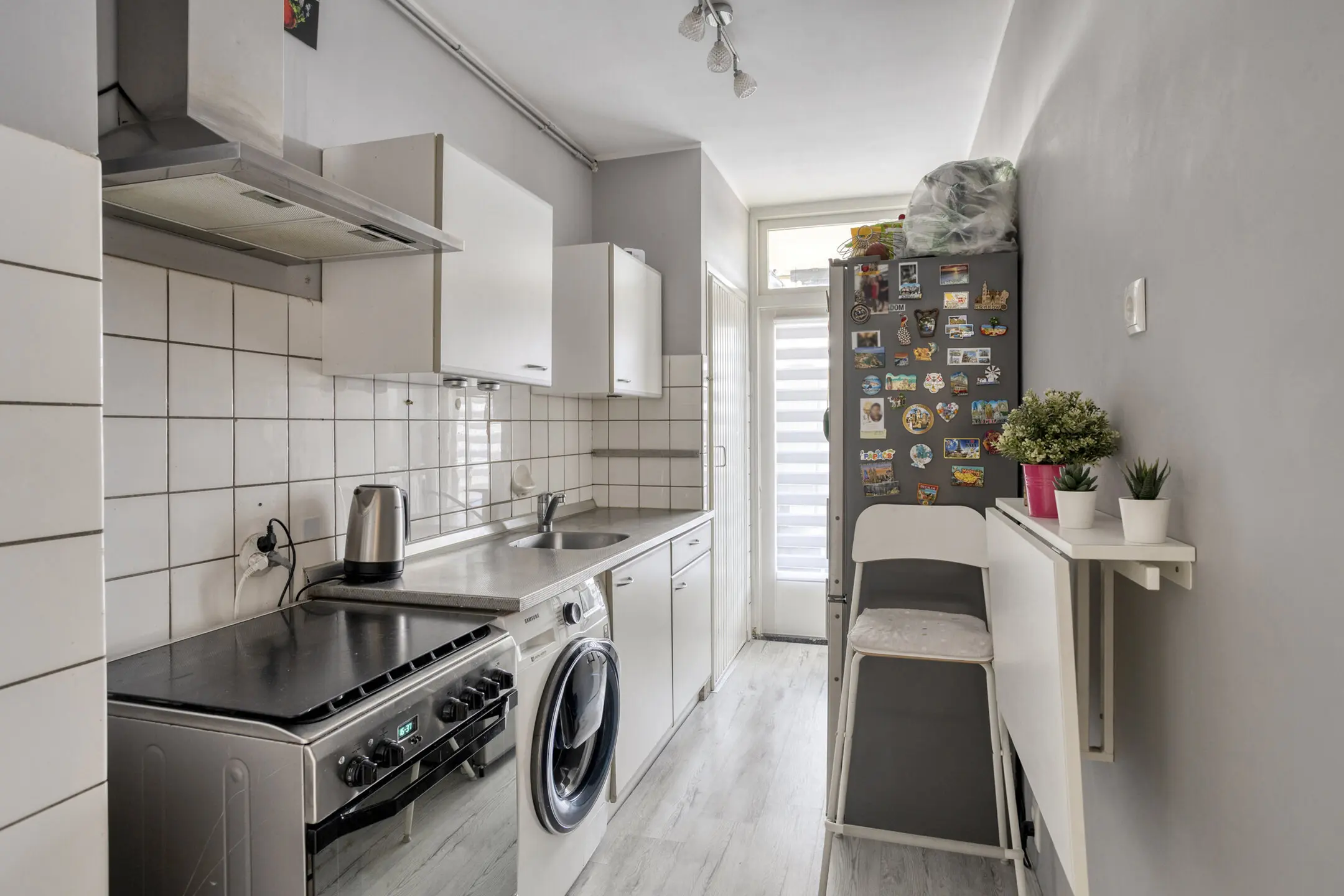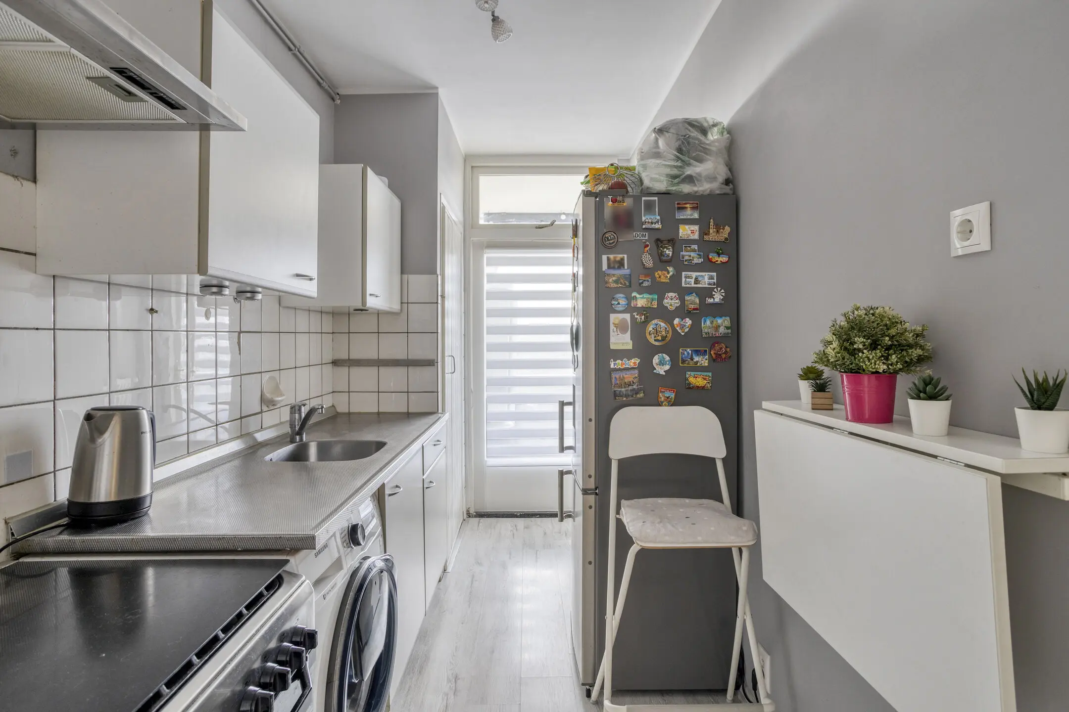 De keuken is uitgevoerd in een lichte kleuropstelling en beschikt over een praktische inbouwkast. De keuken biedt voldoende ruimte voor het bereiden van maaltijden en het opbergen van keukenspullen. Vanuit de keuken heb je eveneens toegang tot het balkon.