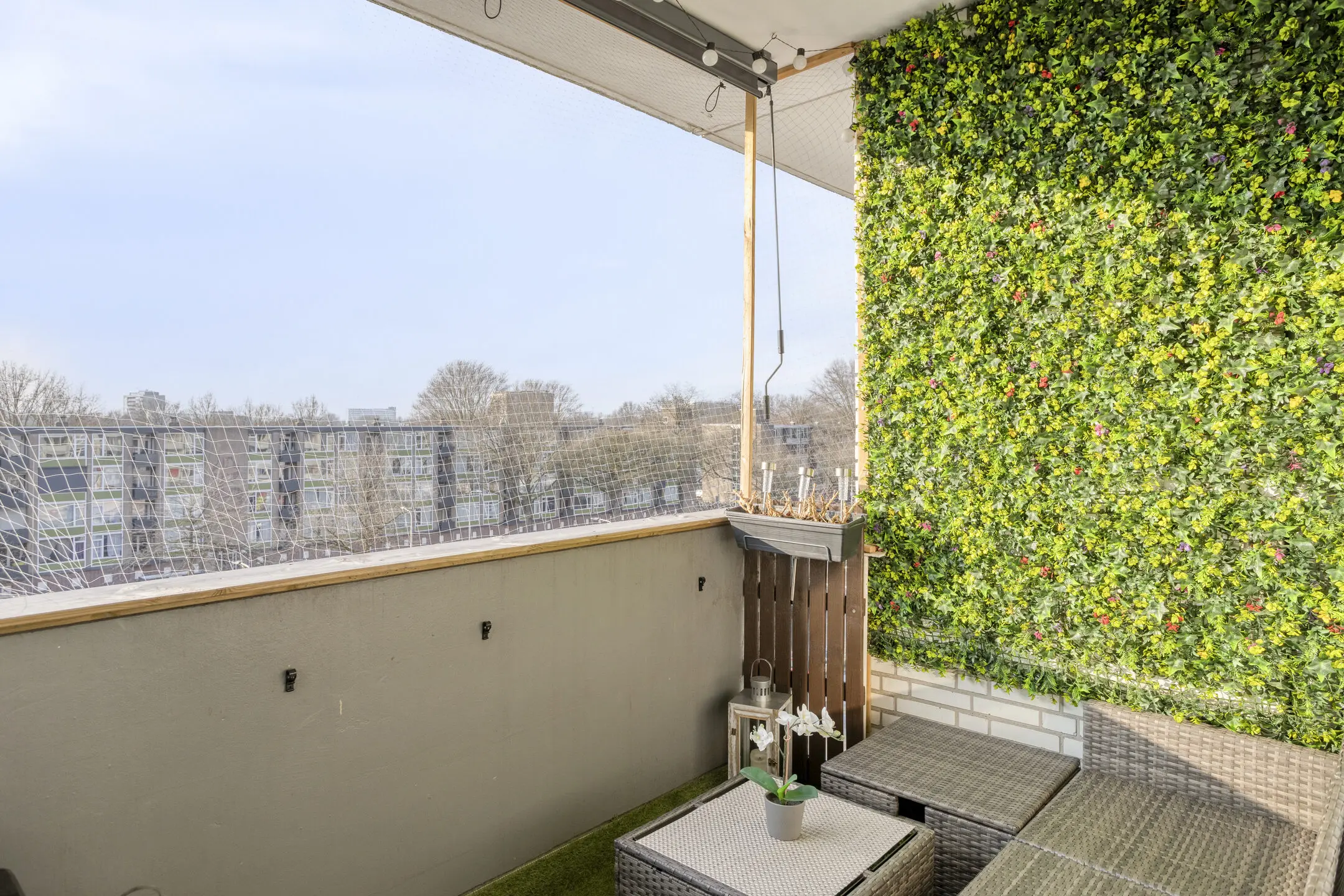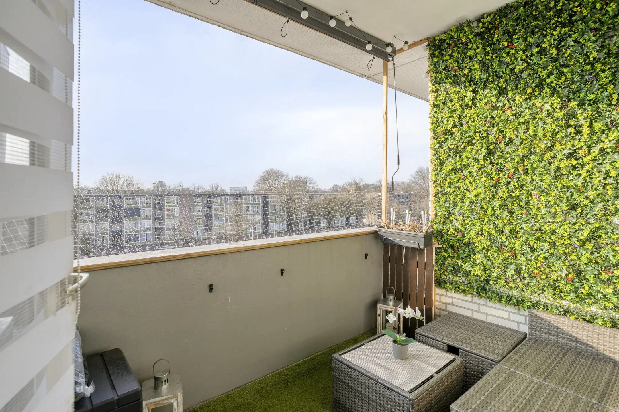 Het balkon is een fijne plek om even buiten te zitten en biedt voldoende ruimte voor een klein zitje.