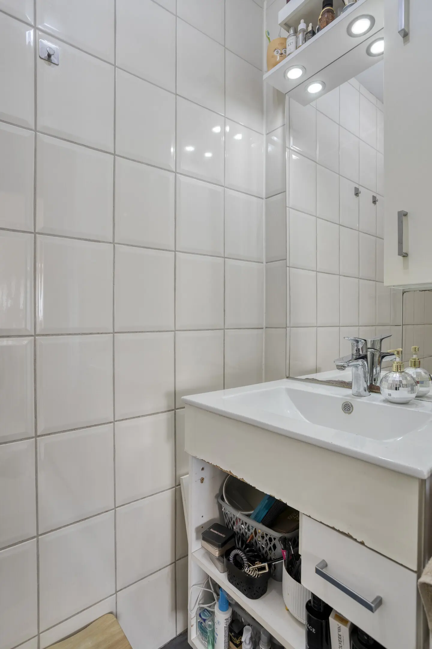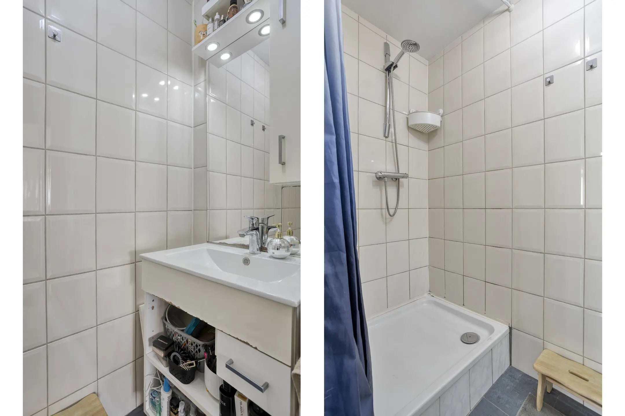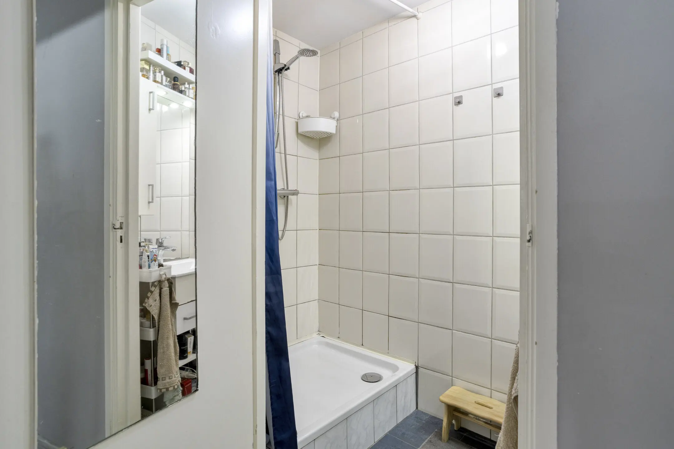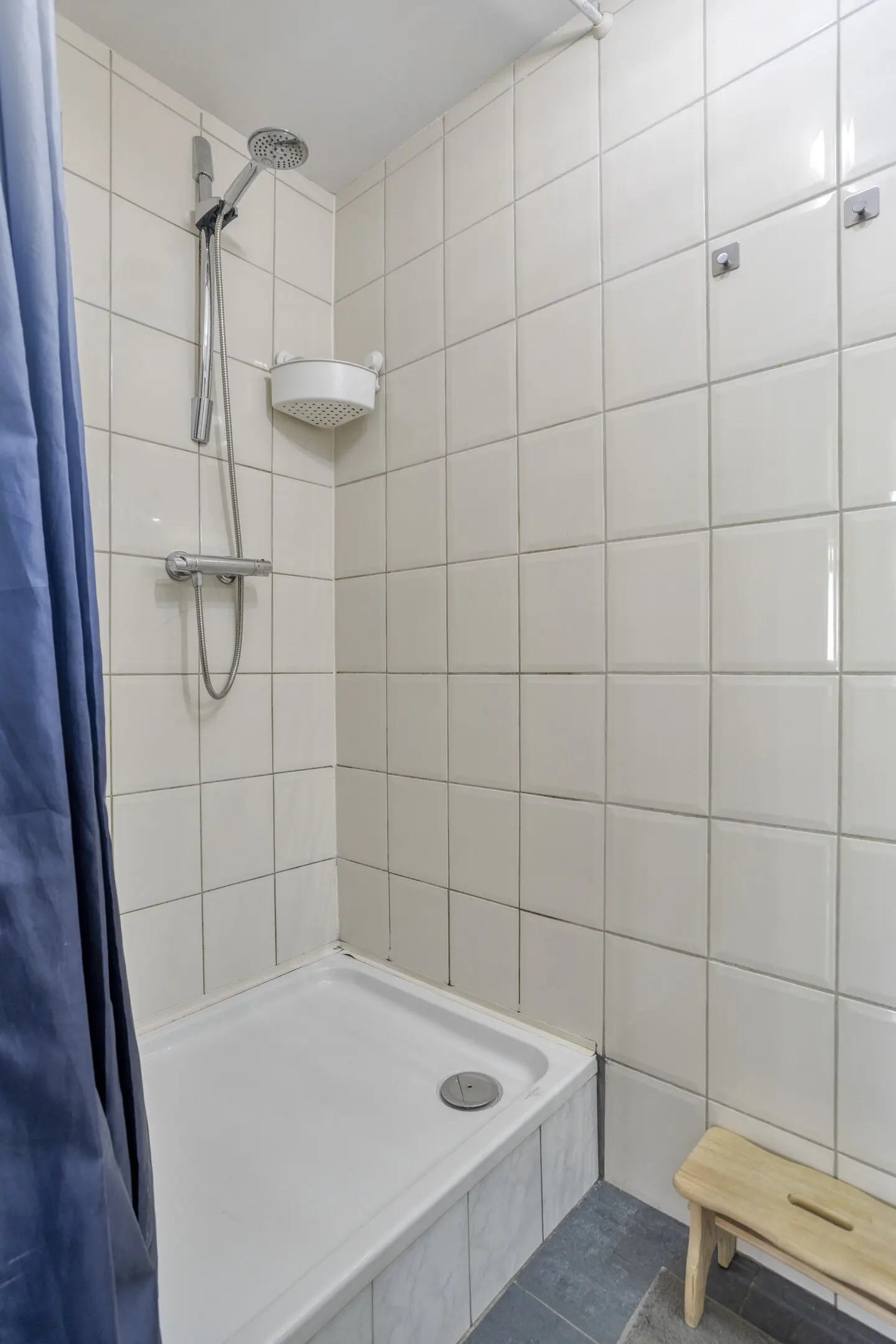 De badkamer is praktisch ingericht en voorzien van een douche en wastafel. Het toilet bevindt zich in een separate ruimte.