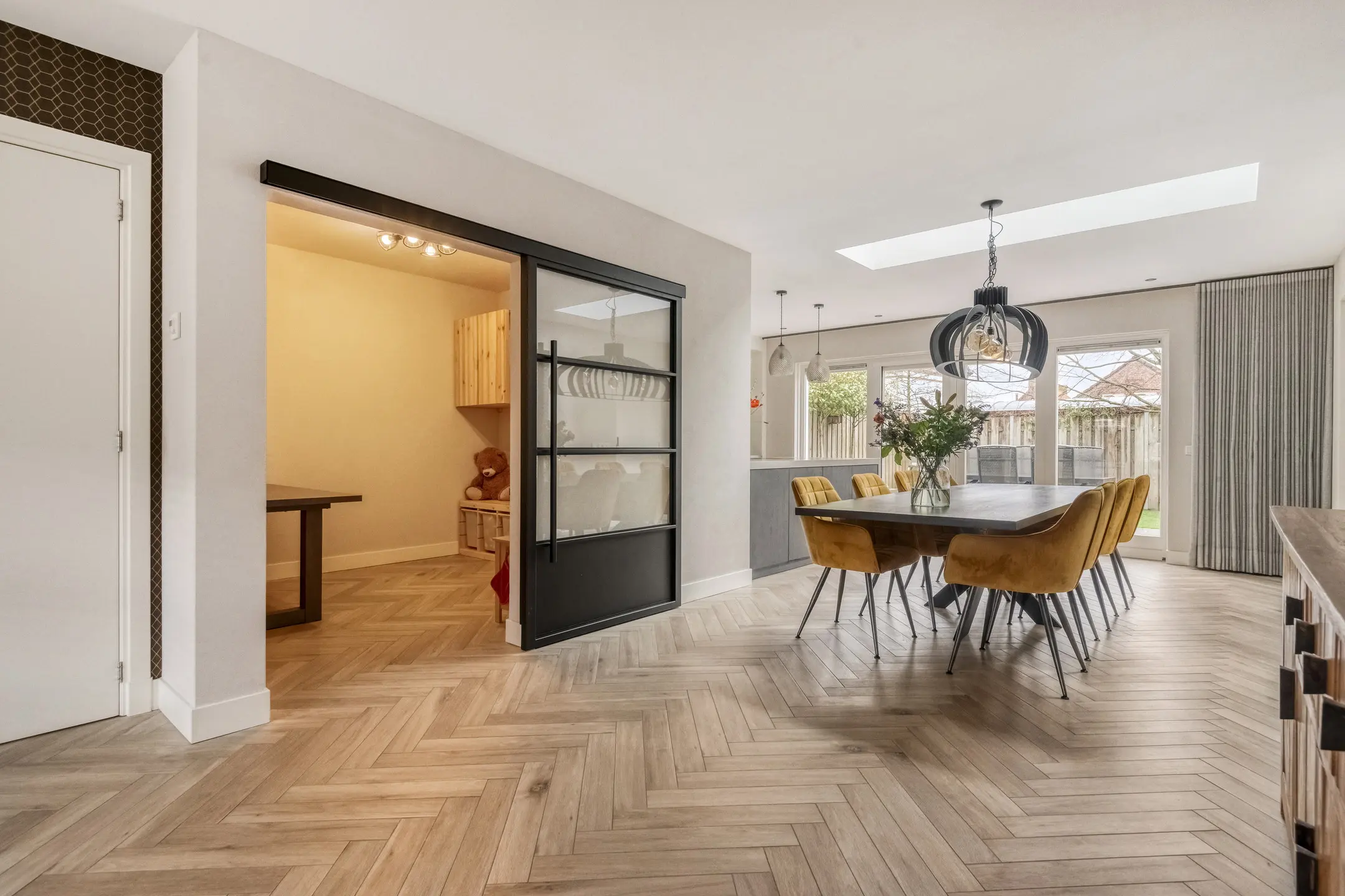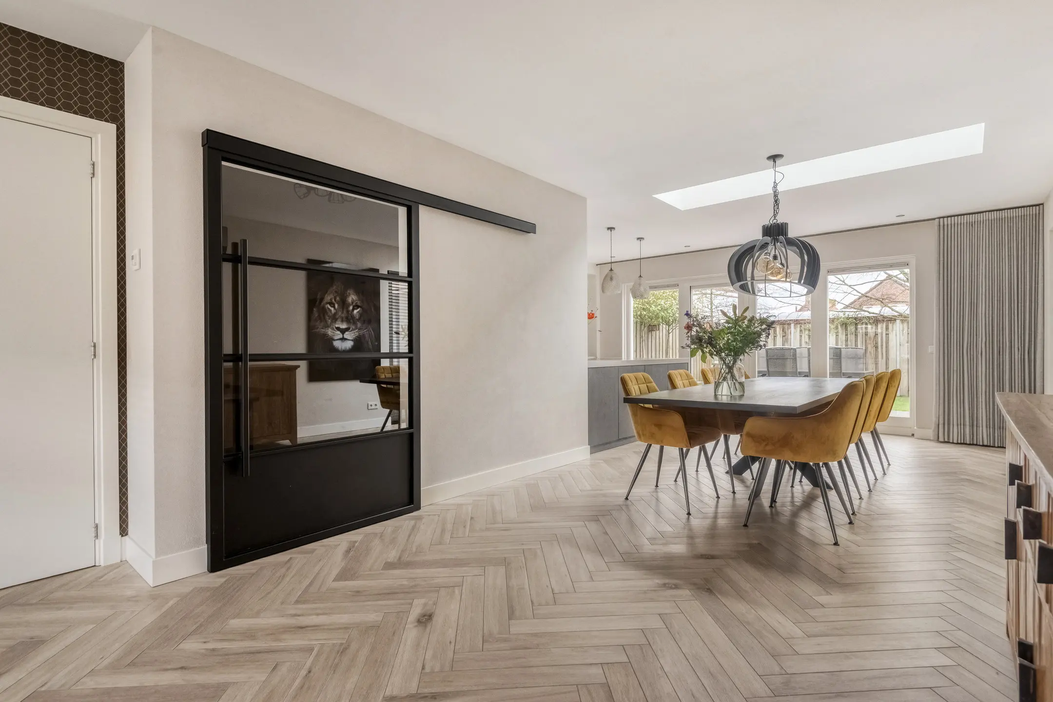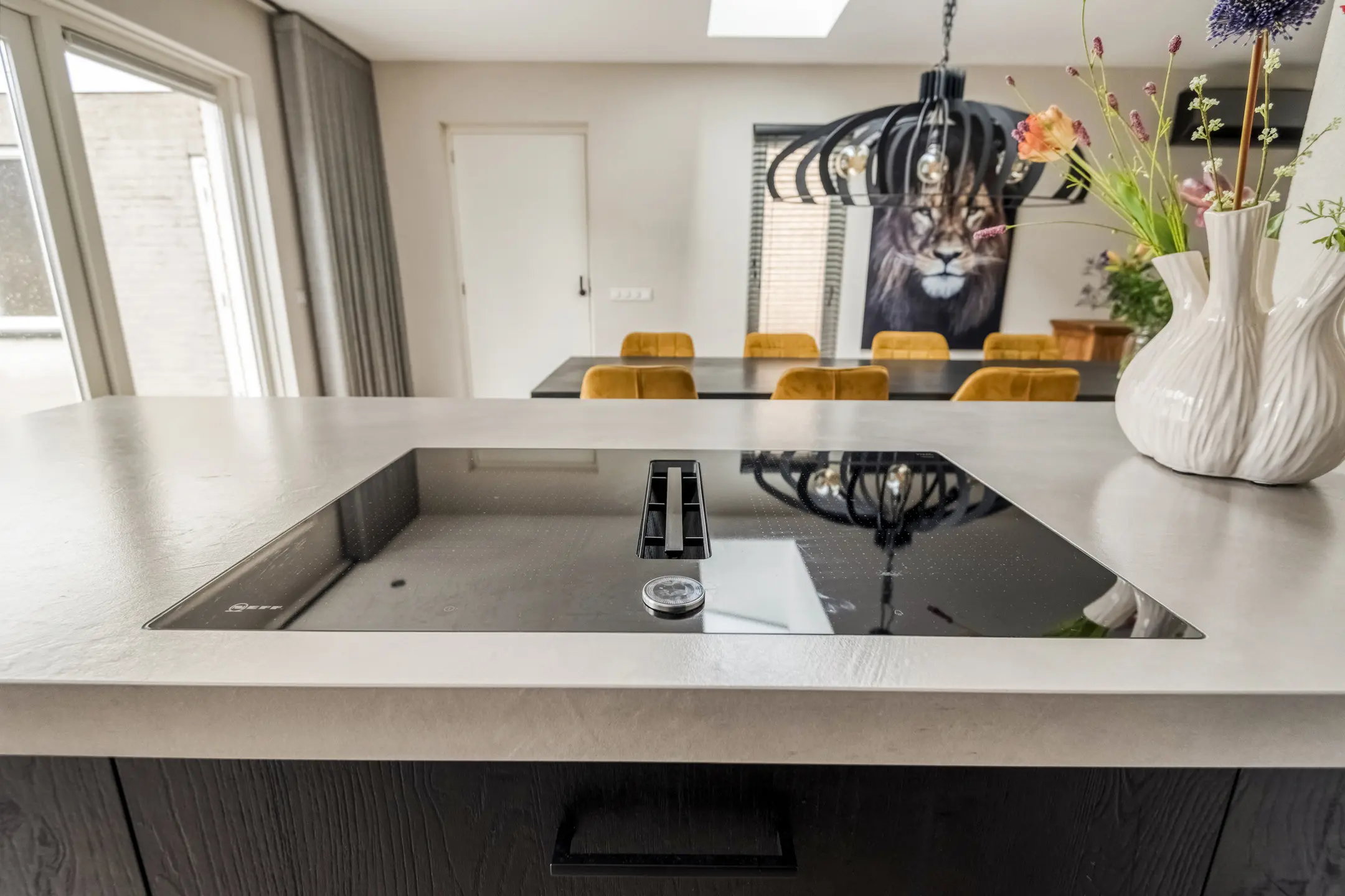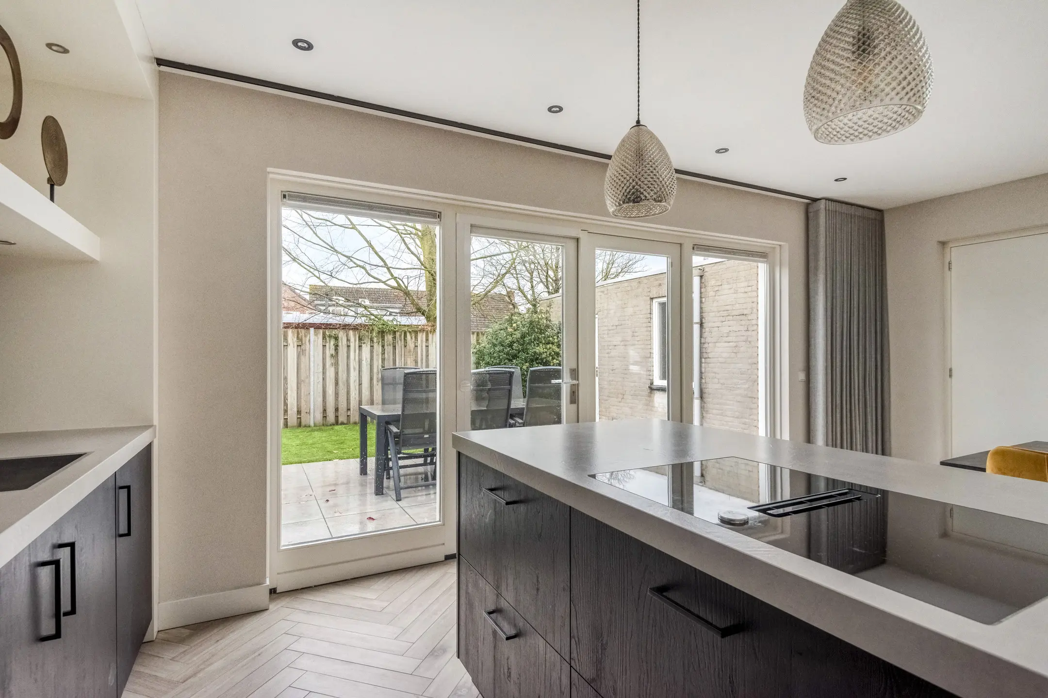 De moderne keuken met kookeiland (2020) is het stijlvolle hart van de woning. De combinatie van een strak design, veel werk- en bergruimte en de opstelling rondom het eiland maakt dit een plek waar koken en samenzijn vanzelf samenkomen. De openslaande deuren richting tuin versterken het ruimtelijke gevoel en maken binnen en buiten mooi één geheel.