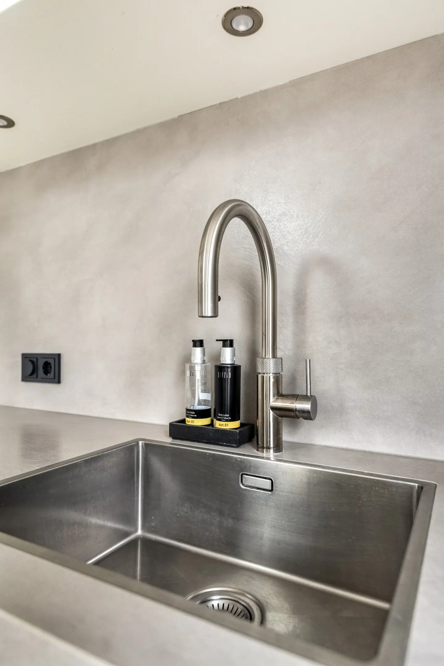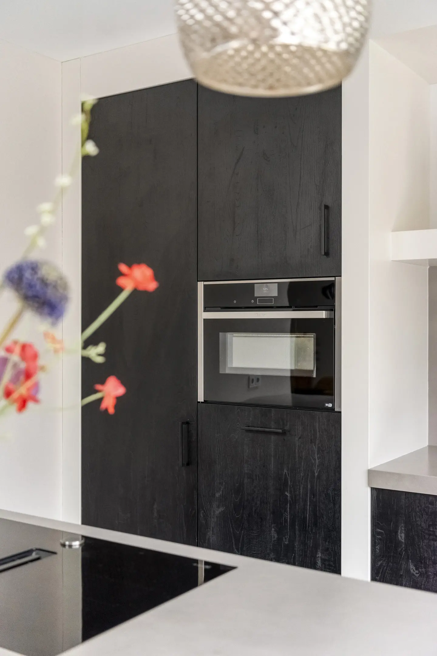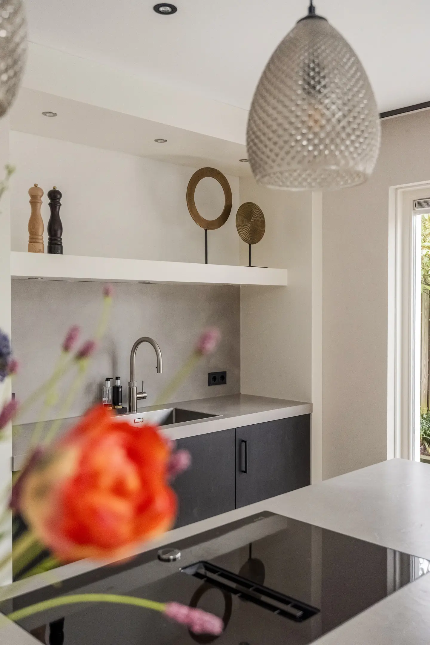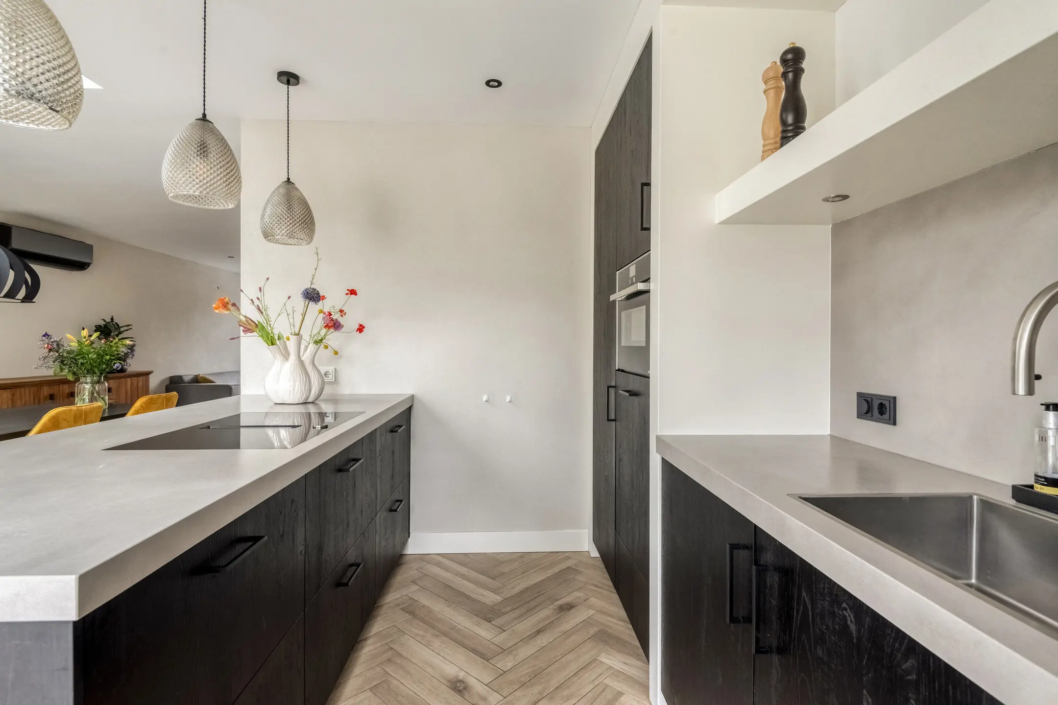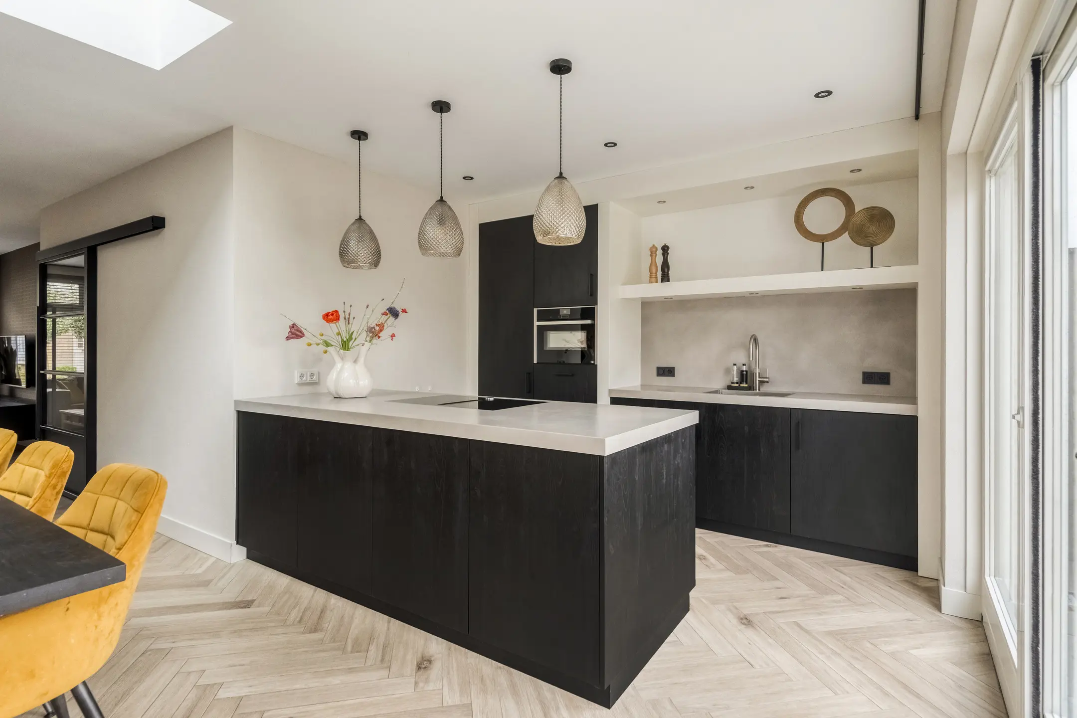 De moderne keuken met kookeiland (2020) is het stijlvolle hart van de woning. De combinatie van een strak design, veel werk- en bergruimte en de opstelling rondom het eiland maakt dit een plek waar koken en samenzijn vanzelf samenkomen. De openslaande deuren richting tuin versterken het ruimtelijke gevoel en maken binnen en buiten mooi één geheel.