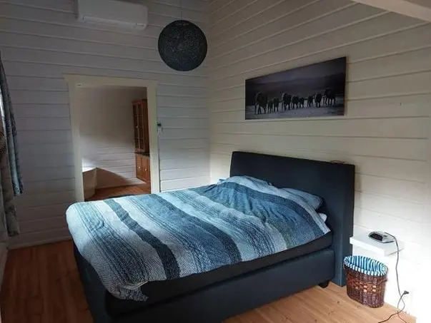 Ik neem je graag mee naar deze knusse en zeer goed onderhouden houten Finse bungalow, gelegen aan de buitenrand van het park met vrij zicht over de landerijen. Binnen valt direct de warme sfeer op, passend bij de natuurlijke omgeving. De woning beschikt over twee slaapkamers, waarvan één royale XXL-slaapkamer met een grote inbouwkast en een badkamer met bad en toilet ensuite. Oorspronkelijk waren dit twee slaapkamers, wat de ruimte extra goed voelbaar maakt. Daarnaast is er een tweede badkamer met douche en toilet, wat het dagelijks comfort vergroot.