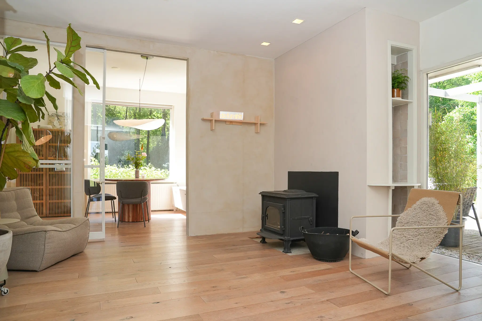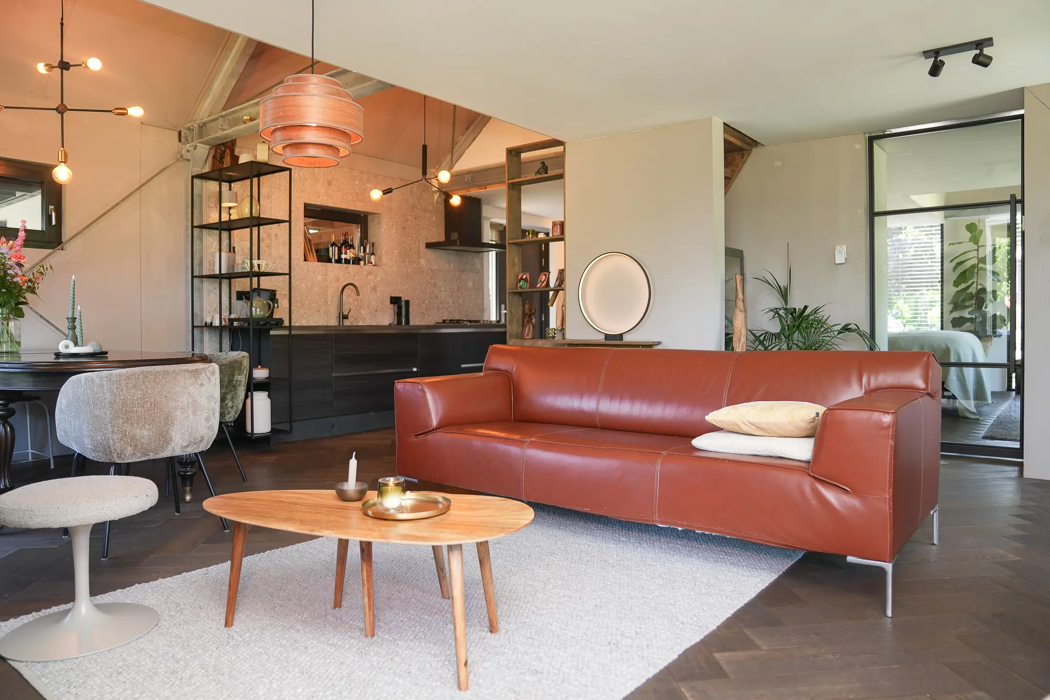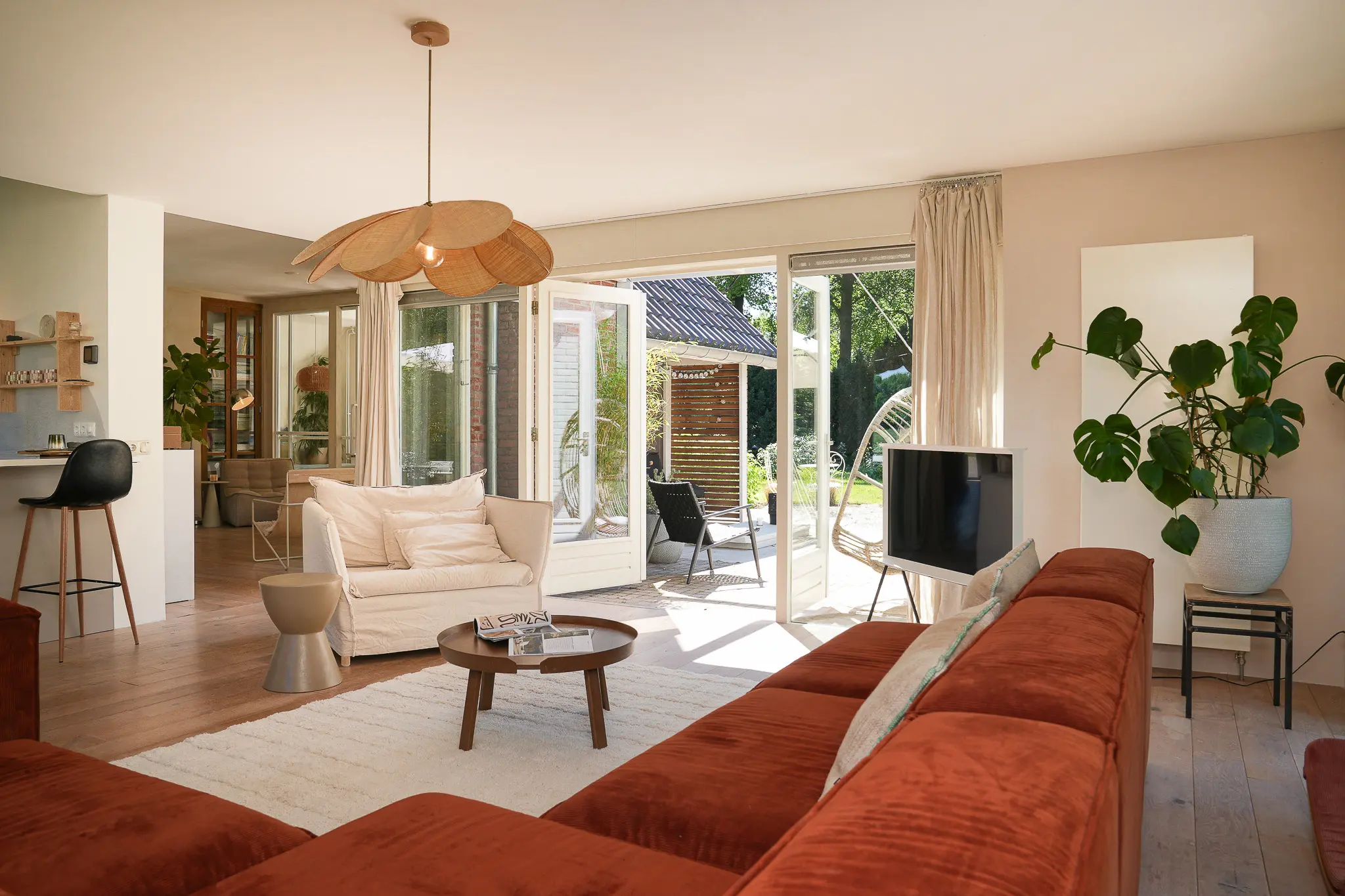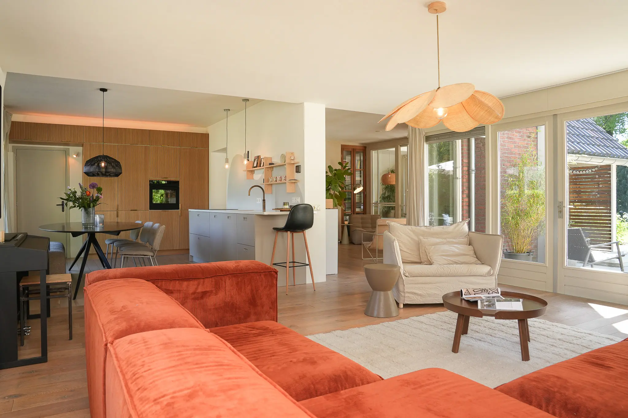 De hoofdwoning is modern afgewerkt met natuurlijke materialen, warme tinten en houten vloeren. De open keuken is een echte blikvanger, uitgerust met hoogwaardige inbouwapparatuur, een stoomoven, inductiekookplaat met geïntegreerde afzuiging, een Quooker en een gun metal spoelbak. De grote eiken wandkasten bieden volop opbergruimte en de keuken loopt direct over in de lichte woonkamer.