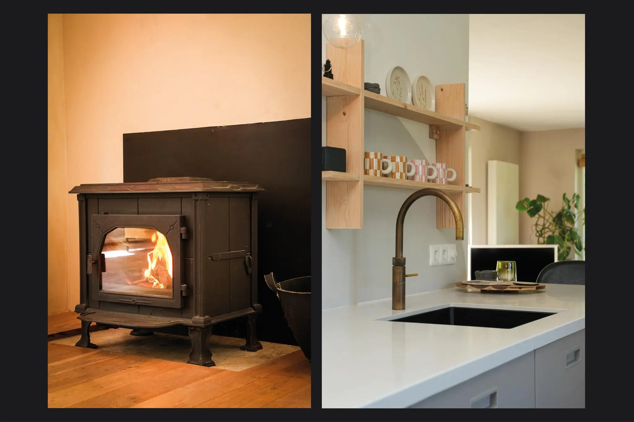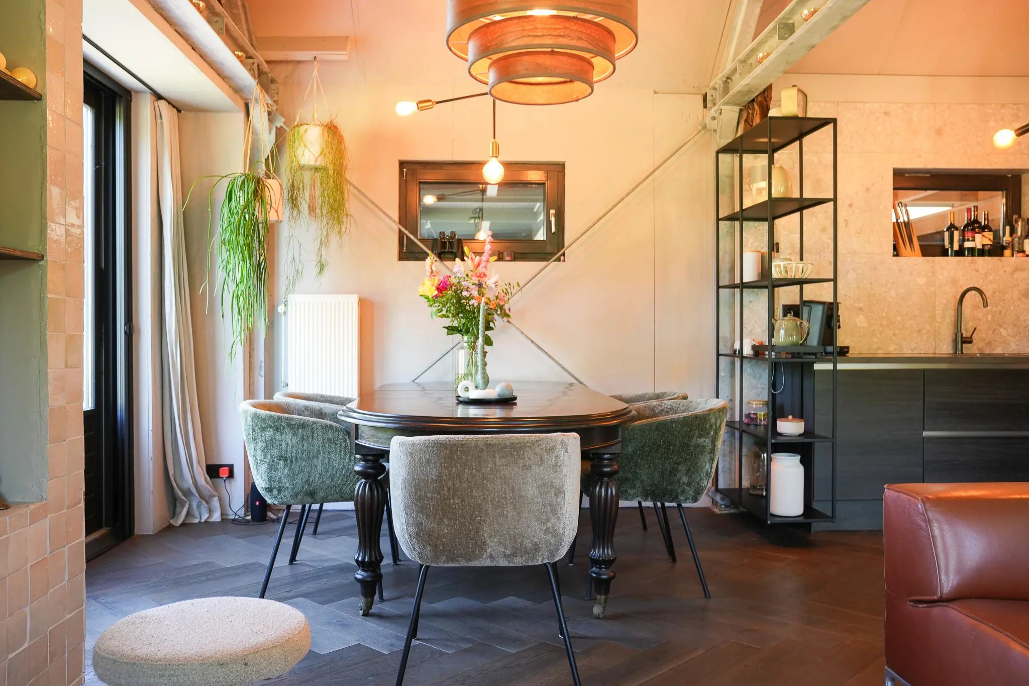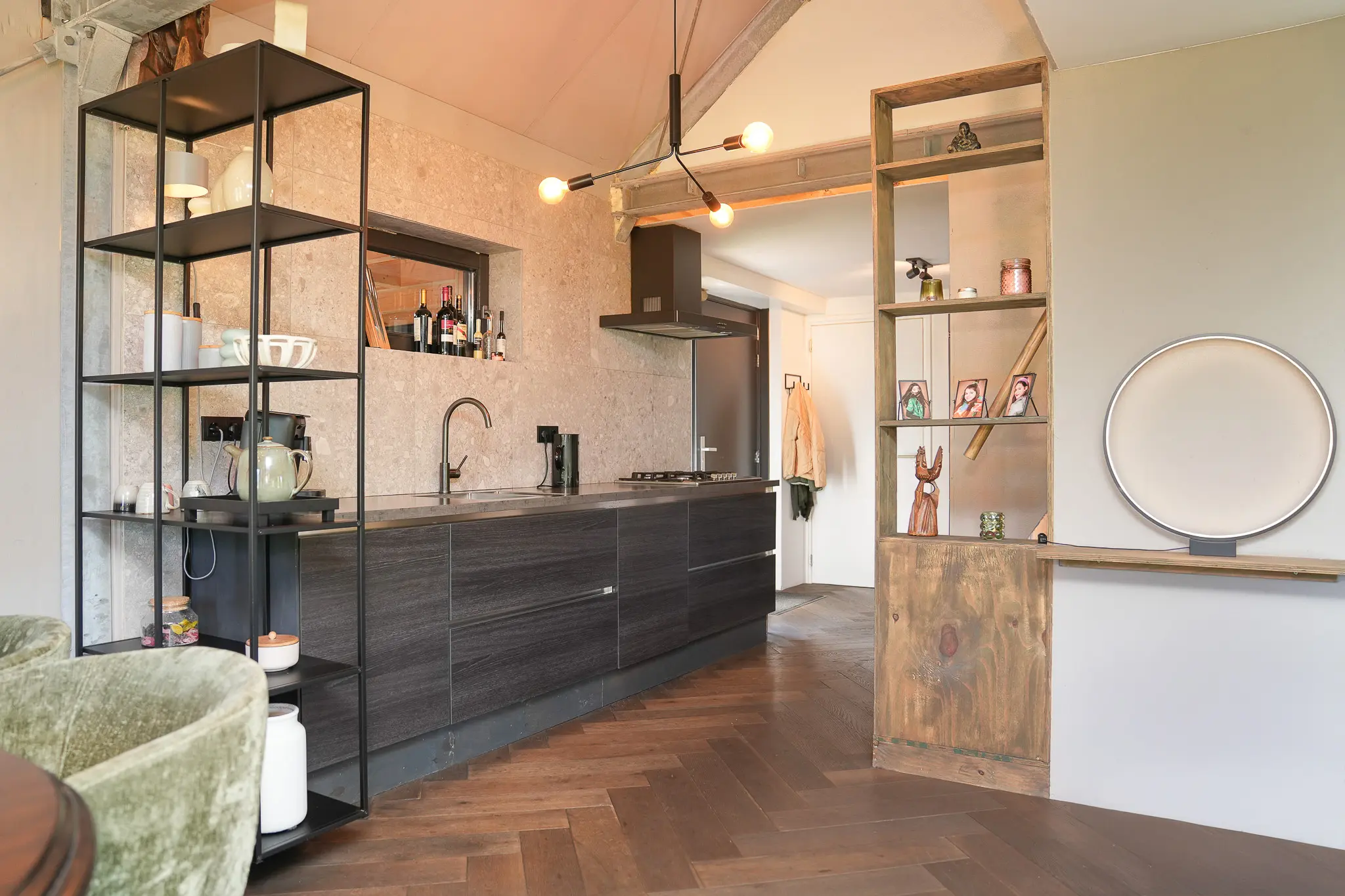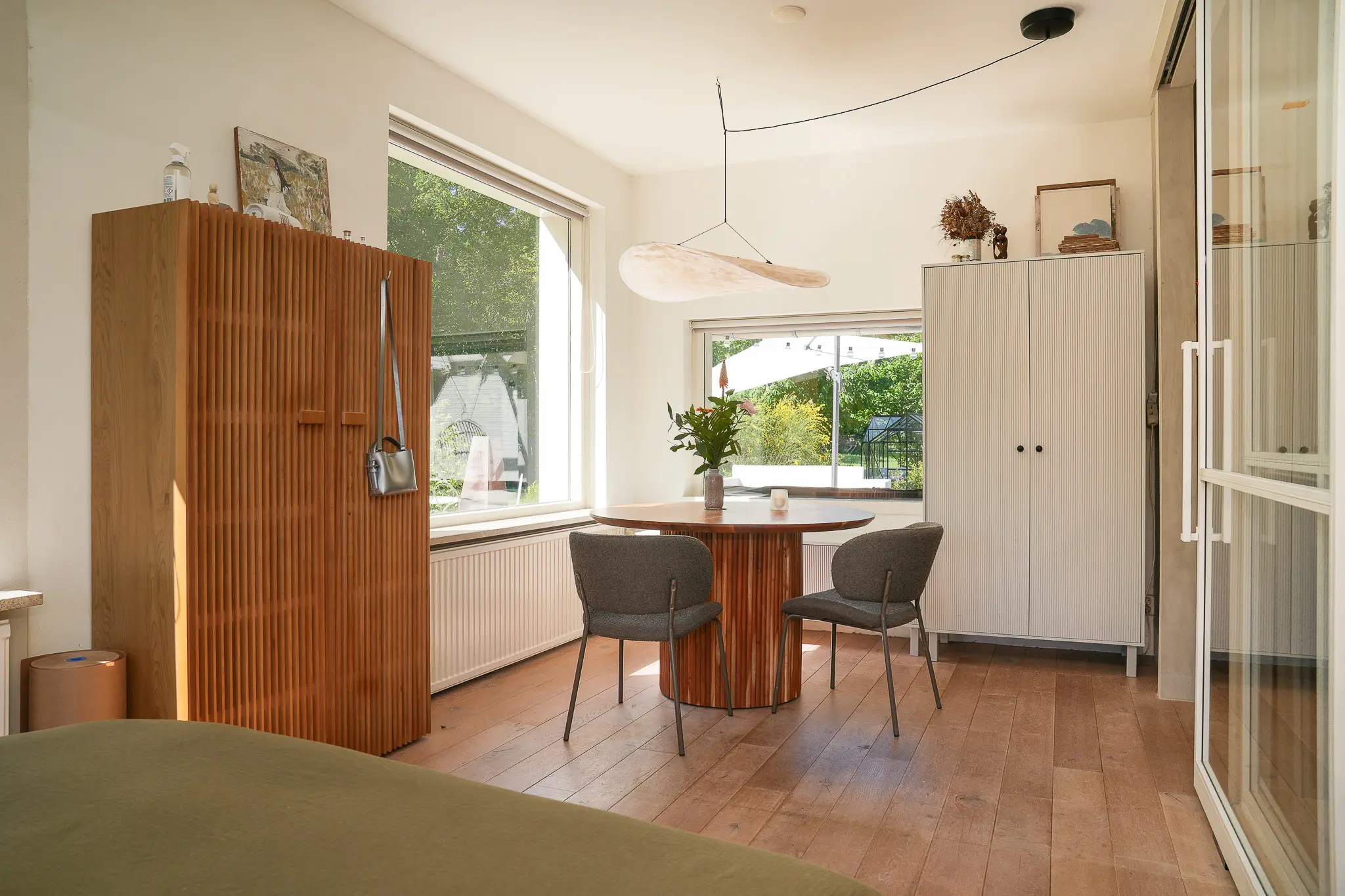 De hoofdwoning is modern afgewerkt met natuurlijke materialen, warme tinten en houten vloeren. De open keuken is een echte blikvanger, uitgerust met hoogwaardige inbouwapparatuur, een stoomoven, inductiekookplaat met geïntegreerde afzuiging, een Quooker en een gun metal spoelbak. De grote eiken wandkasten bieden volop opbergruimte en de keuken loopt direct over in de lichte woonkamer.
