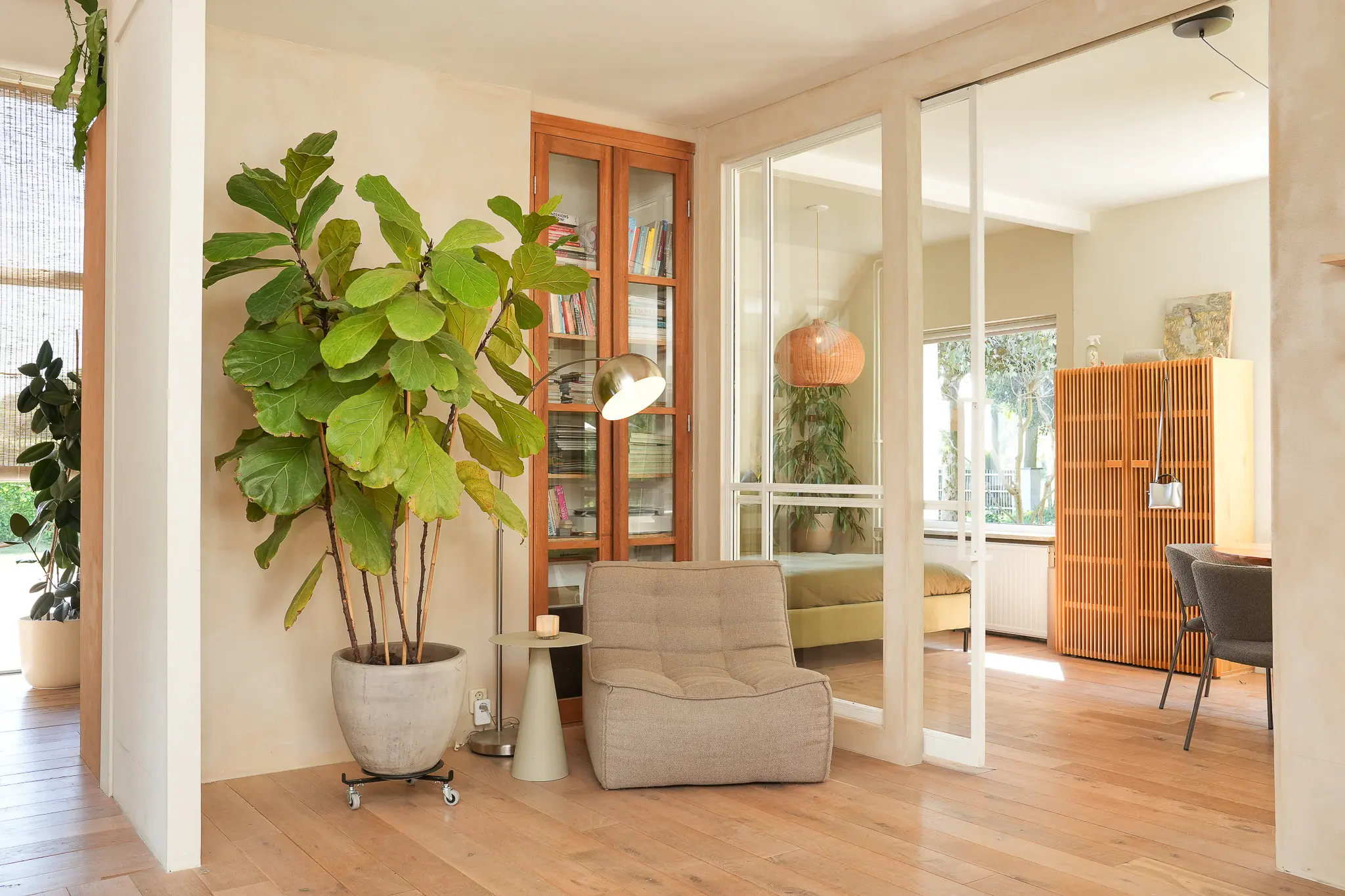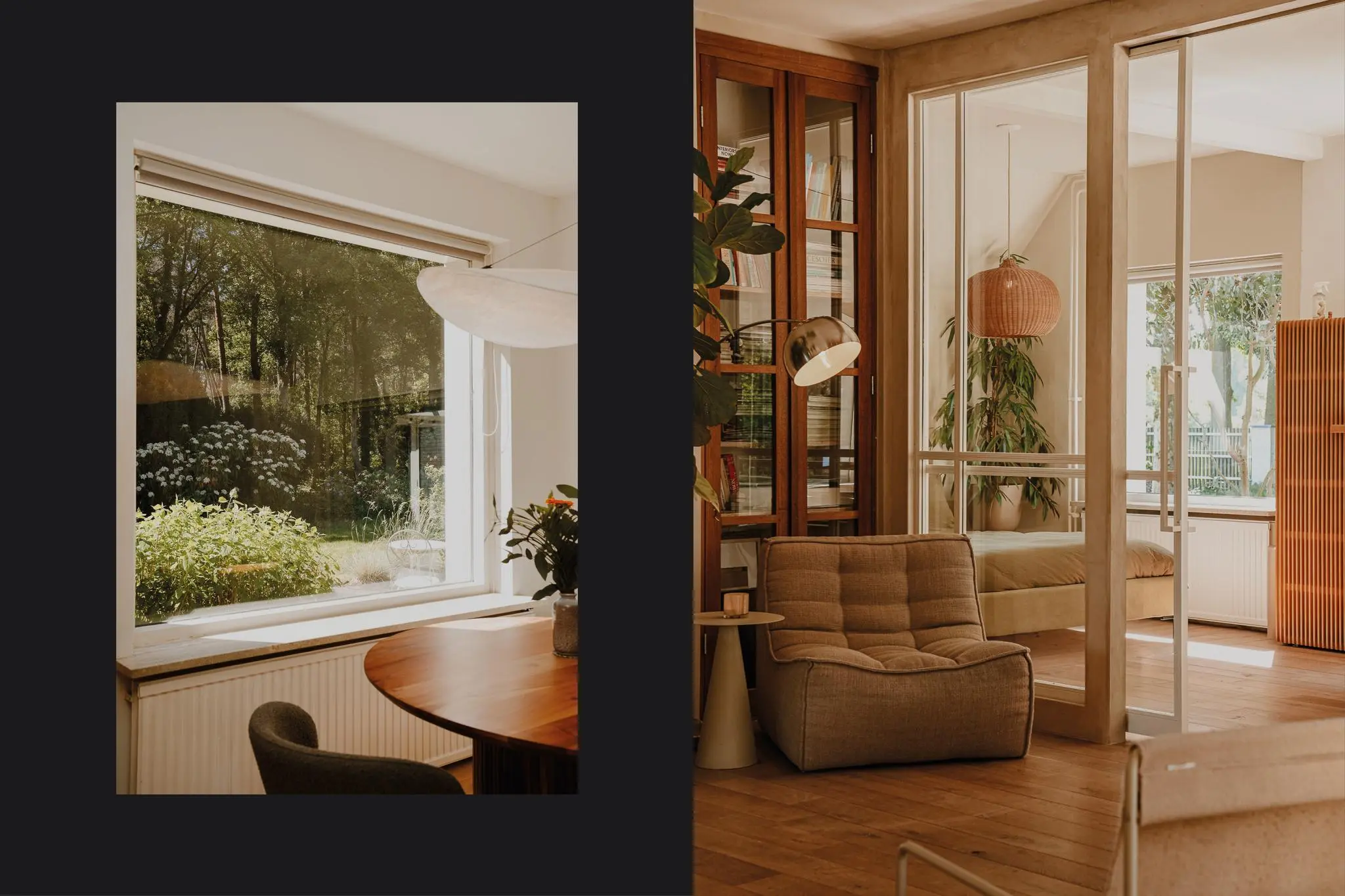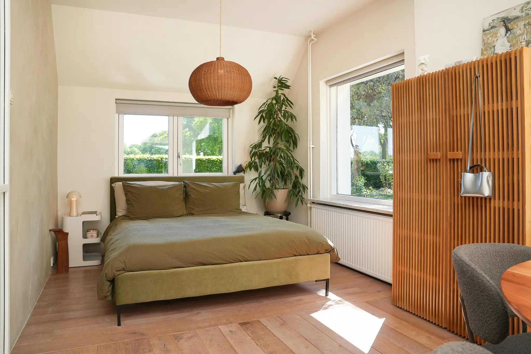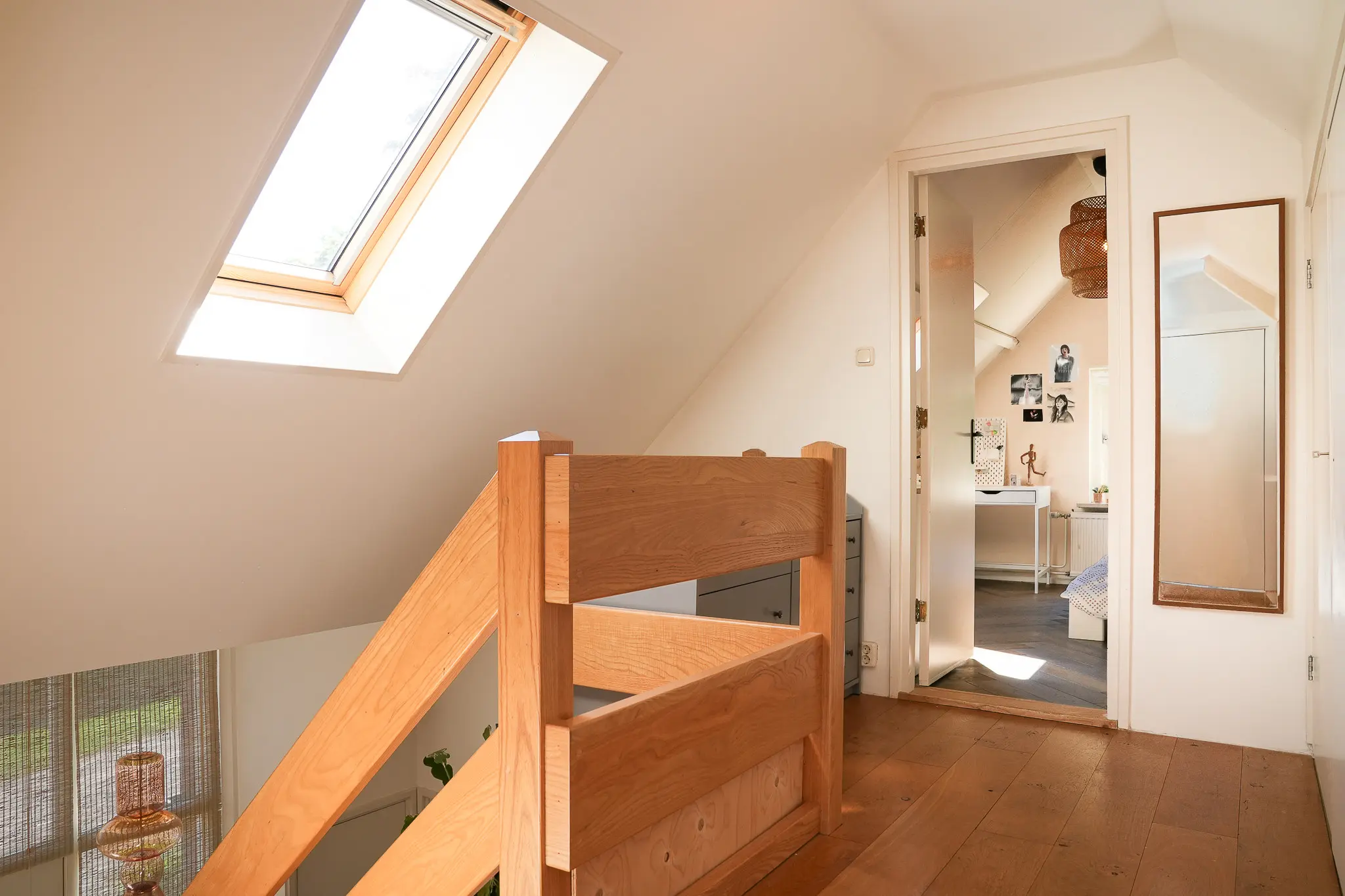 De hoofdwoning is modern afgewerkt met natuurlijke materialen, warme tinten en houten vloeren. De open keuken is een echte blikvanger, uitgerust met hoogwaardige inbouwapparatuur, een stoomoven, inductiekookplaat met geïntegreerde afzuiging, een Quooker en een gun metal spoelbak. De grote eiken wandkasten bieden volop opbergruimte en de keuken loopt direct over in de lichte woonkamer.