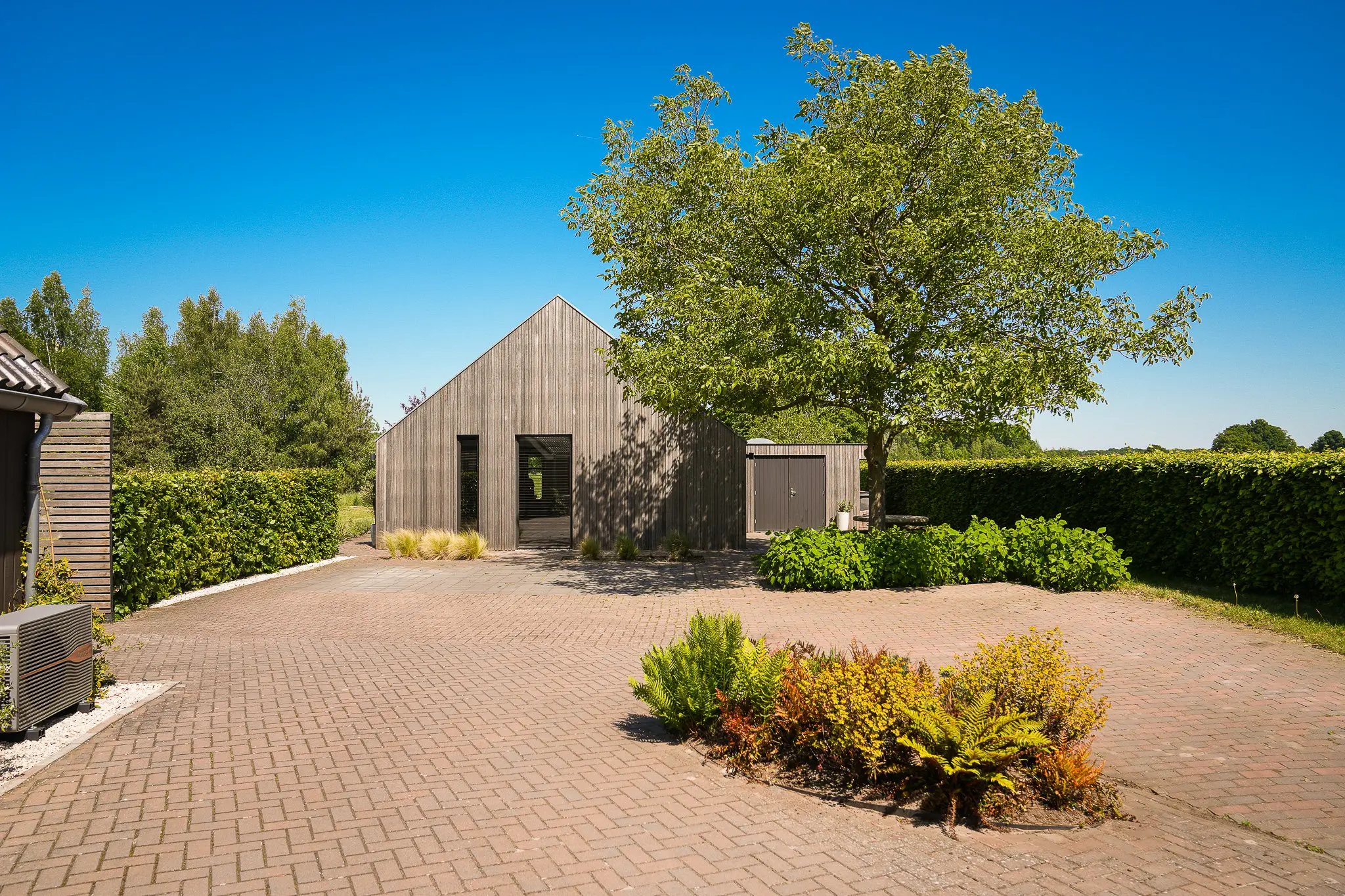 Het bijgebouw heeft een eigen entree en biedt drie slaapkamers, een moderne open keuken met VT wonen-tegelwerk en een stijlvolle badkamer ensuite. De donkere kleurstelling en luxe afwerking geven het geheel een chique uitstraling. Dankzij de indeling op de begane grond is het bijgebouw ideaal als zorgwoning, studio of gastenverblijf.