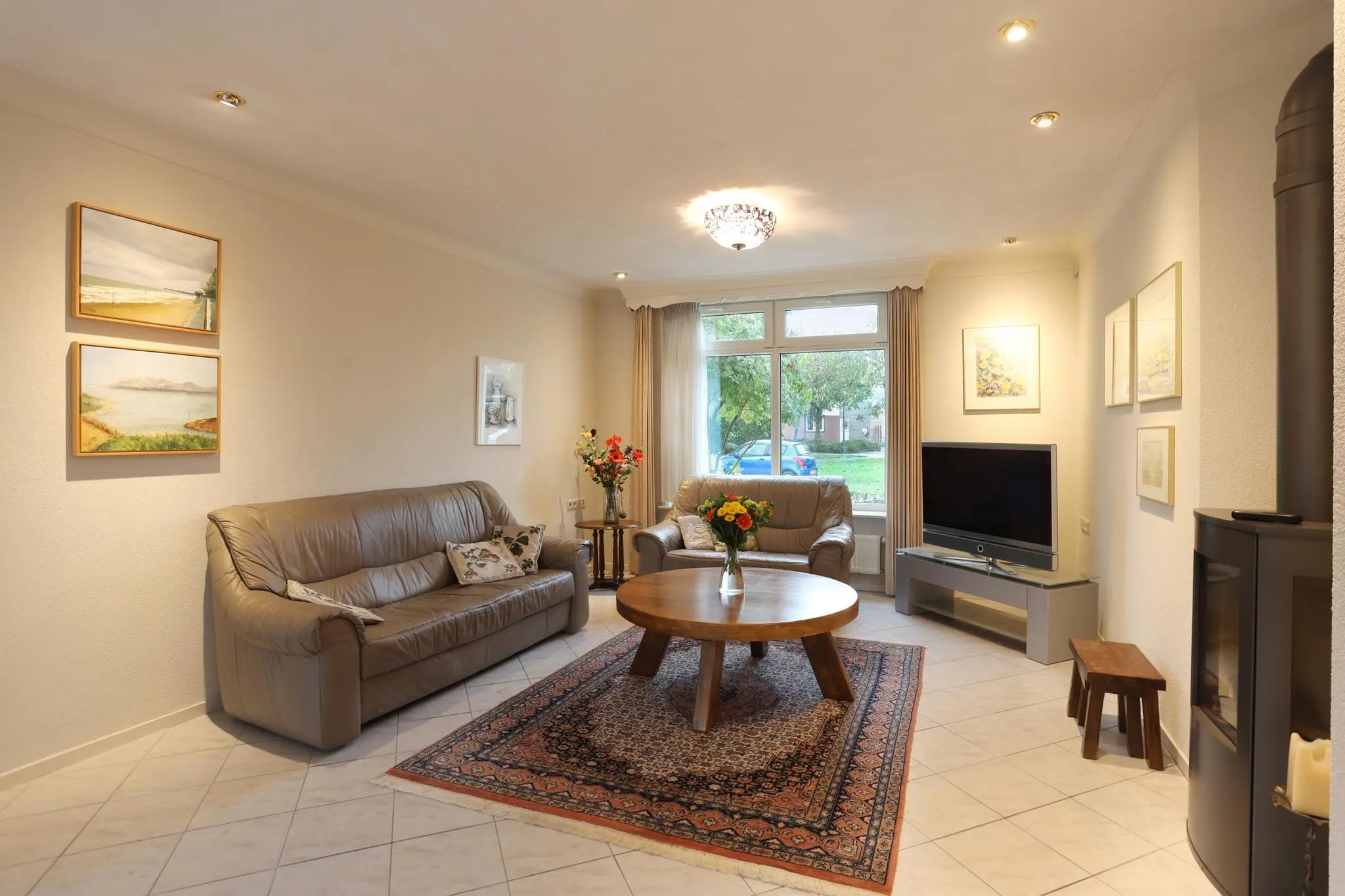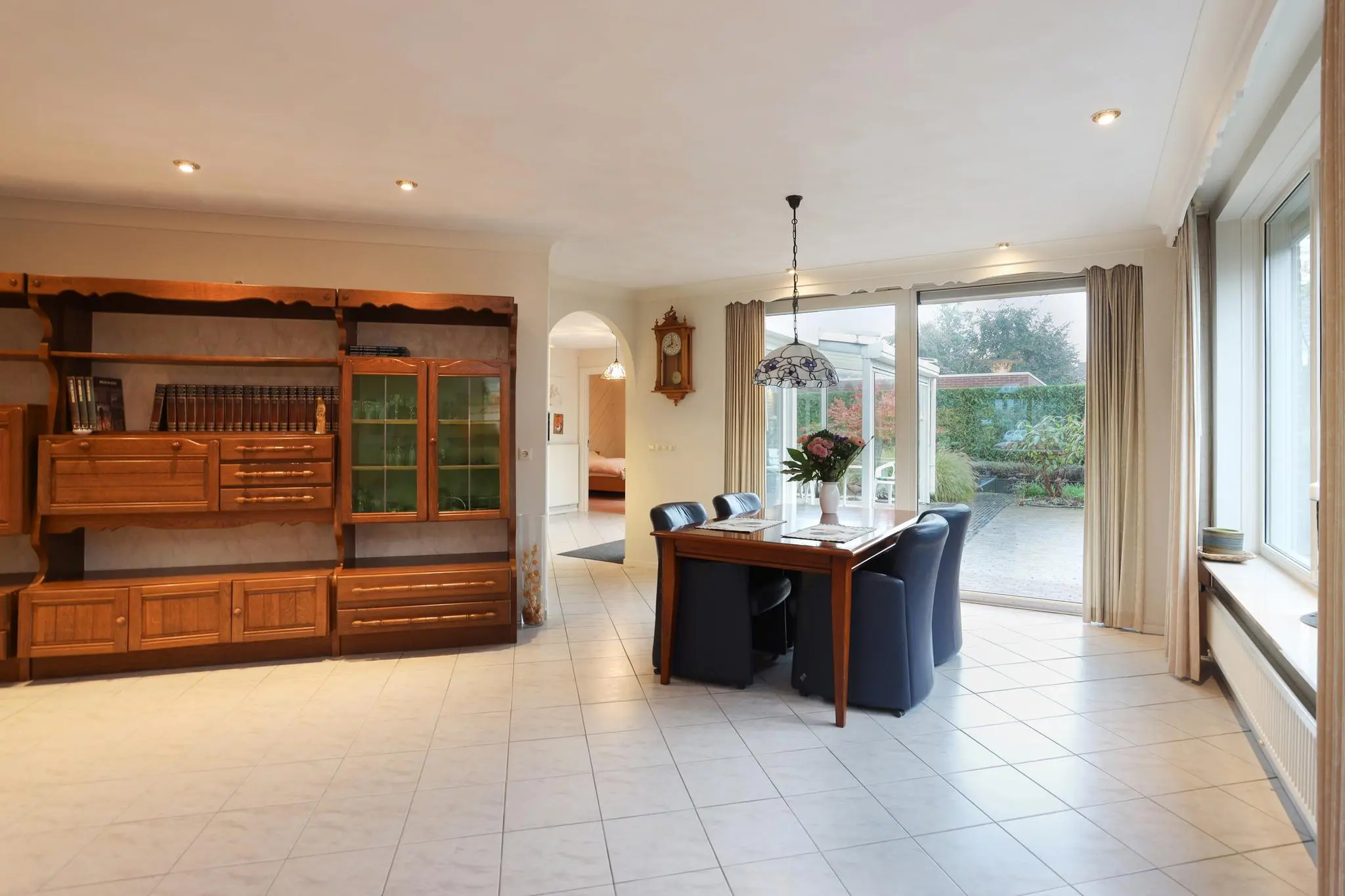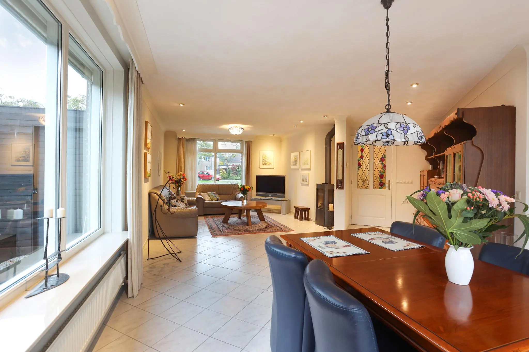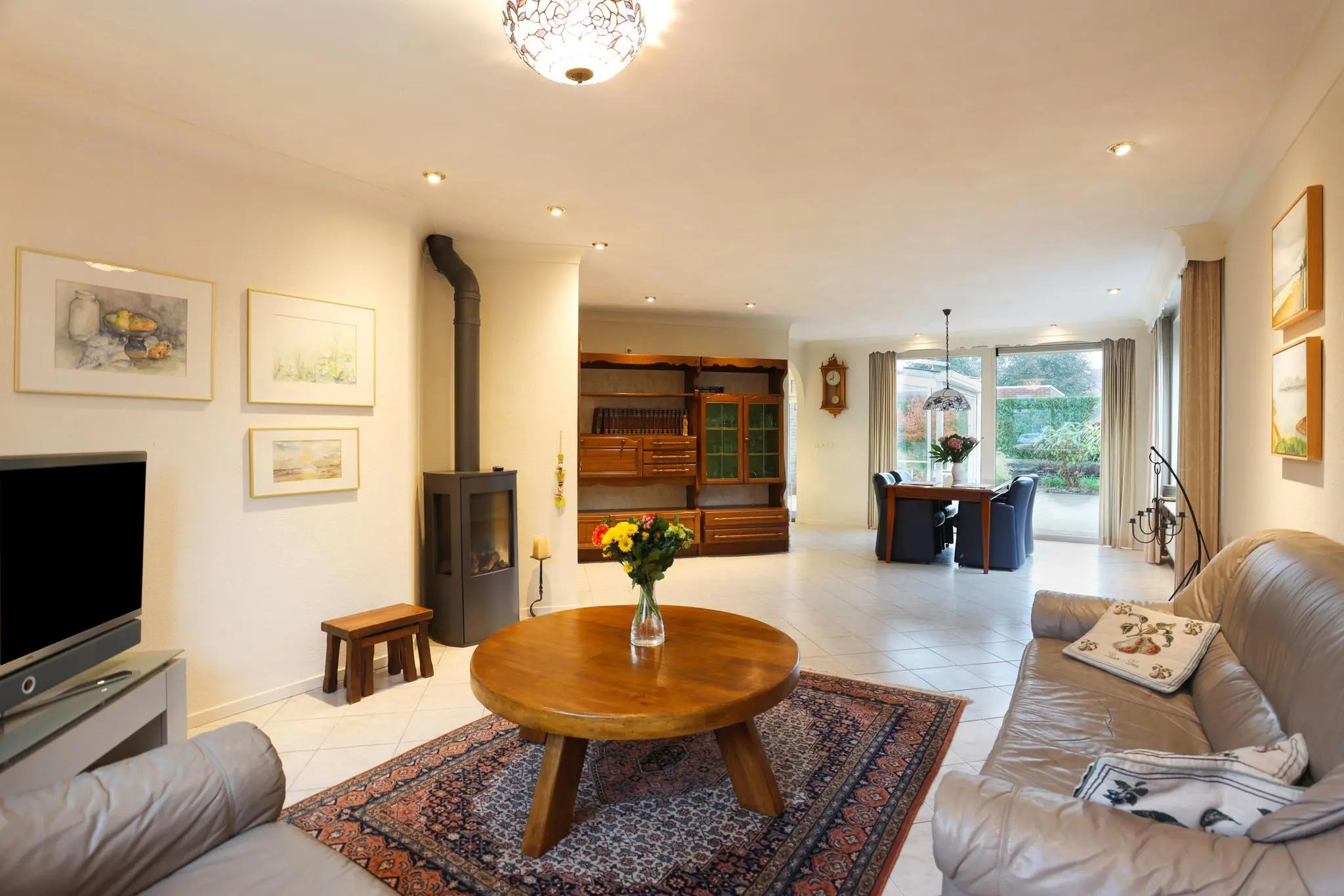 De riante woonkamer nodigt uit tot gezellige familieavonden of ontspannende momenten met vrienden. Het overvloedige daglicht en de open ruimte creëren een sfeer van warmte en gezelligheid.