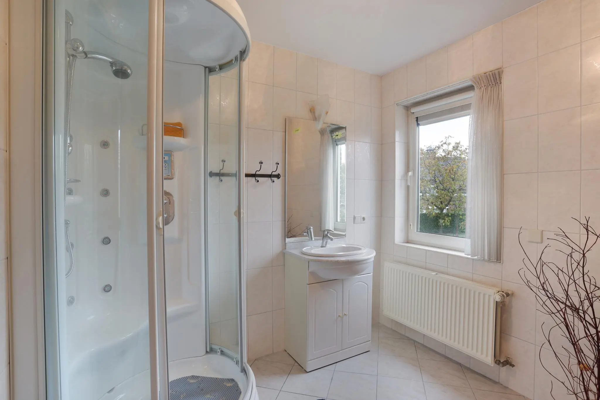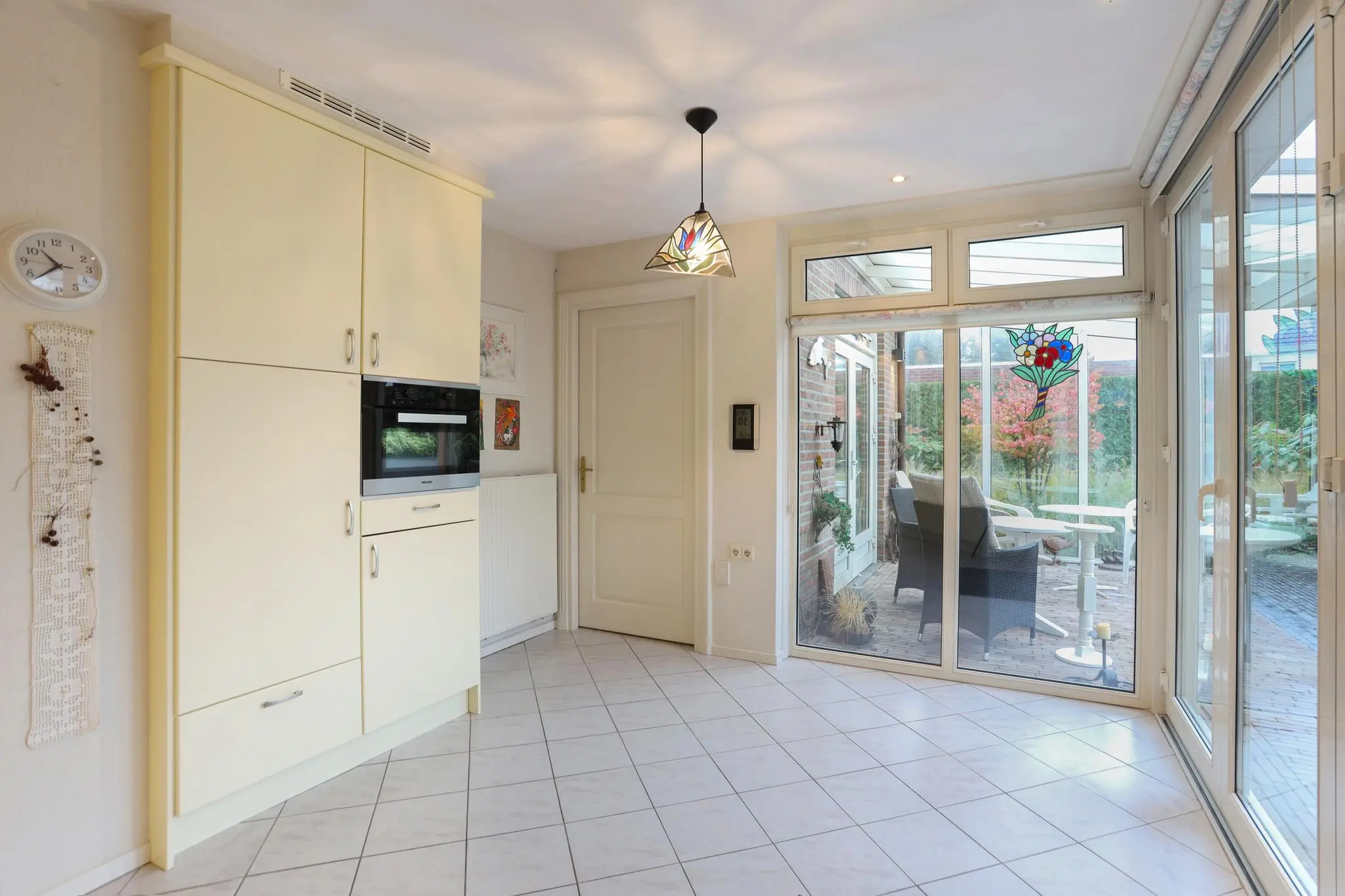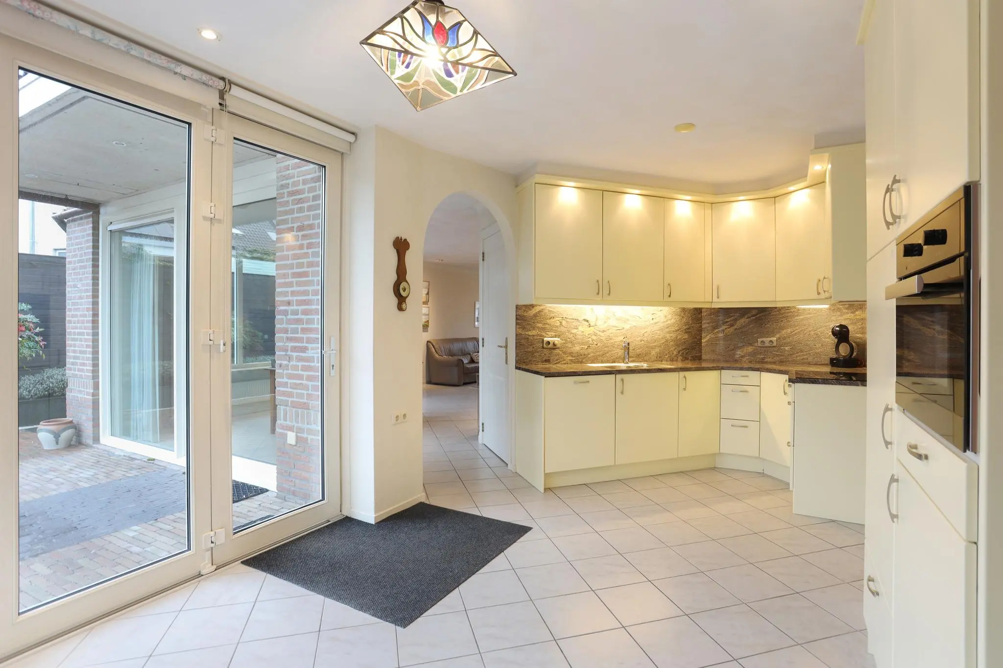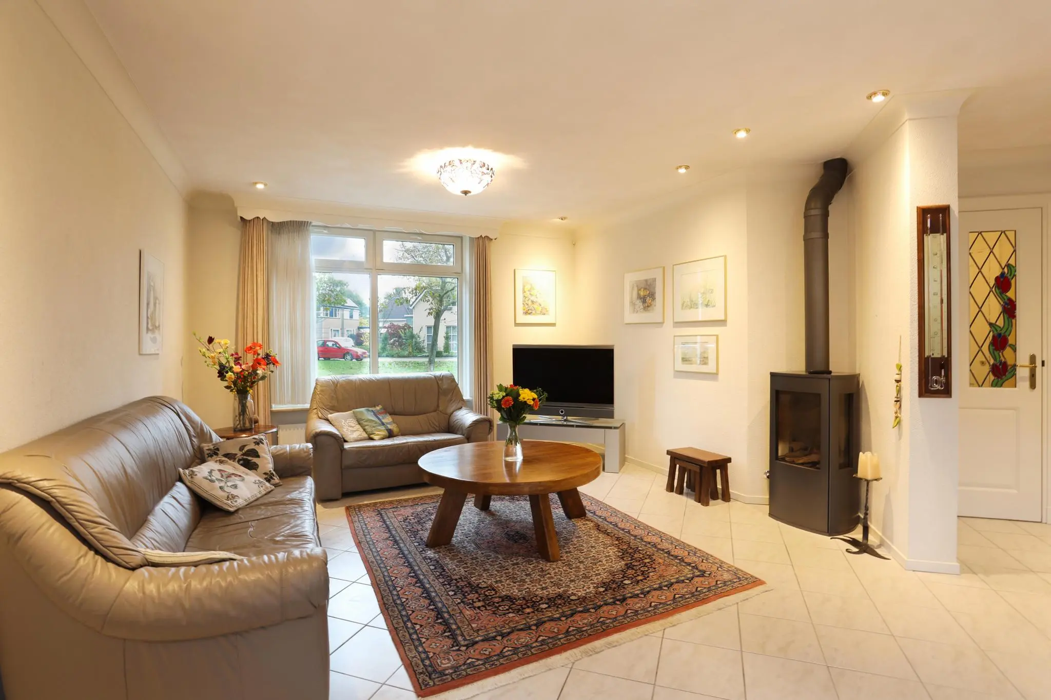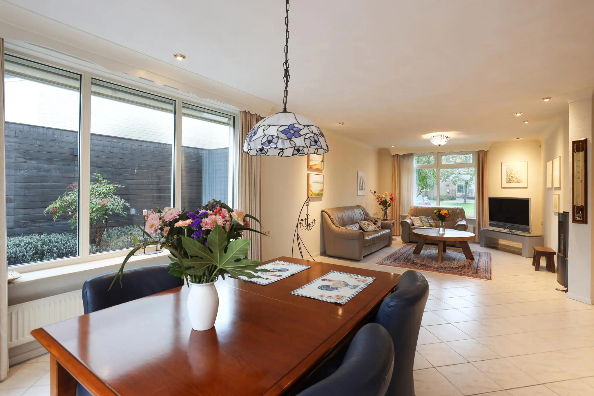 De riante woonkamer nodigt uit tot gezellige familieavonden of ontspannende momenten met vrienden. Het overvloedige daglicht en de open ruimte creëren een sfeer van warmte en gezelligheid.