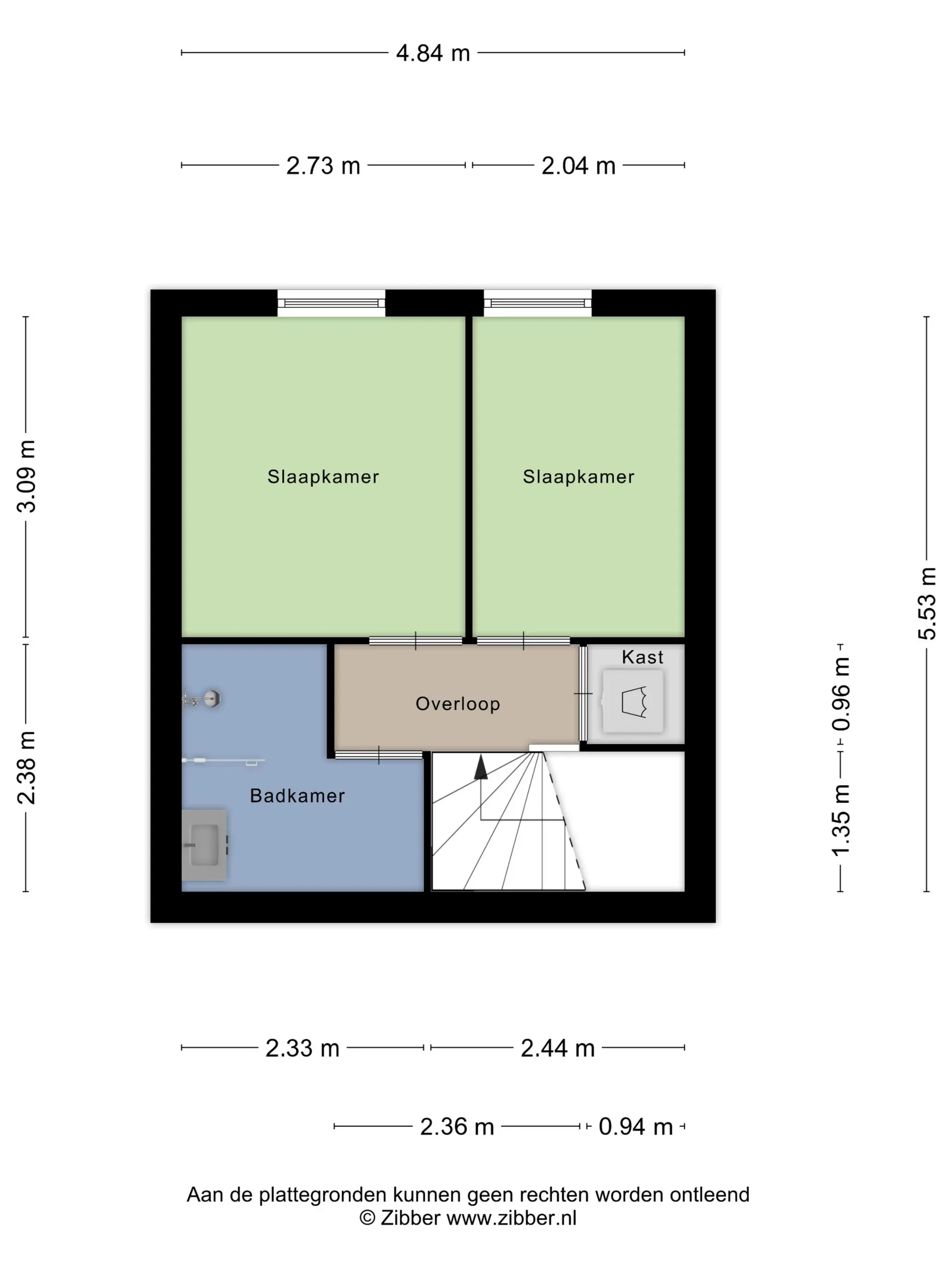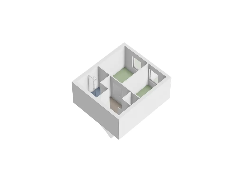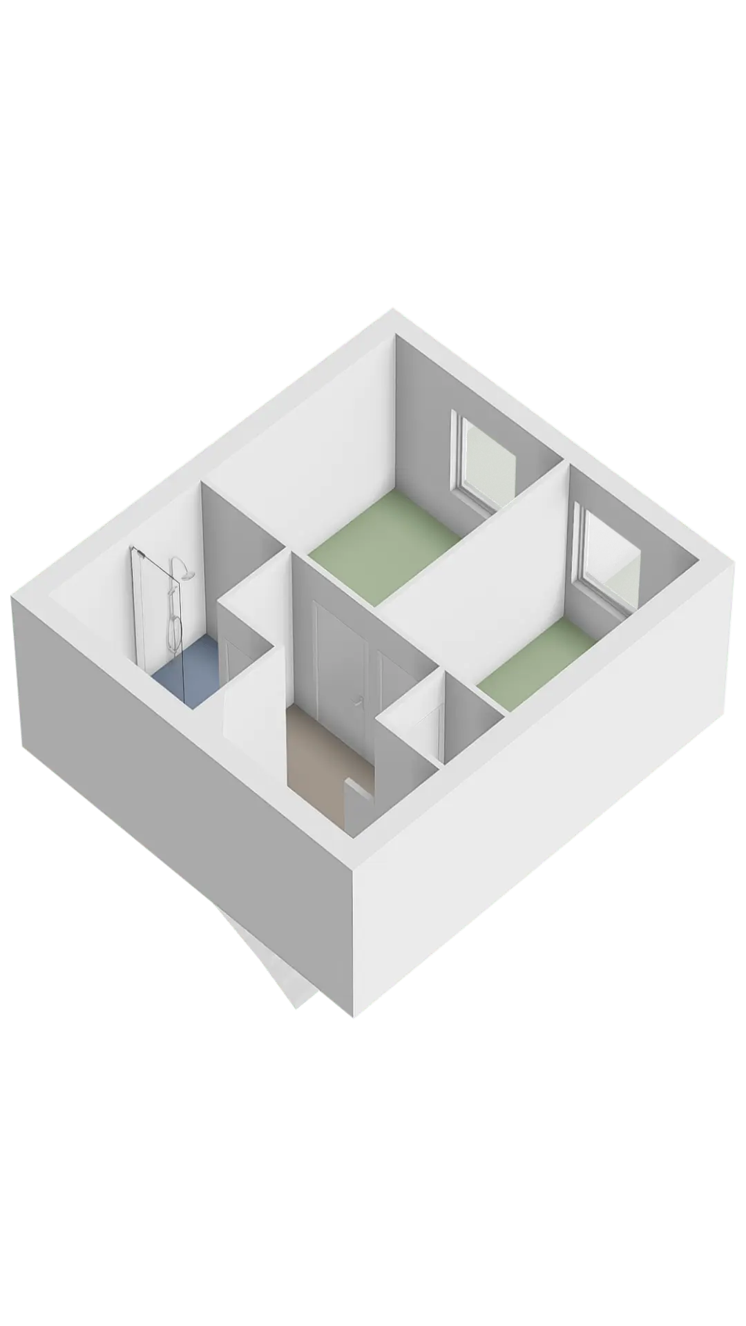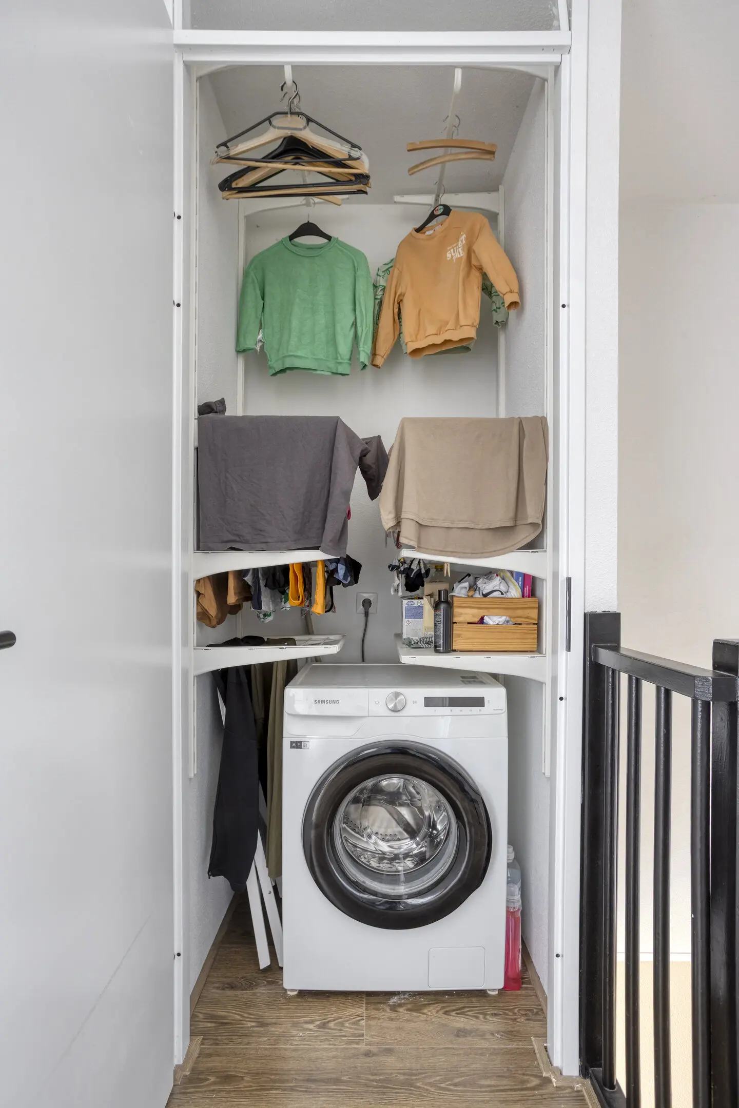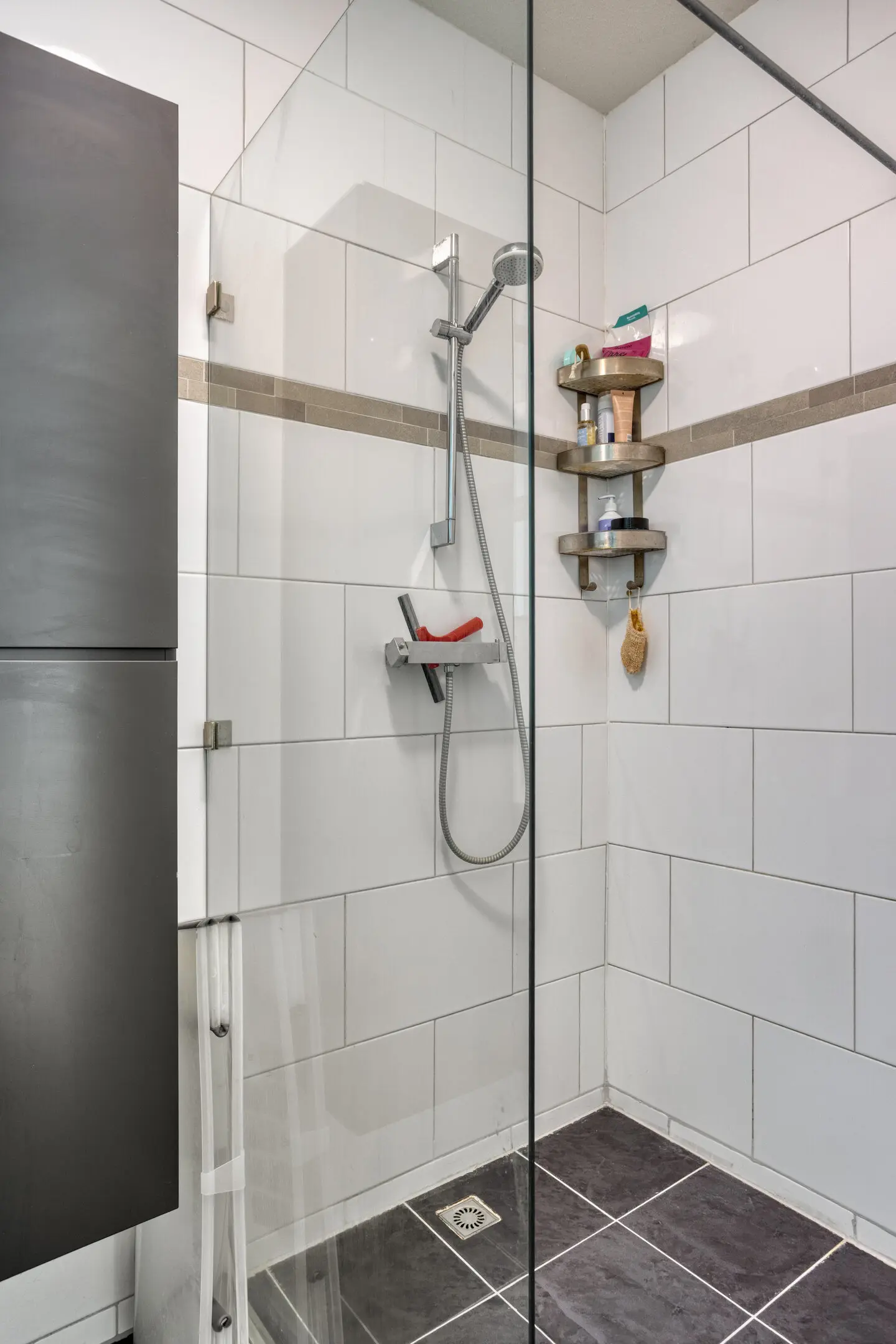 De overloop geeft toegang tot twee slaapkamers en de moderne badkamer, uitgerust met een inloopdouche, en wastafel. Op de overloop bevindt zich tevens een praktische vaste kast met de opstelplaats voor de wasmachine.