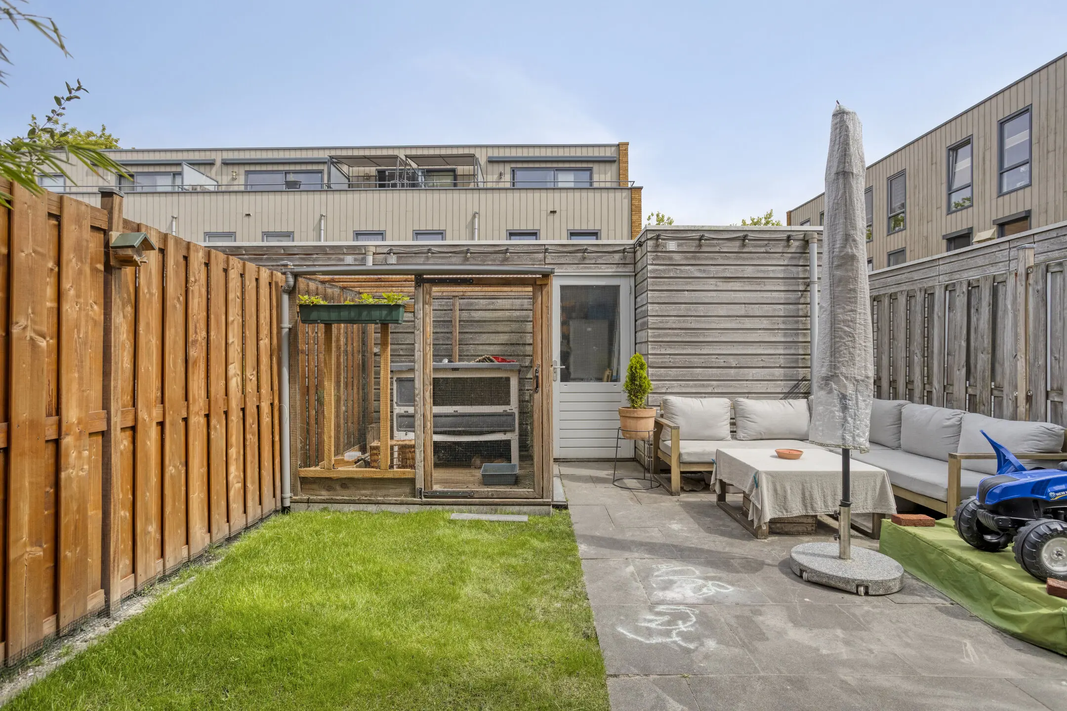 De achtertuin, gelegen op het noordwesten, is verzorgd aangelegd met bestrating en groenborders. Een heerlijke plek om te ontspannen, te borrelen of gezellig te barbecueën. Vanuit de tuin heb je toegang tot de berging en het achterpad dat leidt naar de privéparkeerplaats.