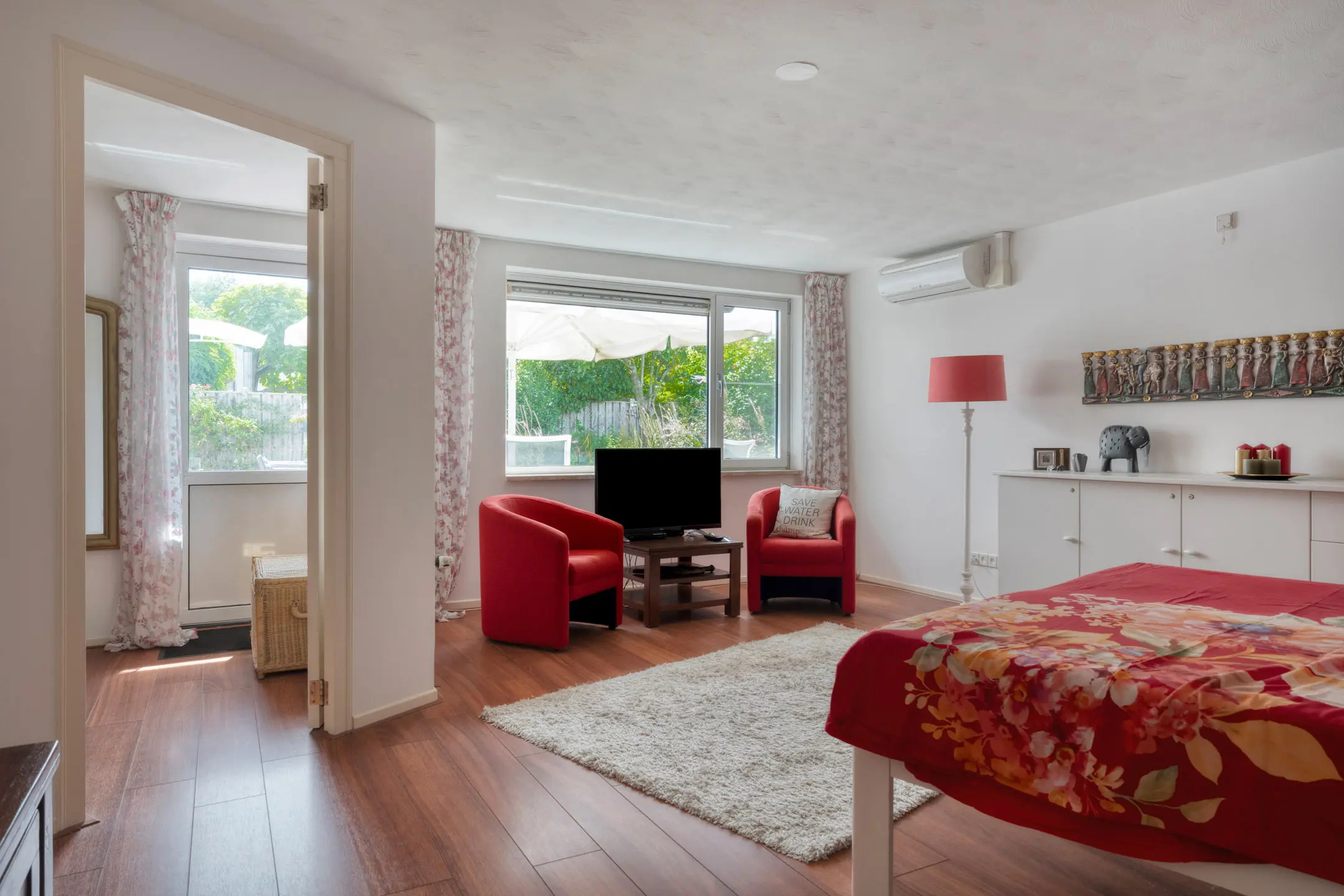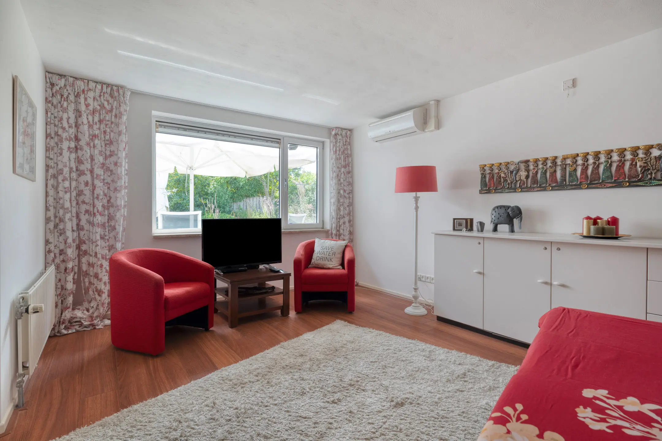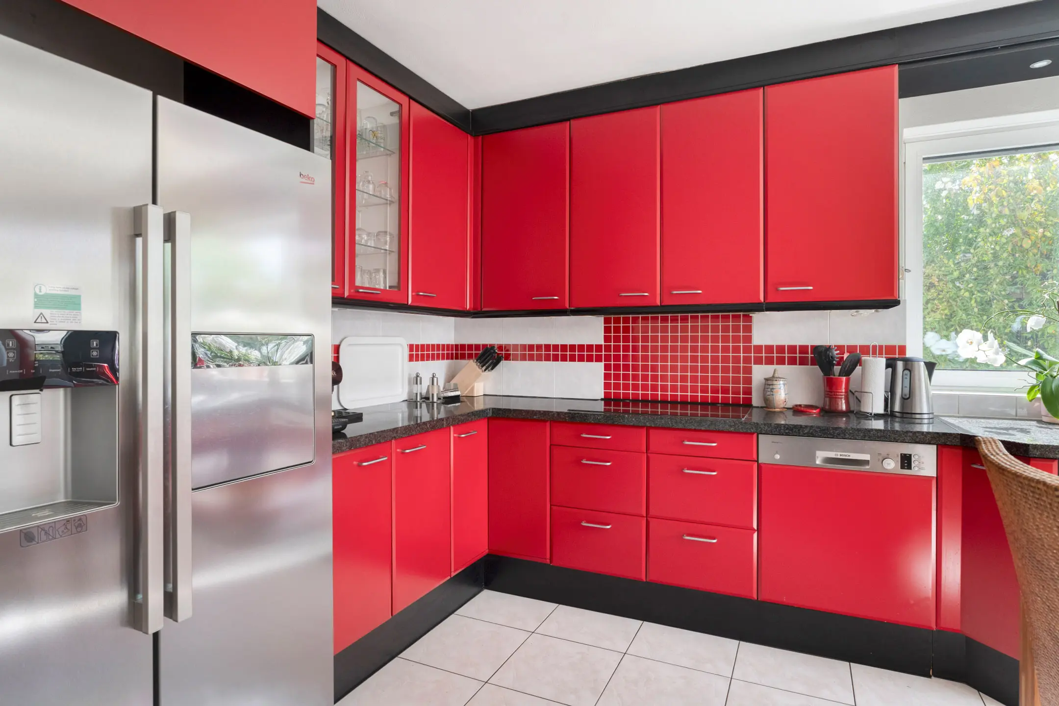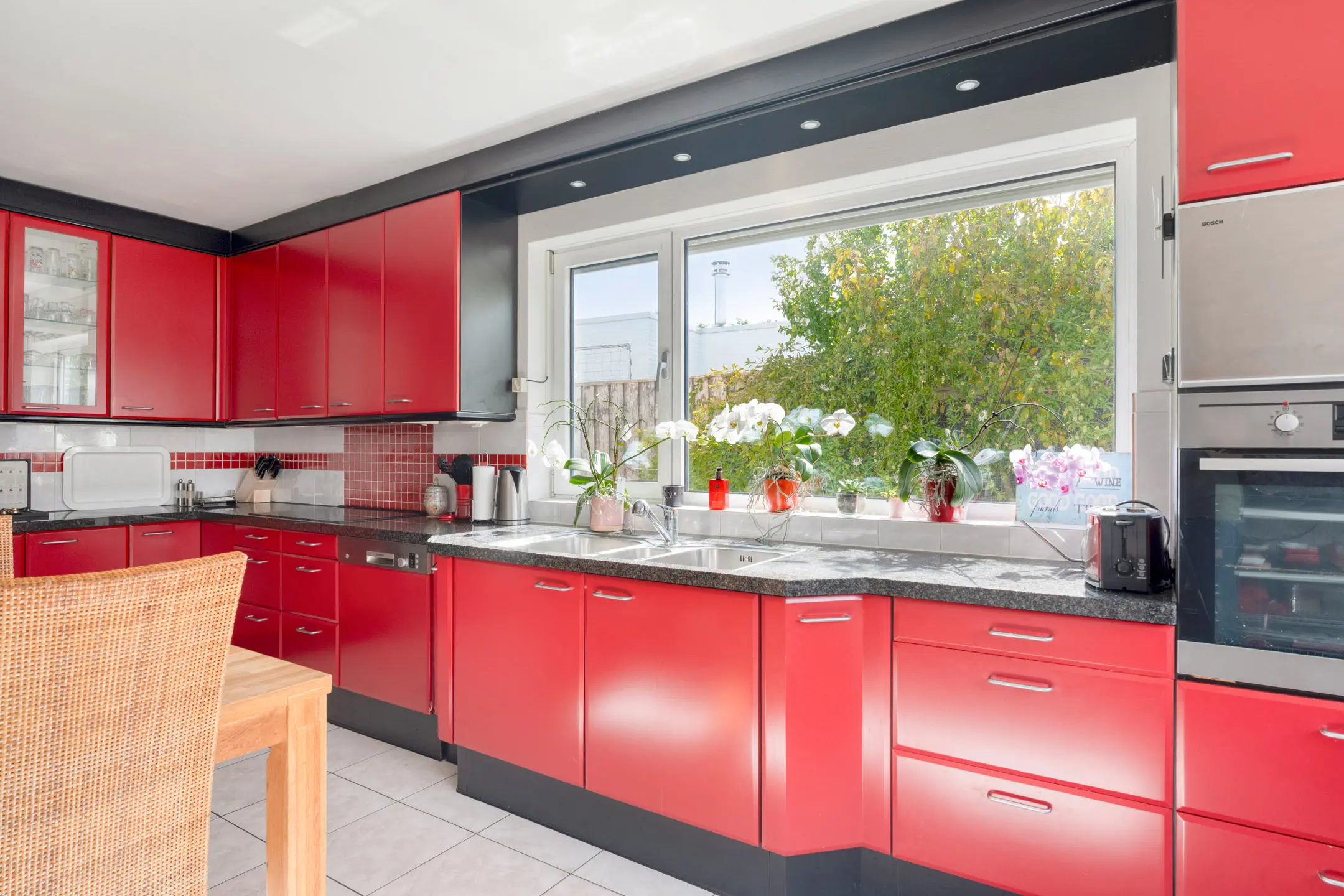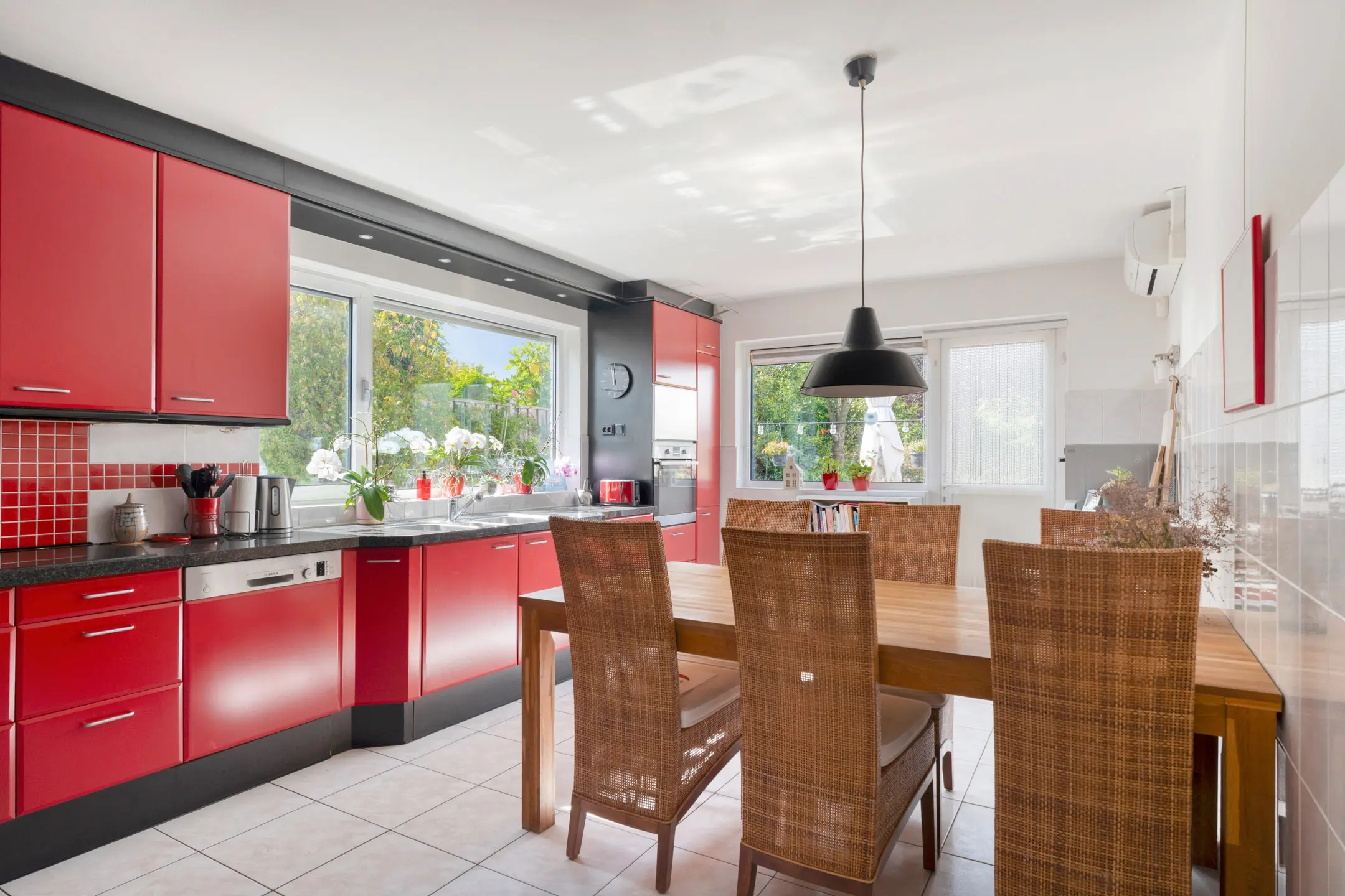 De ruime, moderne keuken is voorzien van een opvallende rode kleurstelling en is uitgerust met hoogwaardige inbouwapparatuur, zoals een vaatwasser, oven, inductieplaat, dubbele gootsteen, inbouwkoelkast, en een inbouwafzuigkap. Het raam boven het aanrechtblad biedt een prachtig uitzicht op de tuin, wat koken hier tot een waar genoegen maakt. Bovendien is er voldoende ruimte voor een grote eettafel, zodat u samen met het gezin of vrienden kunt genieten van maaltijden in een open, gezellige sfeer.