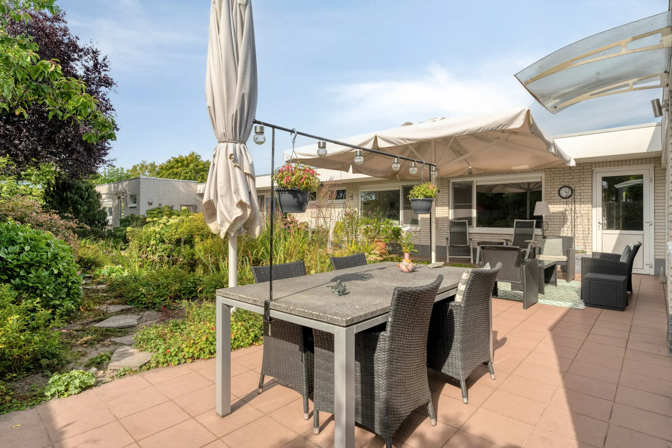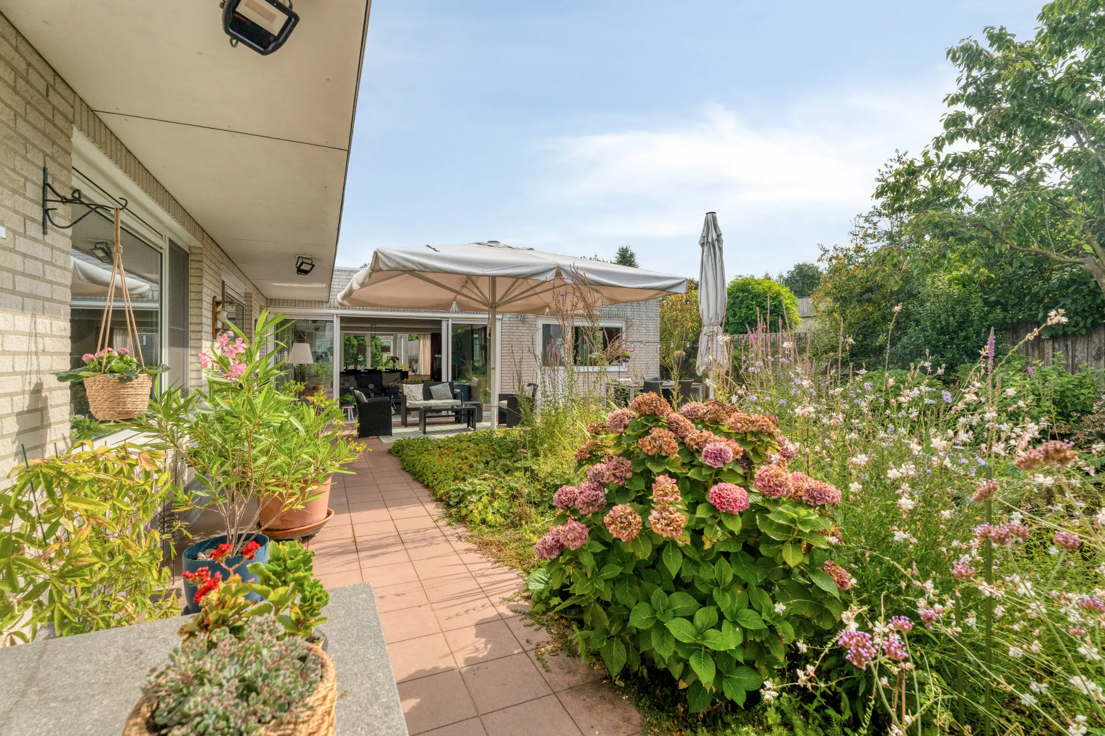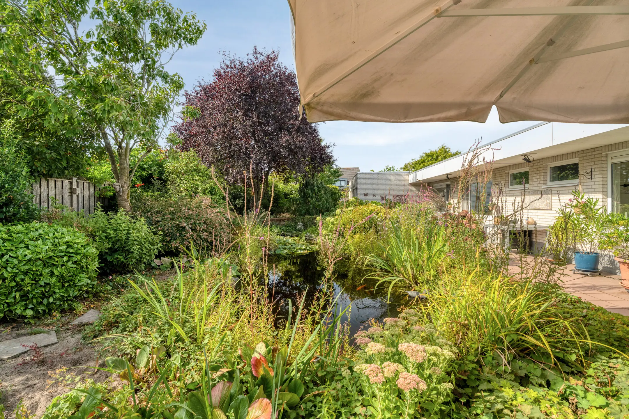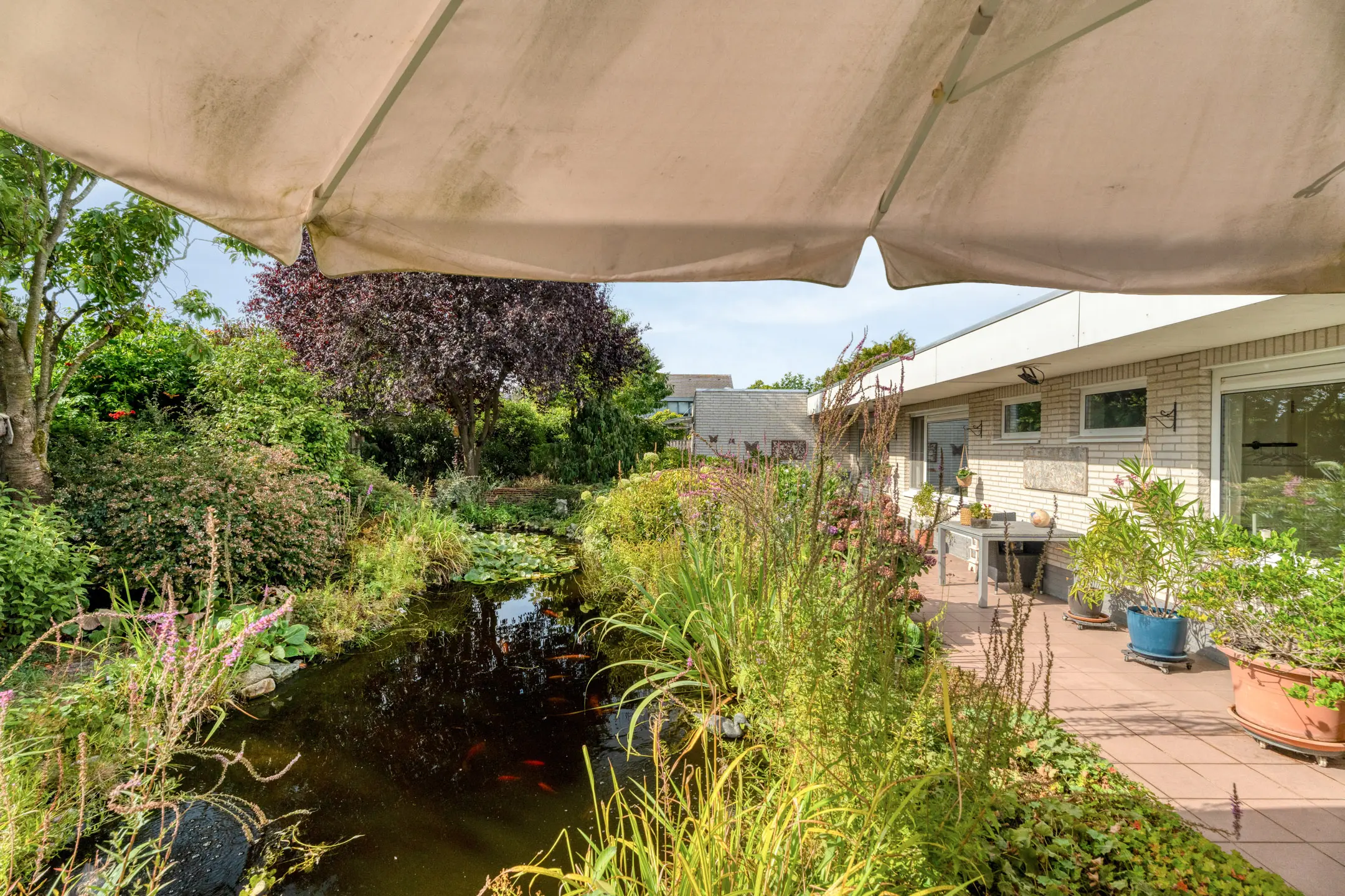 De buitenruimte is een ware oase van rust. De achtertuin is fraai aangelegd en biedt volop privacy. Het grote terras, voorzien van twee ingebouwde parasols van 4x4 meter, biedt aangename schaduw en is ideaal voor het buitenleven. De parasols zijn stevig in de grond verankerd en beschermen u tegen de zon. In het midden van de tuin vindt u een sierlijke vijver die zorgt voor een luxe uitstraling en een ontspannende sfeer. Dankzij de gunstige ligging kunt u hier vrijwel de hele dag genieten van de zon.
