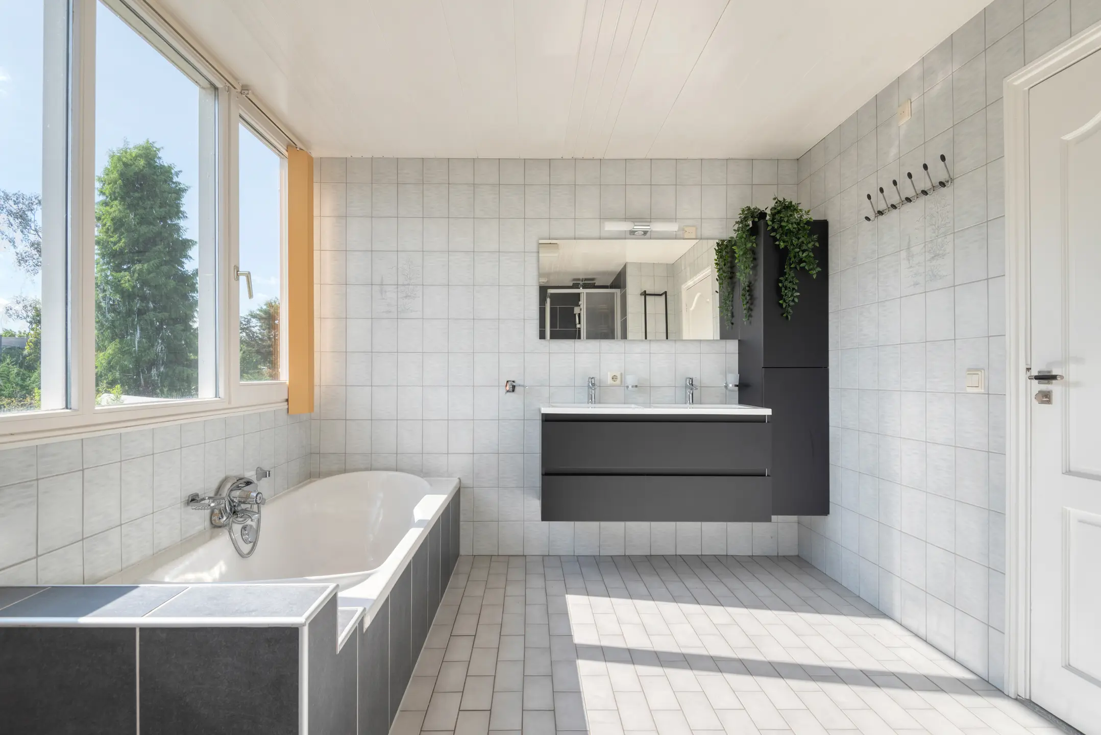 De badkamer (origineel uit 1992) is netjes onderhouden en voorzien van een ligbad, aparte douche, wastafel en toilet.