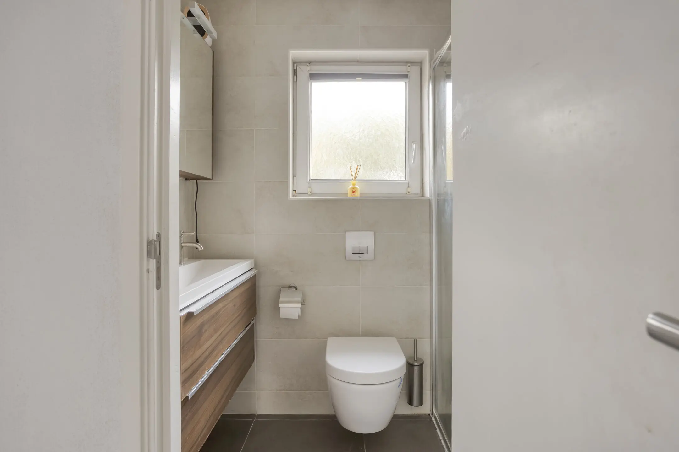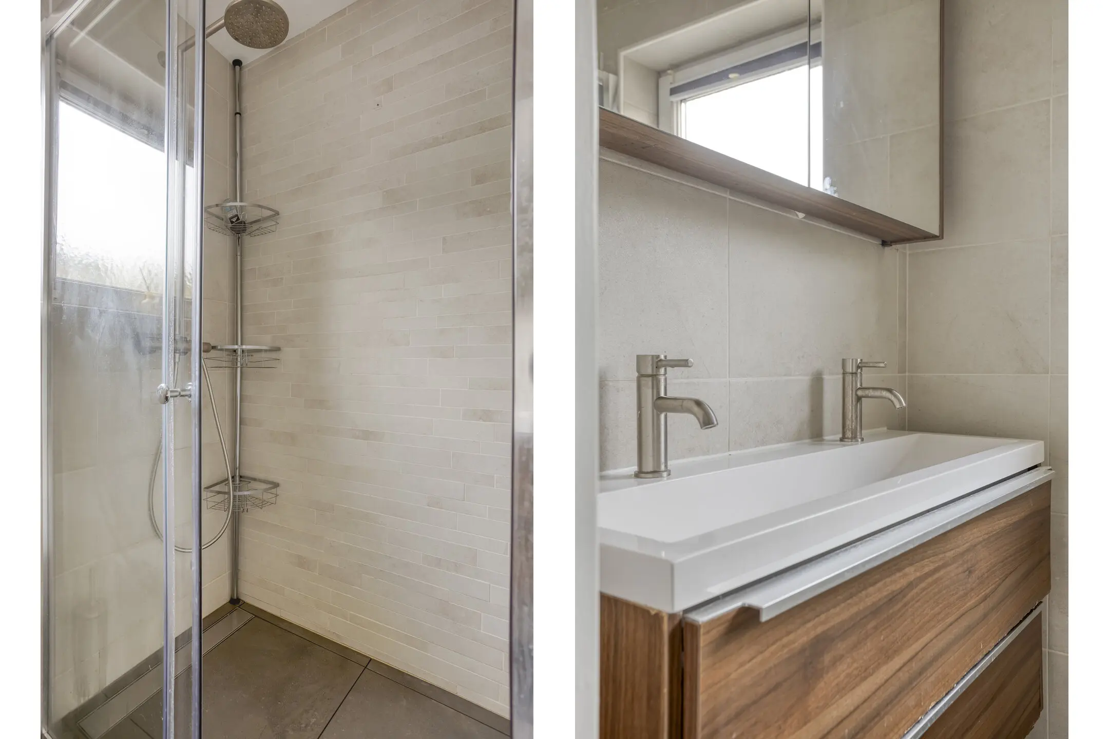 Op de eerste verdieping bevinden zich drie slaapkamers, allemaal voorzien van laminaatvloeren, wat zorgt voor een warme en uniforme uitstraling door het hele huis. De badkamer is modern en stijlvol ingericht met een inloopdouche, hangtoilet en een grote dubbele wastafel met meubel – ideaal voor het hele gezin.
