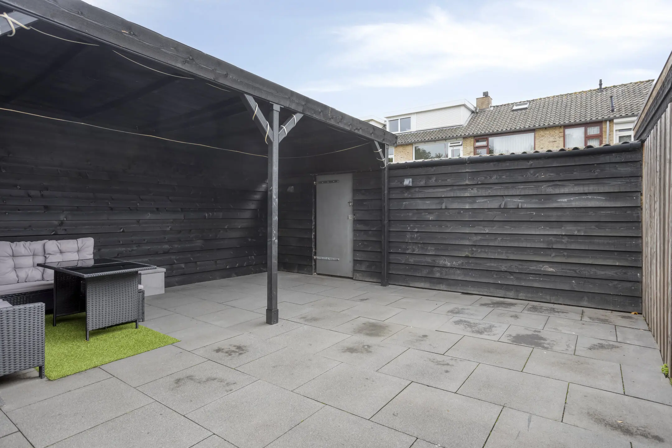 De zonnige tuin ligt op het zuiden en beschikt over een overkapping, waardoor je ook op minder zonnige dagen van buiten kunt genieten. Het vrije uitzicht over het water maakt de tuin compleet.