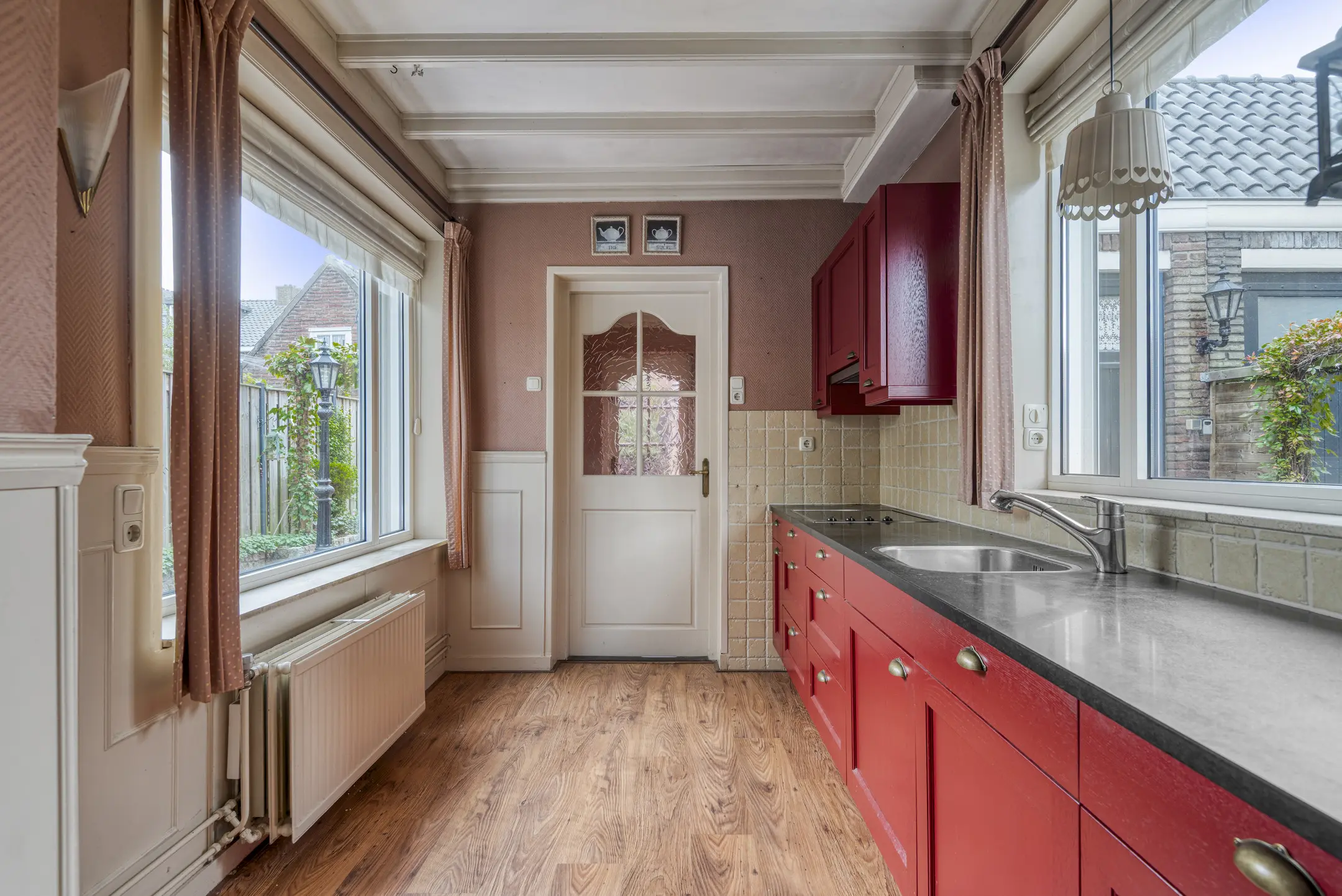De keuken is aan de achterzijde gelegen en beschikt over diverse inbouwapparatuur. De keuken is onder andere voorzien van een afzuigkap, een kookplaat en een vaatwasser.