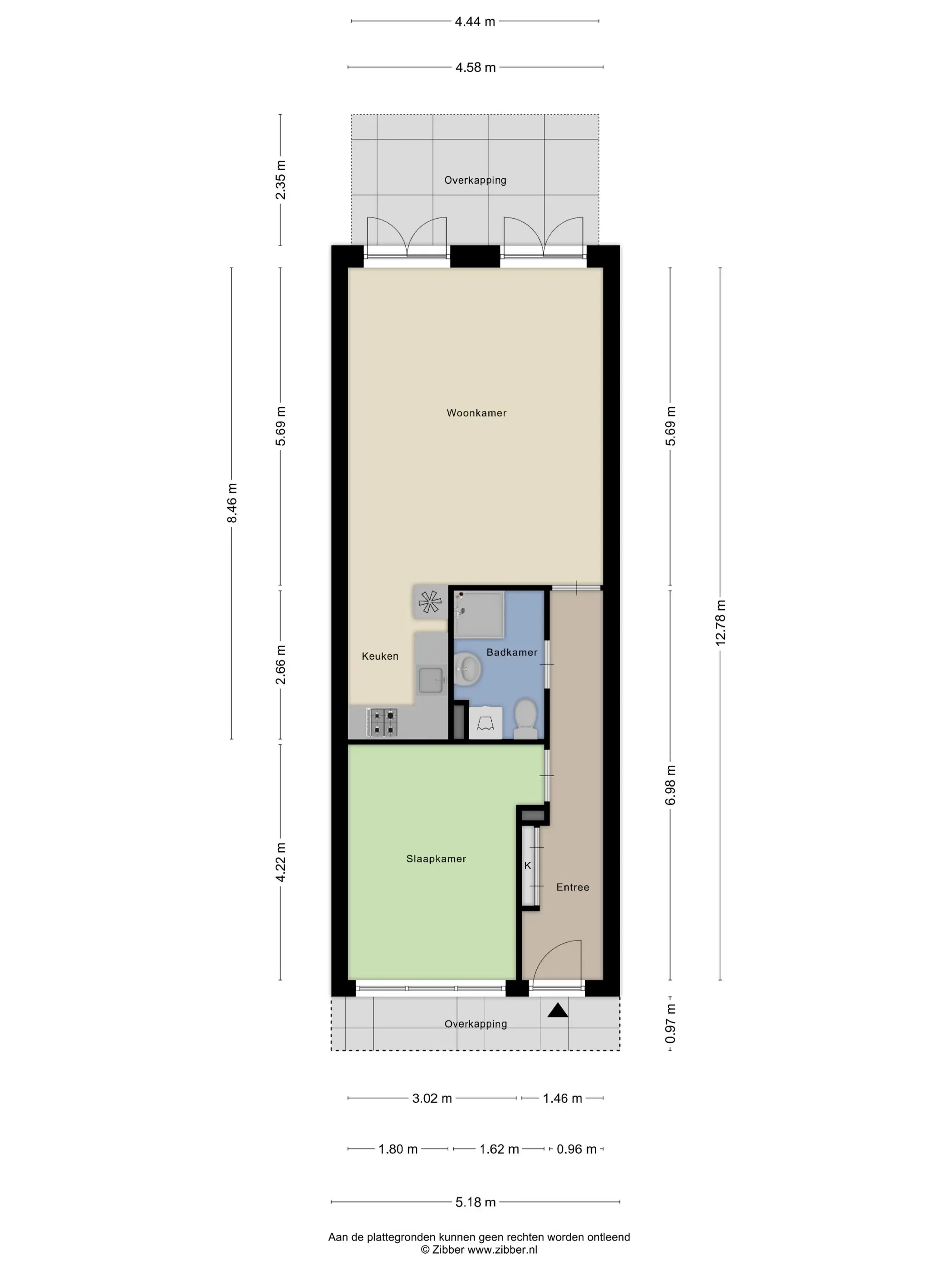 Je betreedt de woning via een eigen overdekte entree aan de voorzijde van het complex, waardoor je niet via een centrale hoofdingang hoeft. Direct binnen kom je in een lange gang met laminaatvloer en praktische inbouwkasten. Vanuit deze gang zijn de slaapkamer, badkamer en woonkamer bereikbaar.