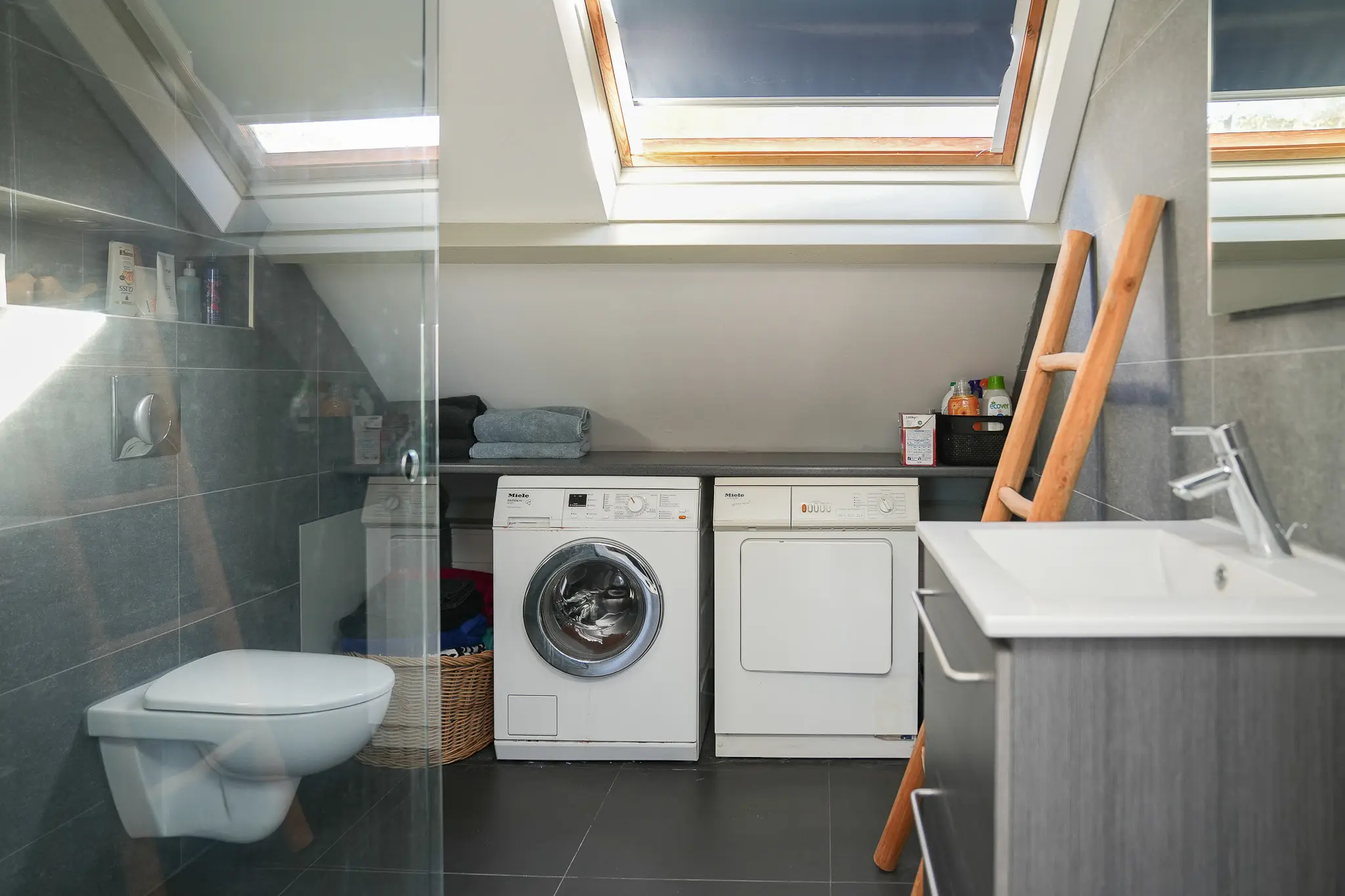 De tweede verdieping biedt nog een extra kamer en een tweede badkamer met inloopdouche, wastafel en toilet. Een perfecte verdieping voor gasten, een thuiskantoor of een tienerkamer met eigen voorzieningen.