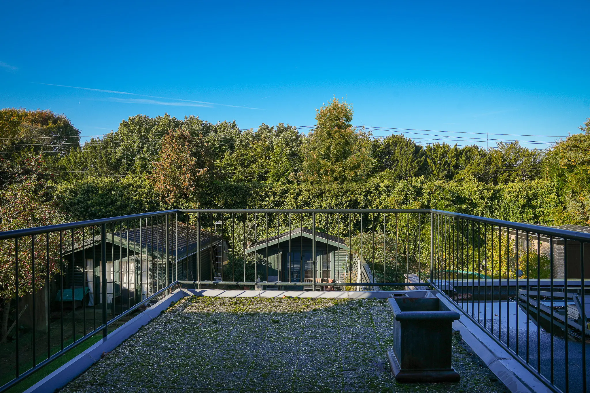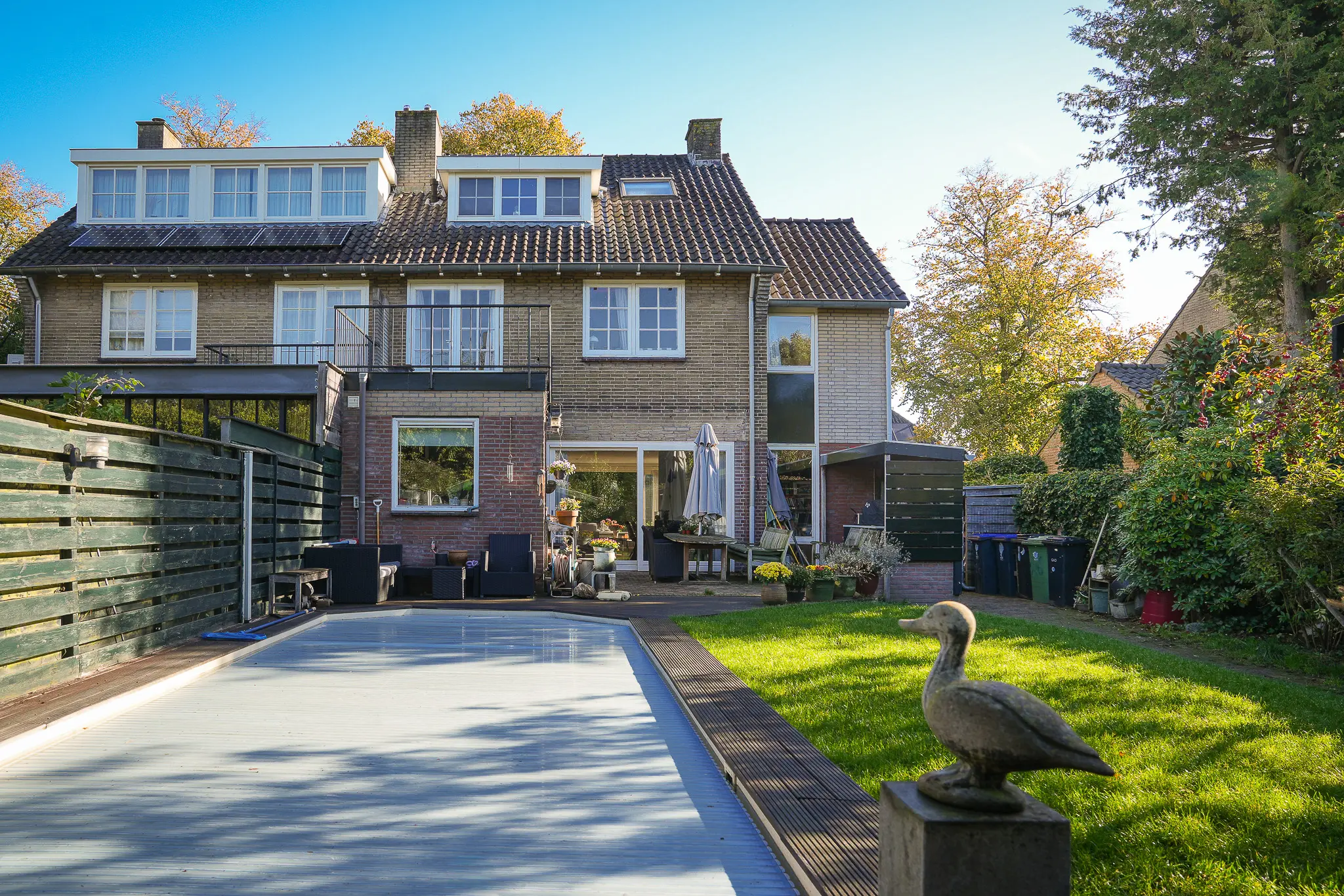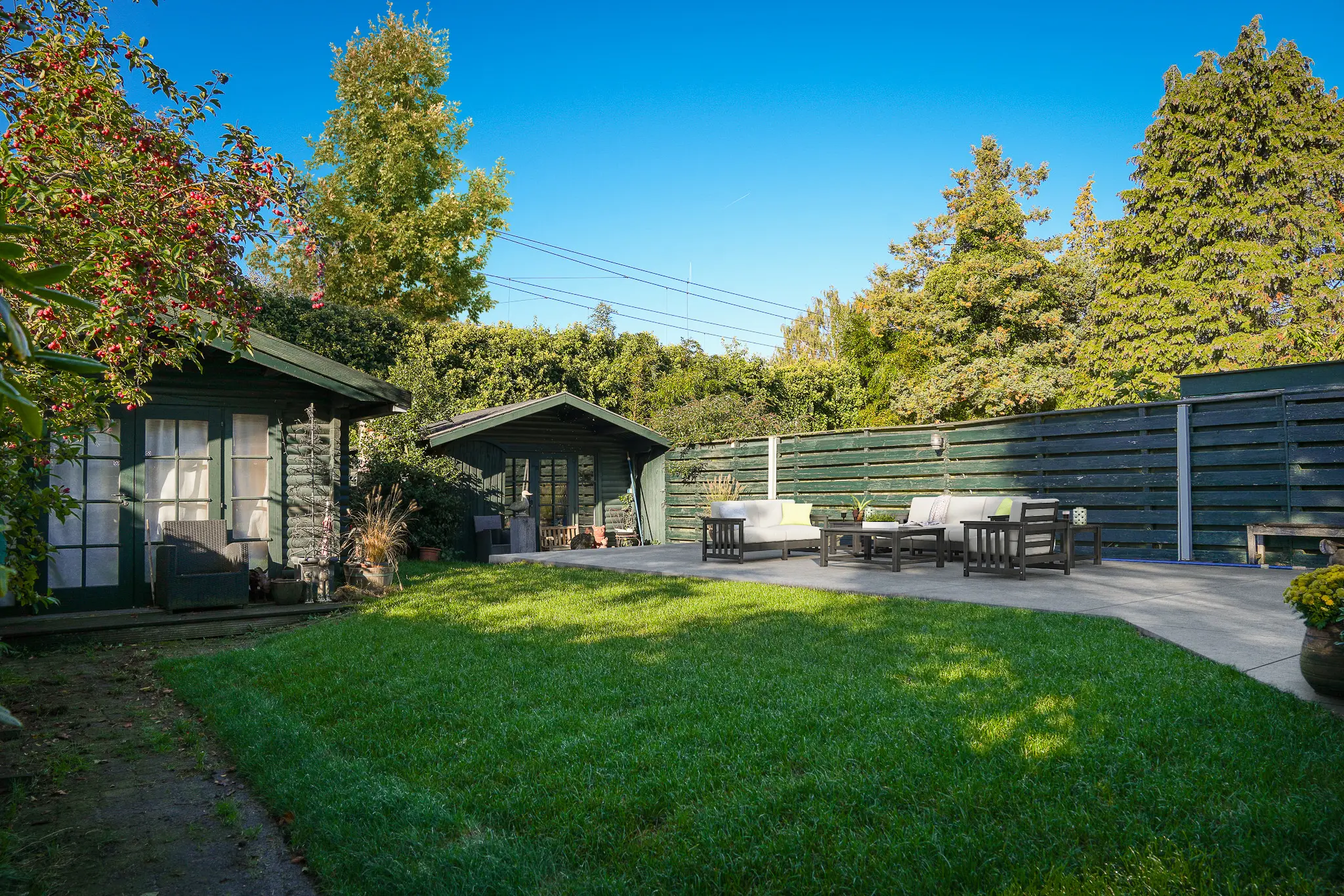 De achtertuin is werkelijk een verlengstuk van het woongenot. Gelegen op het zuiden, met volop zon en privacy, een zwembad en een jacuzzi als echte blikvangers. Het zwembad is voorzien van een elektrisch bedienbare solardek, pomphuis met glasfilterinstallatie en verlichting. Daarnaast zijn er meerdere zitgedeeltes en twee tuinhuisjes, het grote tuinhuis kan gebruikt worden als kantoorruimte, deze beschikt over een eigen toilet, wateraansluiting en een eigen verwarmingsketel (2020). Het kleinere tuinhuis is voorzien van opslagruimte en de 5 persoons jacuzzi. De oprit aan de voorzijde biedt ruimte voor twee auto’s.