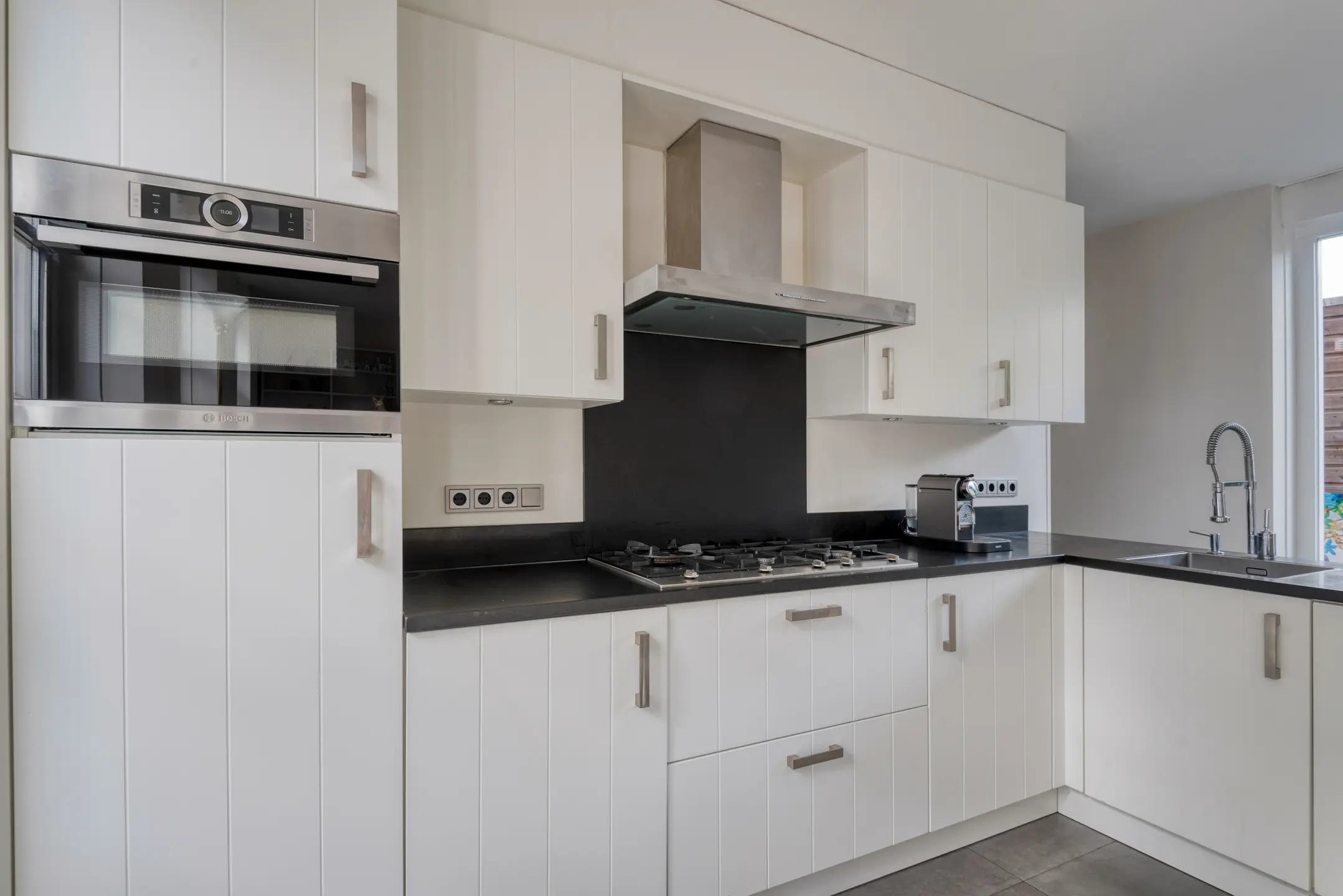 De open keuken is modern uitgevoerd en beschikt over diverse inbouwapparatuur. Ideaal om gezellig te koken en tegelijkertijd contact te houden met gezinsleden of gasten. De keuken is voorzien van onder andere een kookplaat, oven, vaatwasser, koelkast en een kokend waterkraan.
