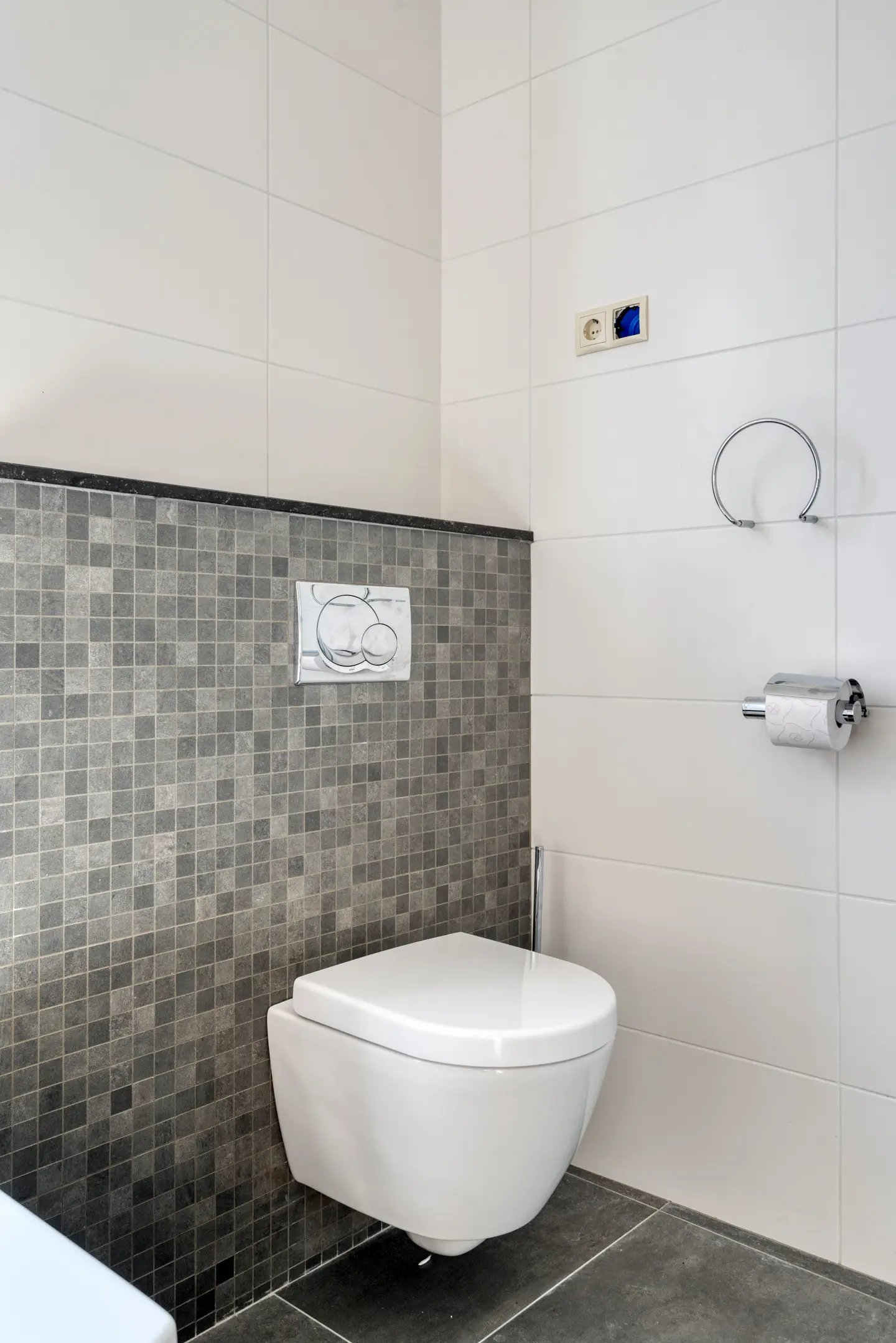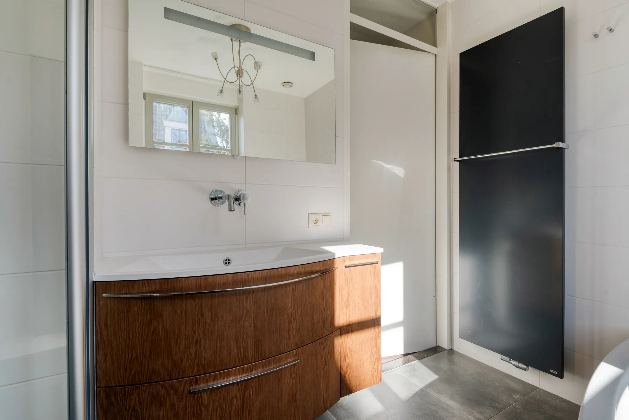 Moderne badkamer voorzien van een ligbad, wastafel met wastafelmeubel, hangtoilet en een douche. De badkamer is goed onderhouden en netjes verzorgd.