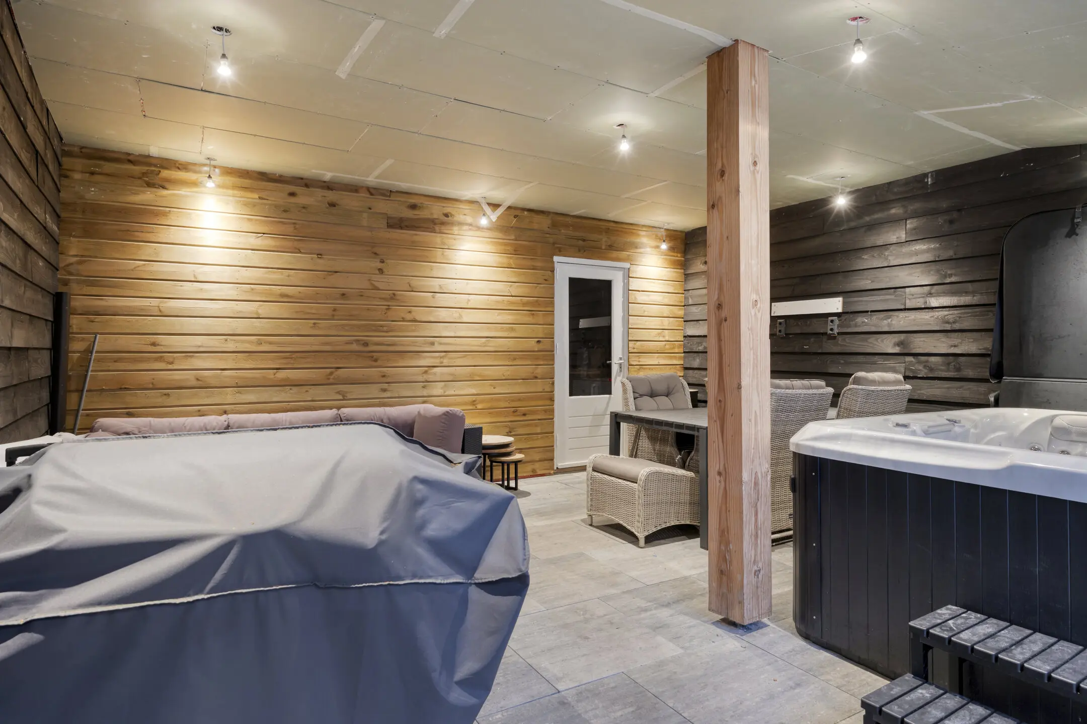 De achtertuin is modern en onderhoudsvriendelijk aangelegd en deels betegeld. Achterin de tuin bevindt zich een grote, hoogwaardige overkapping die momenteel is ingericht als wellness- en relaxruimte, compleet met jacuzzi, loungehoek, eettafel en ruimte voor een barbecue. Dankzij de glazen schuifwanden is deze ruimte volledig afsluitbaar en het hele jaar door te gebruiken.