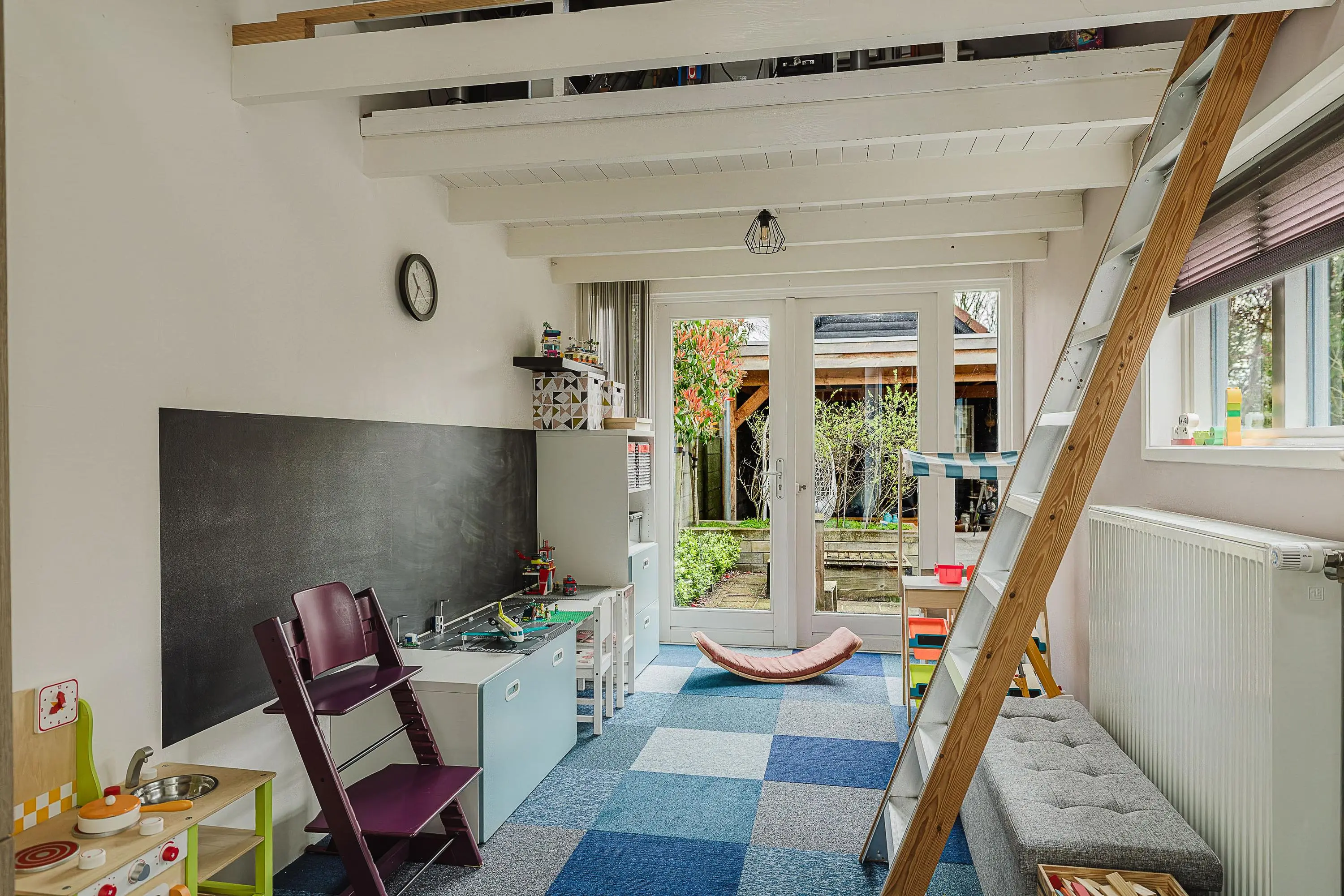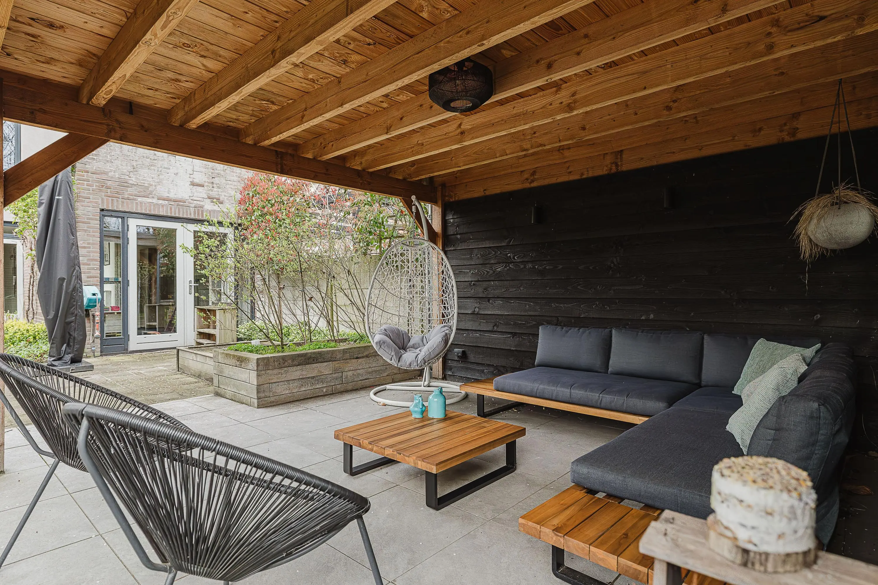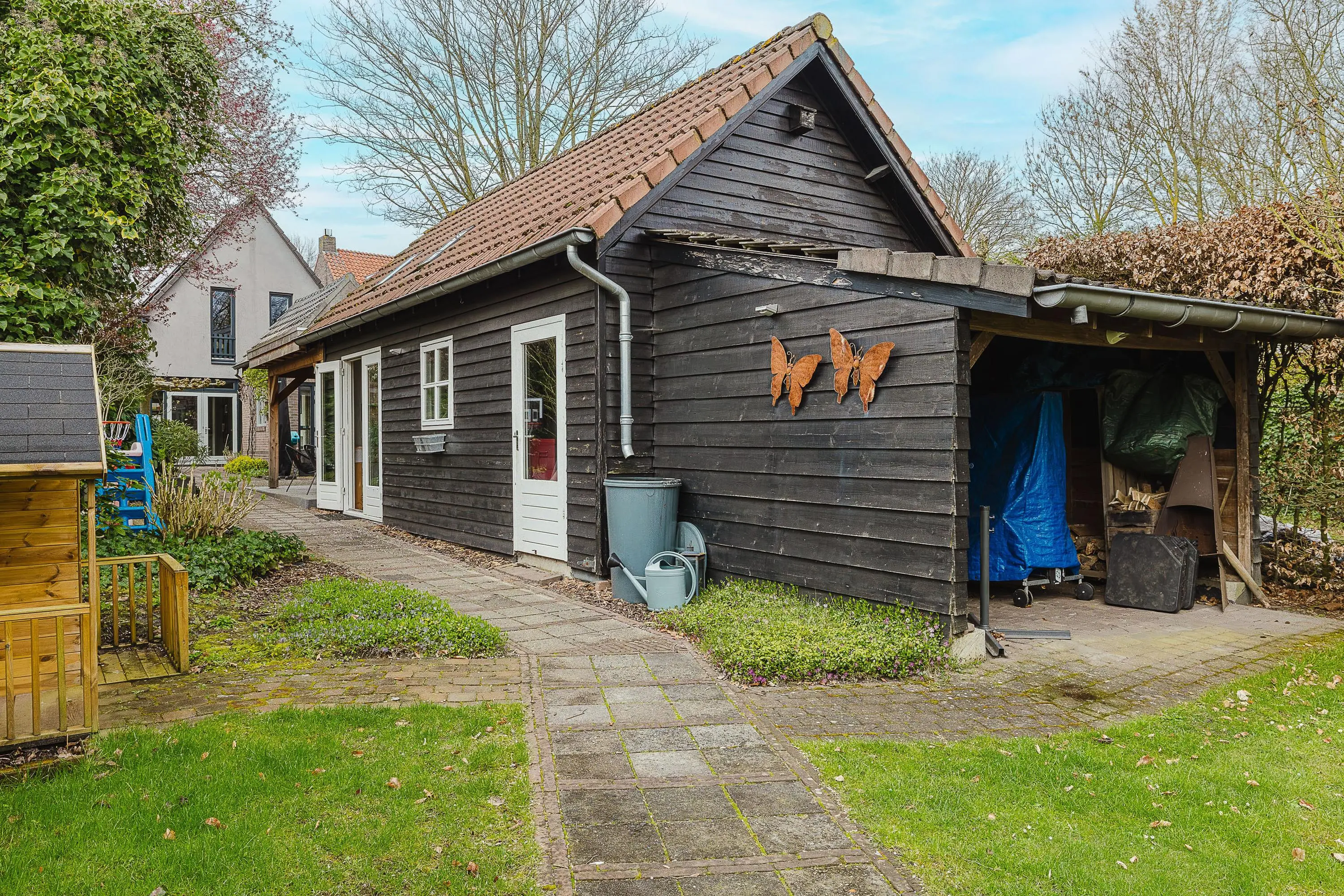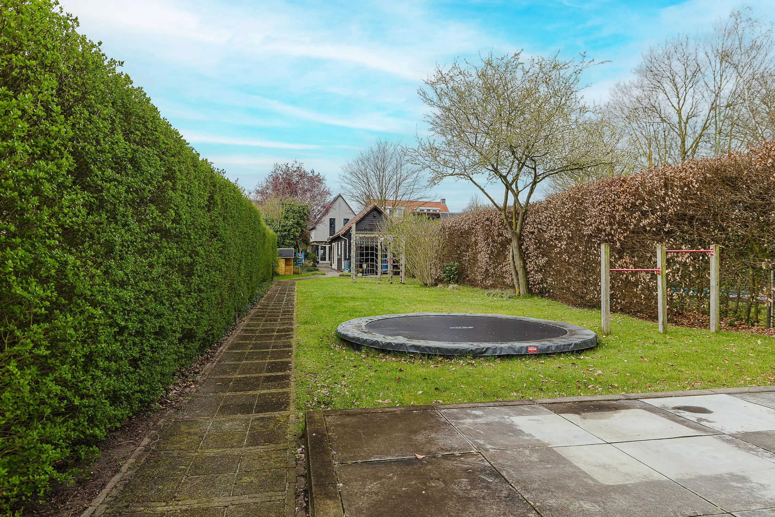 Via de openslaande deuren in de eetkamer en speelkamer betreed je de zeer diepe tuin van circa 650 m². De tuin beschikt over een overkapping bij de grote vrijstaande berging, die is opgedeeld in twee delen en voorzien is van elektra en een bergvliering. In de tuin bevinden zich meerdere grondwatertappunten. Zowel aan de voor- als achterzijde van de tuin kun je het perceel verlaten via een poort.