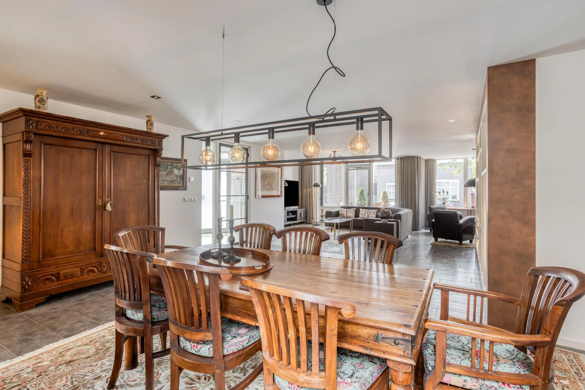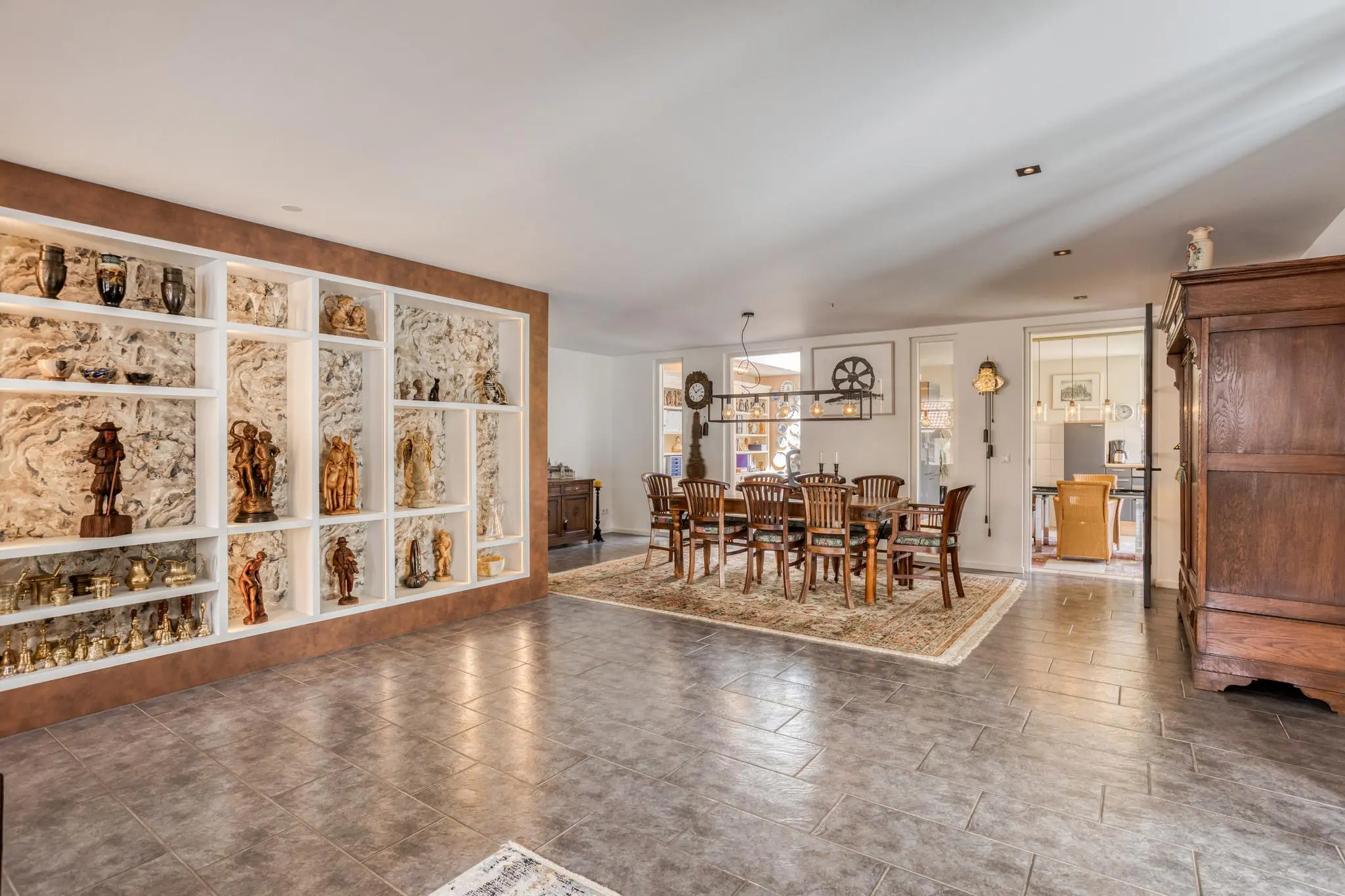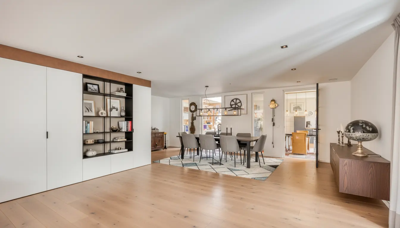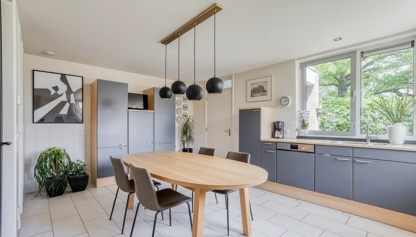 Eetkamer in het hart van de woning – open maar beschut, met doorkijk naar de keuken