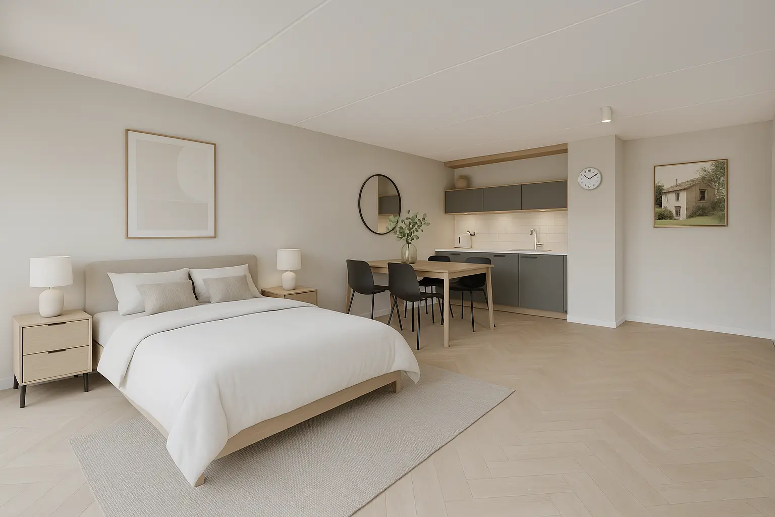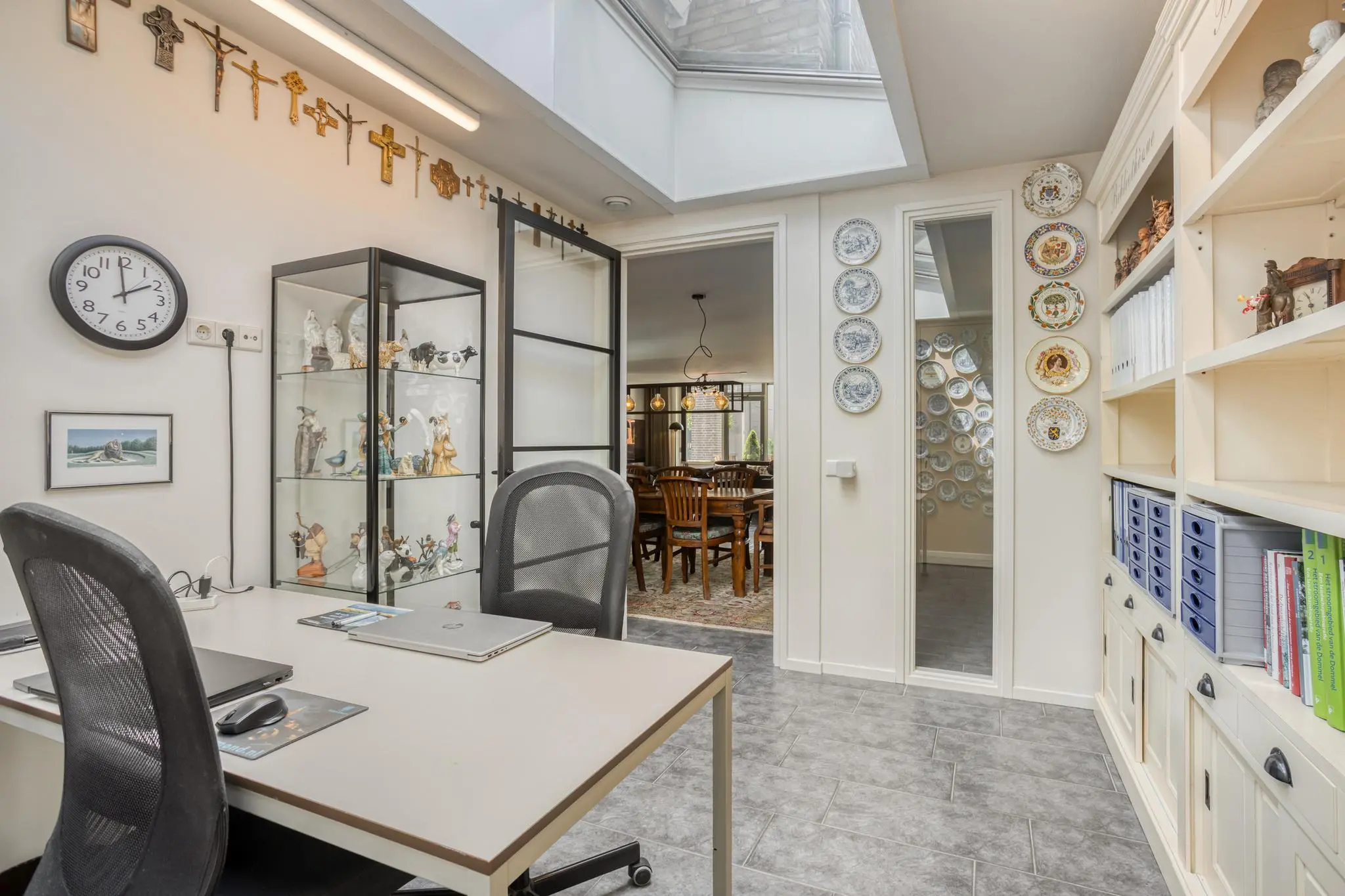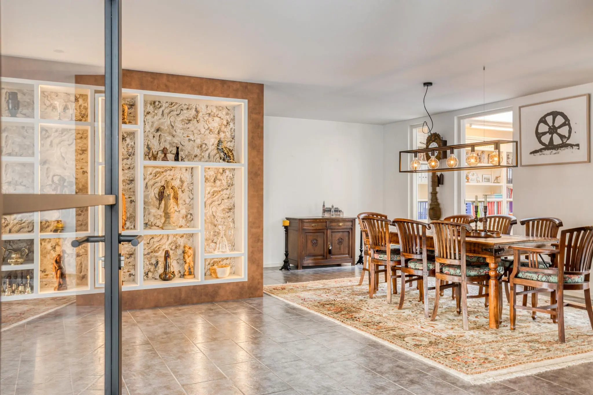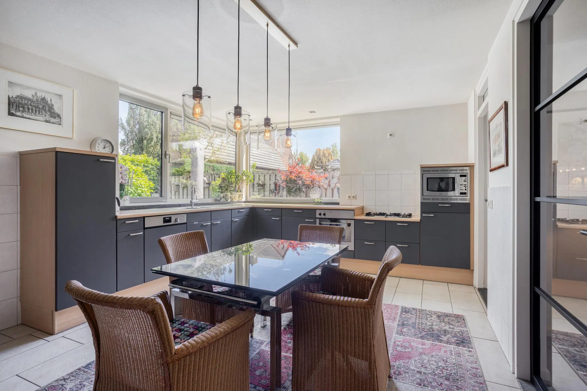 Eetkamer in het hart van de woning – open maar beschut, met doorkijk naar de keuken