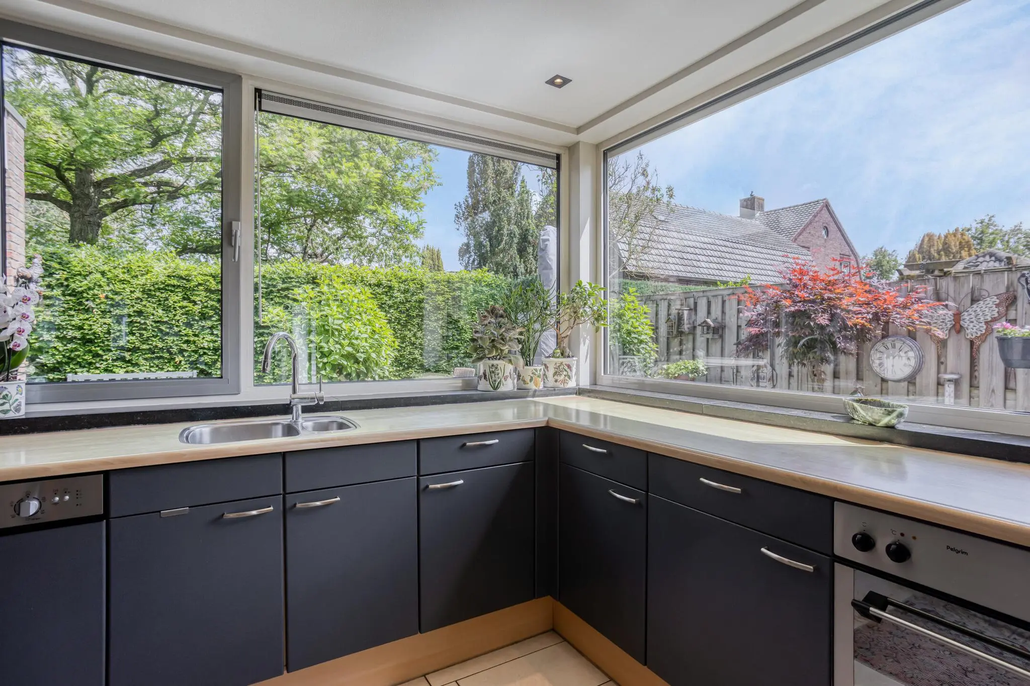 Royale leefkeuken aan de tuinzijde met modern werkblad, inbouwapparatuur en veel kastruimte