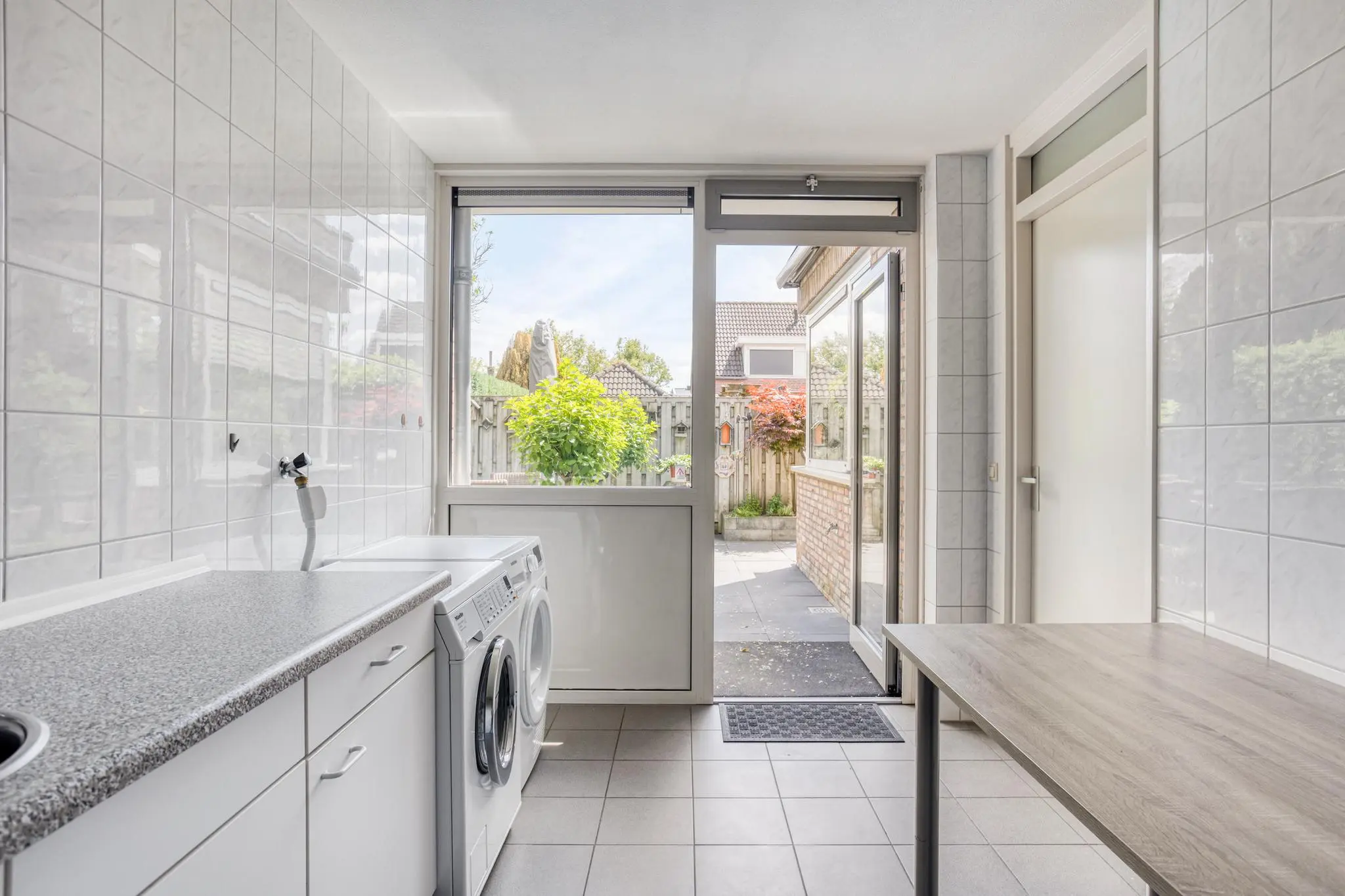 Bijkeuken met gootsteen en extra kast, toegang tot tuin en overkapping