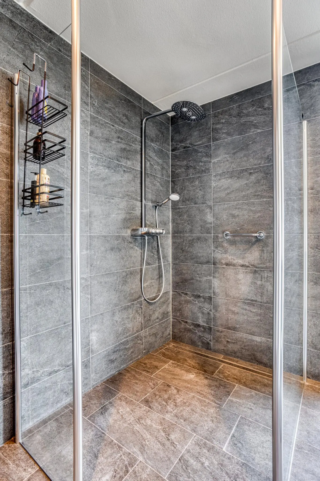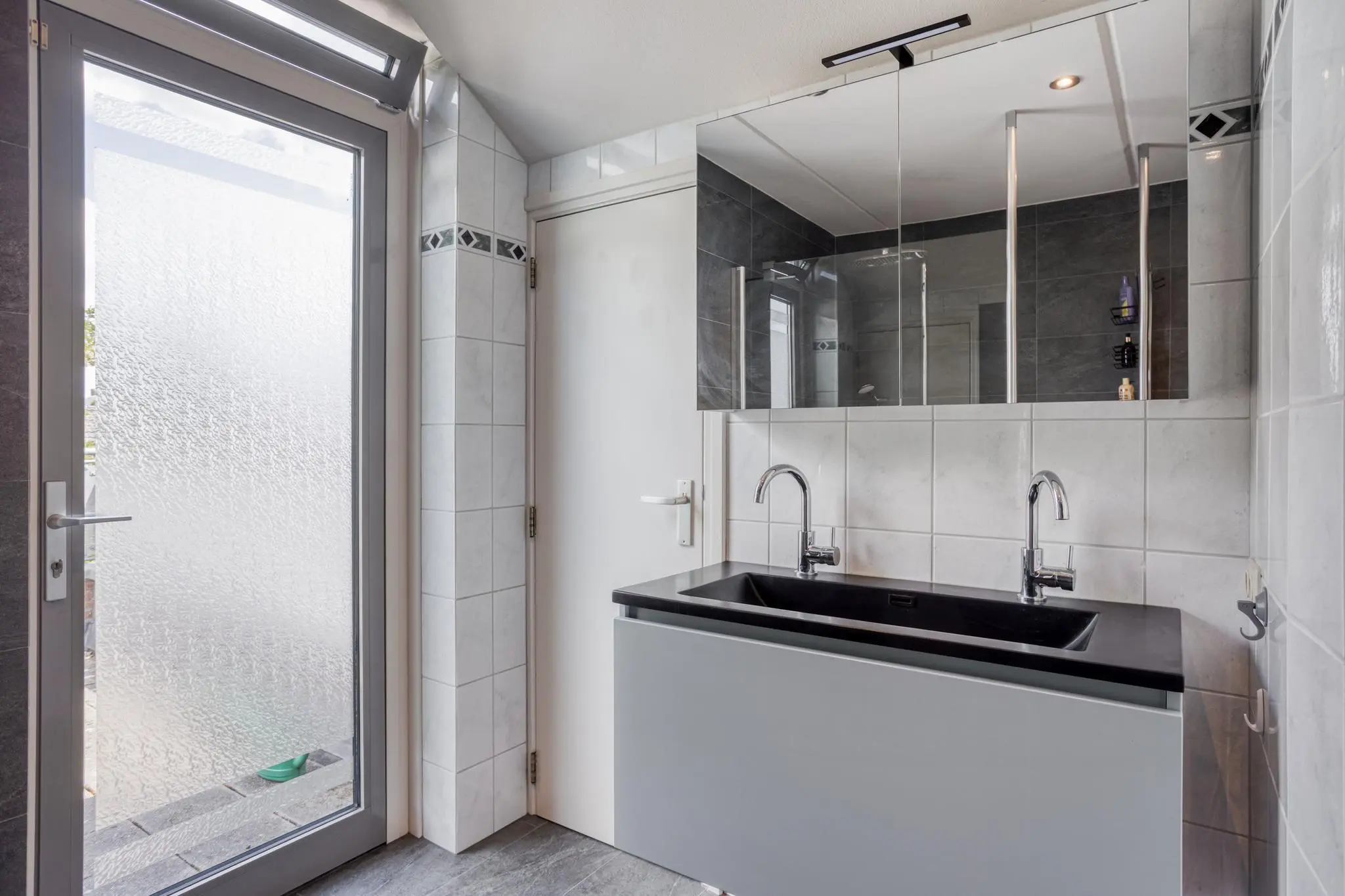 Volwaardige badkamer met douche, wastafel en bergruimte