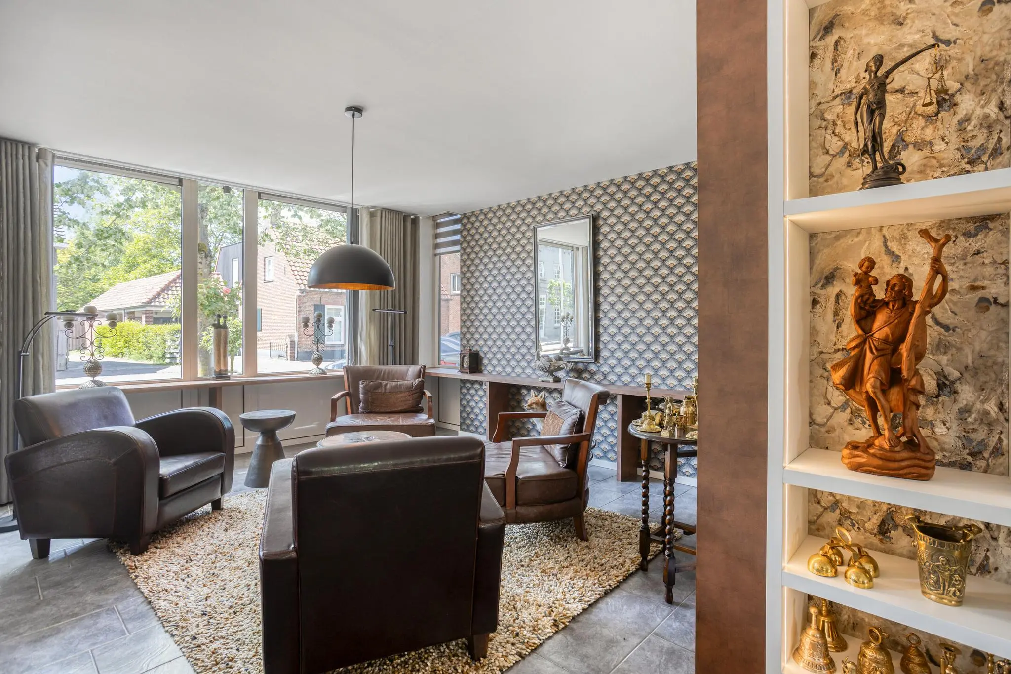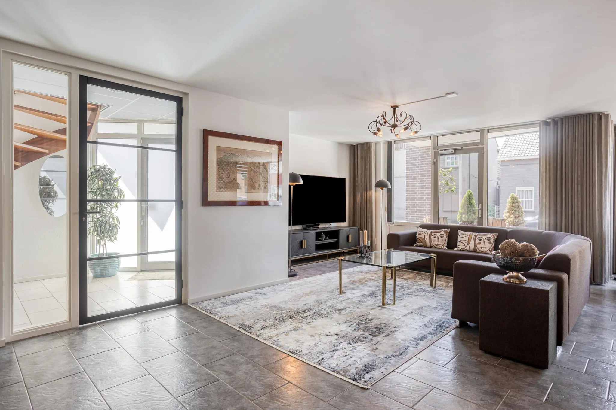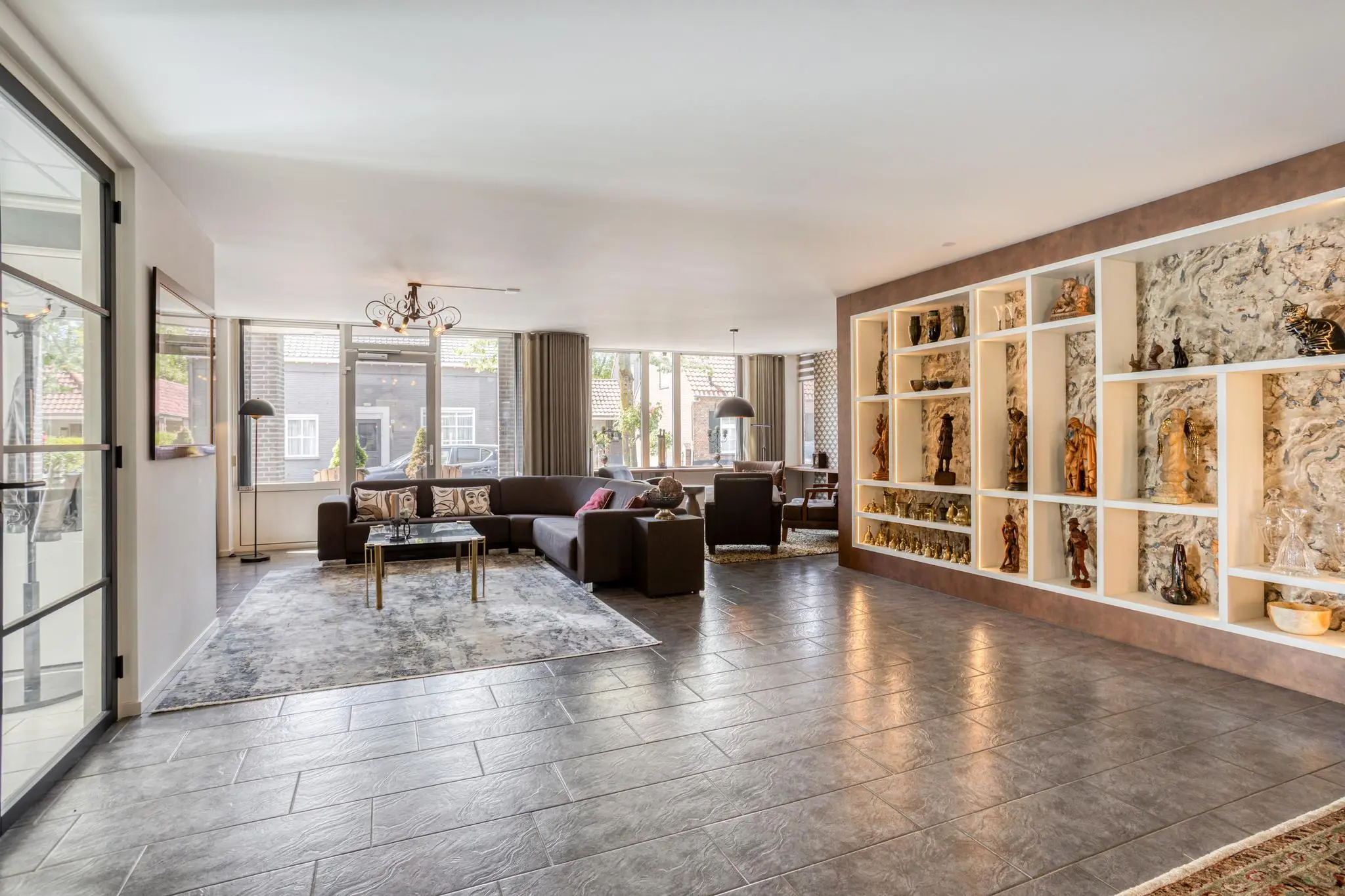 Woonkamer aan de voorzijde met grote raampartijen en een gezellige indeling