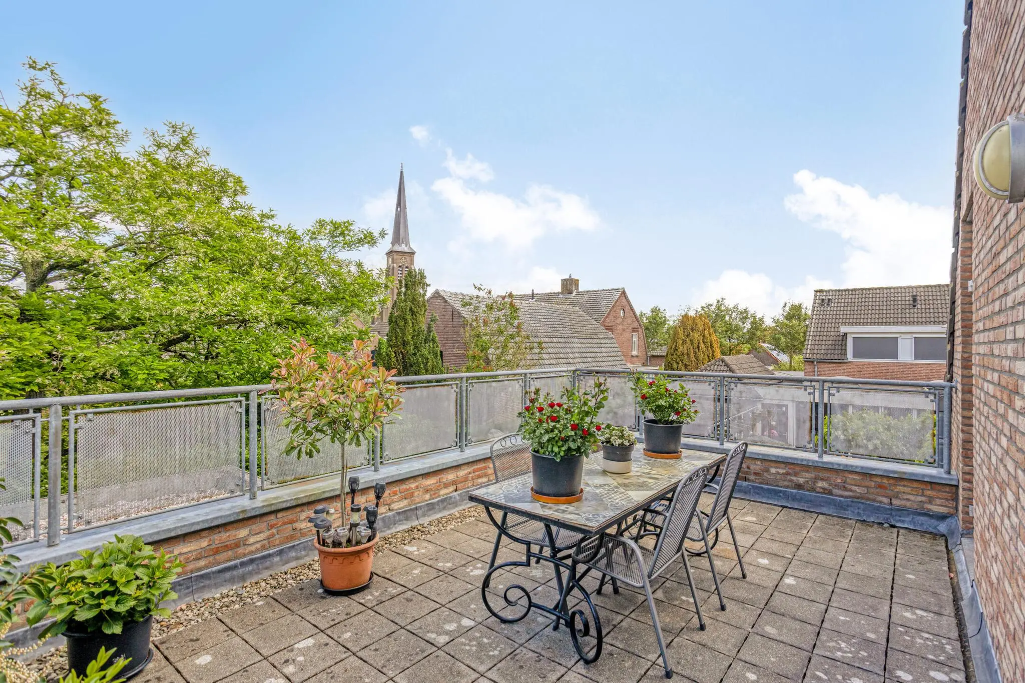 Dakterras aan de achterzijde, bereikbaar via dubbele deur vanuit de overloop – een heerlijke plek in de zon met veel privacy